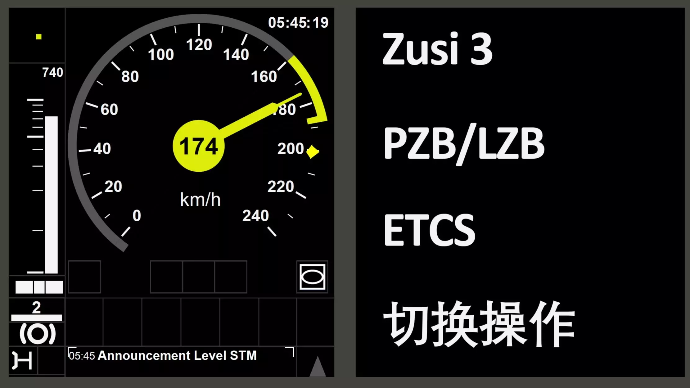 在Zusi 3中体验PZB/LZB与ETCS切换的操作 视频制作参考了英国大北方铁路去年在油管发布的ETCS教程系列,有能力的推荐去学习观看一下,讲的还是非常清楚的,视频链接在Reference中 站内曾经看到有人搬过,但找不到了┐(´д`)┌ *非专业操作,如有不妥欢迎在评论区文明讨论 游戏名:ZUSI 3 - Aerosoft Edition 时刻表:Timetables\Deutschland\Hamburg_Kassel\Lehrte-Veddel_FiktiverTakt_2018_04Uhr-14Uhr.fpn 车次:ICE 105 References: [1] Frank Wenzel. "ZSK3 - Die Zusi-Streckenkarte" zusi-sk.eu. https://www.zusi-sk.eu/ [2] OpenRailwayMap Contributers. https://www.openrailwaymap.org/ [3] Great Northern Rail, UK. Transitioning IN to ETCS (May 4, 2023). https://www.youtube.com/watch?v=CuvLhTnkVeo