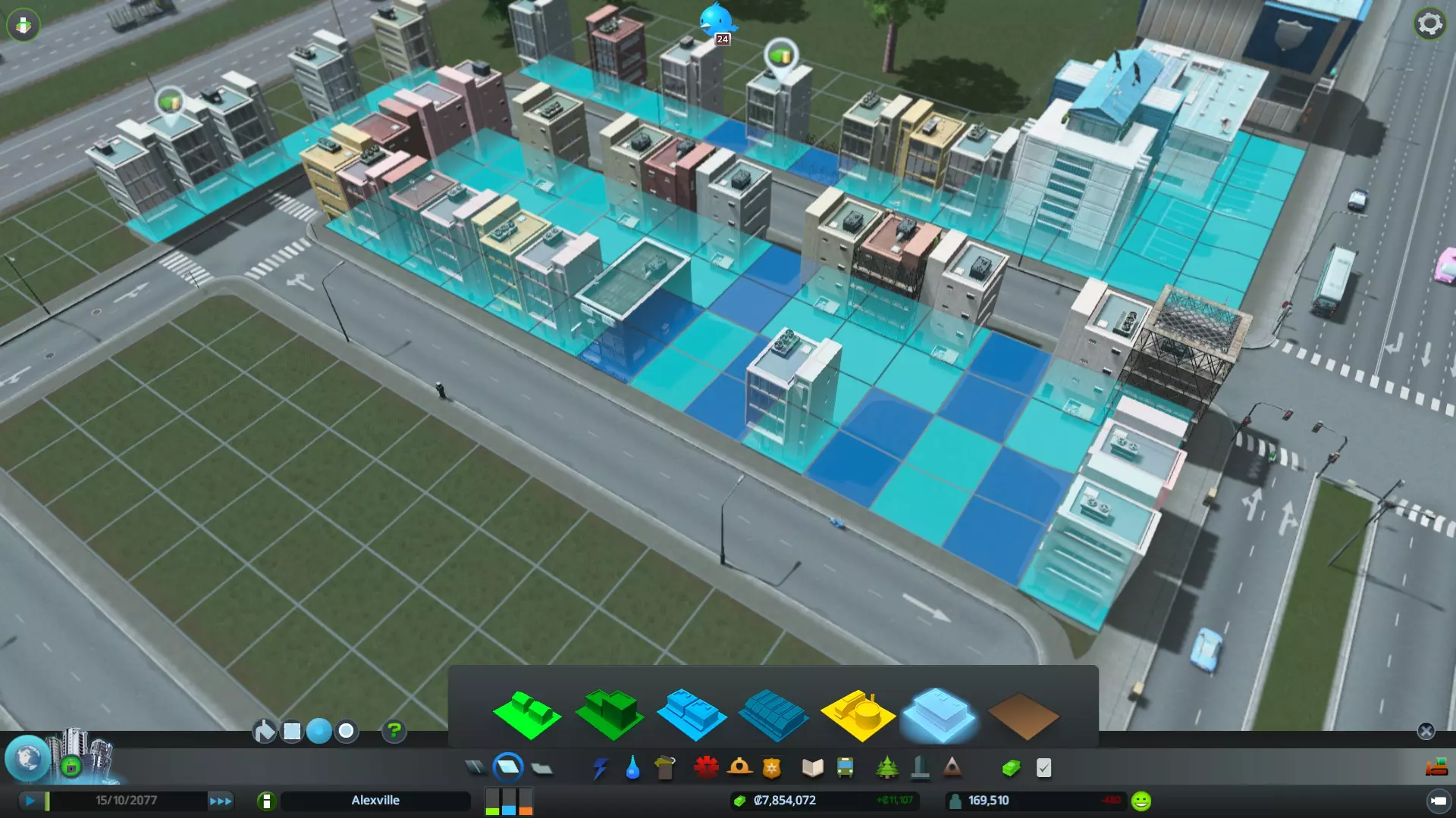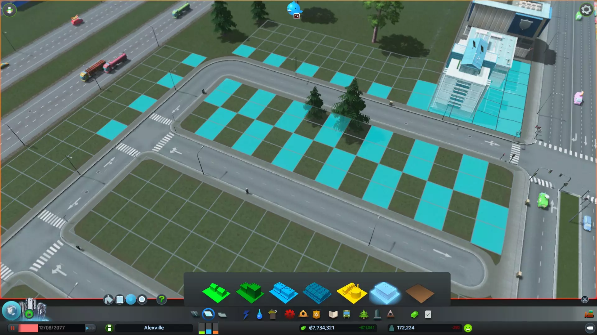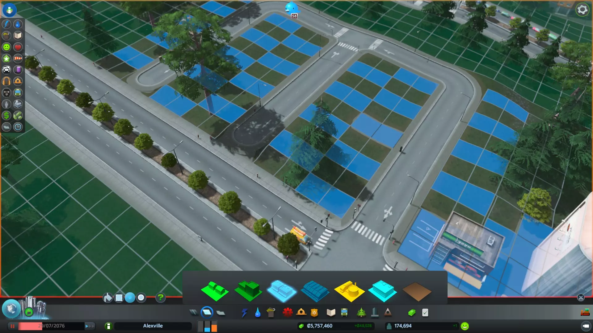 当所有区域都填满后,你就可以规划其余方块的分区了。使用大刷子工具是最简便的,因为你可以直接在整个区块上进行绘制。完成此操作后,其余的空白区域应该会开始填充。你也不限于使用1x1或1x2的尺寸,在这里右侧的主街道上,我就使用了2x2的区块来建造一些更大的房屋。