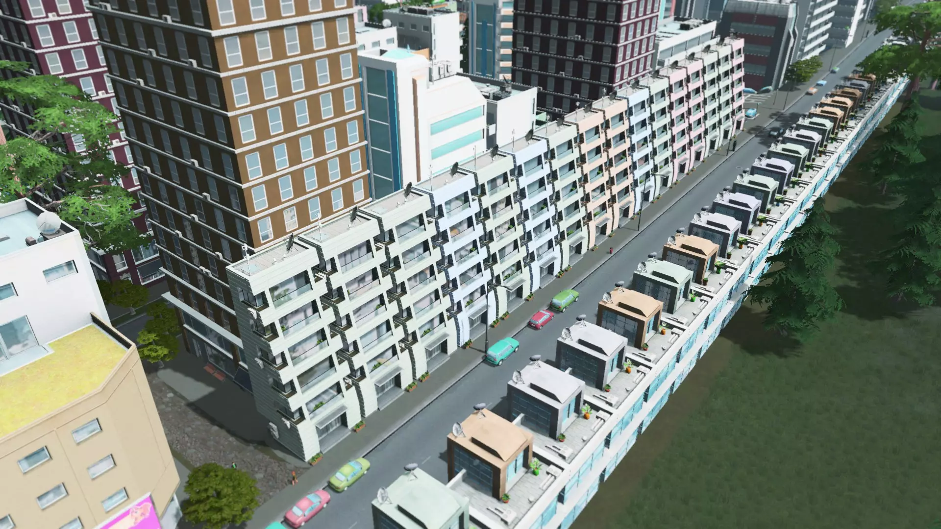 这样就完整了,一条布满小商店的漂亮小街,而不是如果我一次性填满整个街区可能会出现的那些大型商业建筑。在高密度住宅区的街区采用这种设计是个不错的主意,而且通过公园菜单中的路径连接街区两侧会是个很好的点缀。