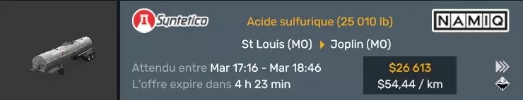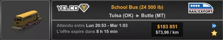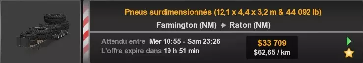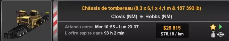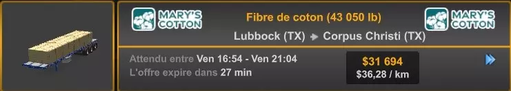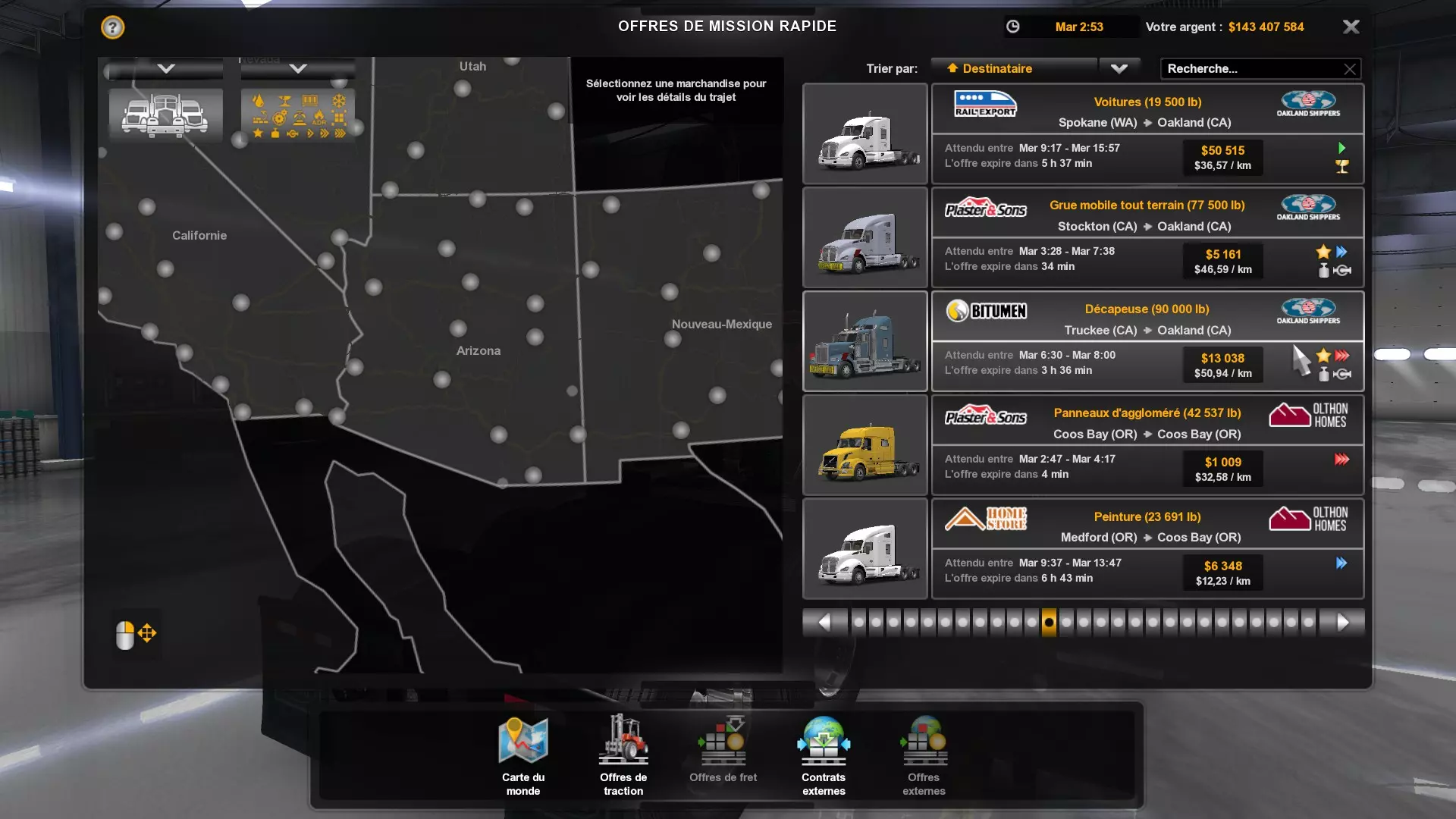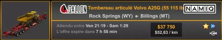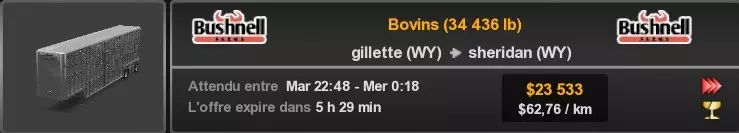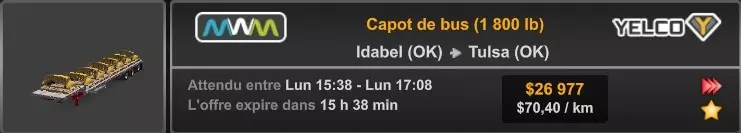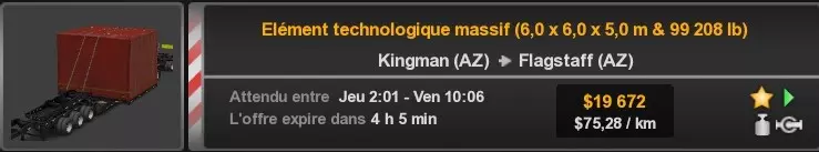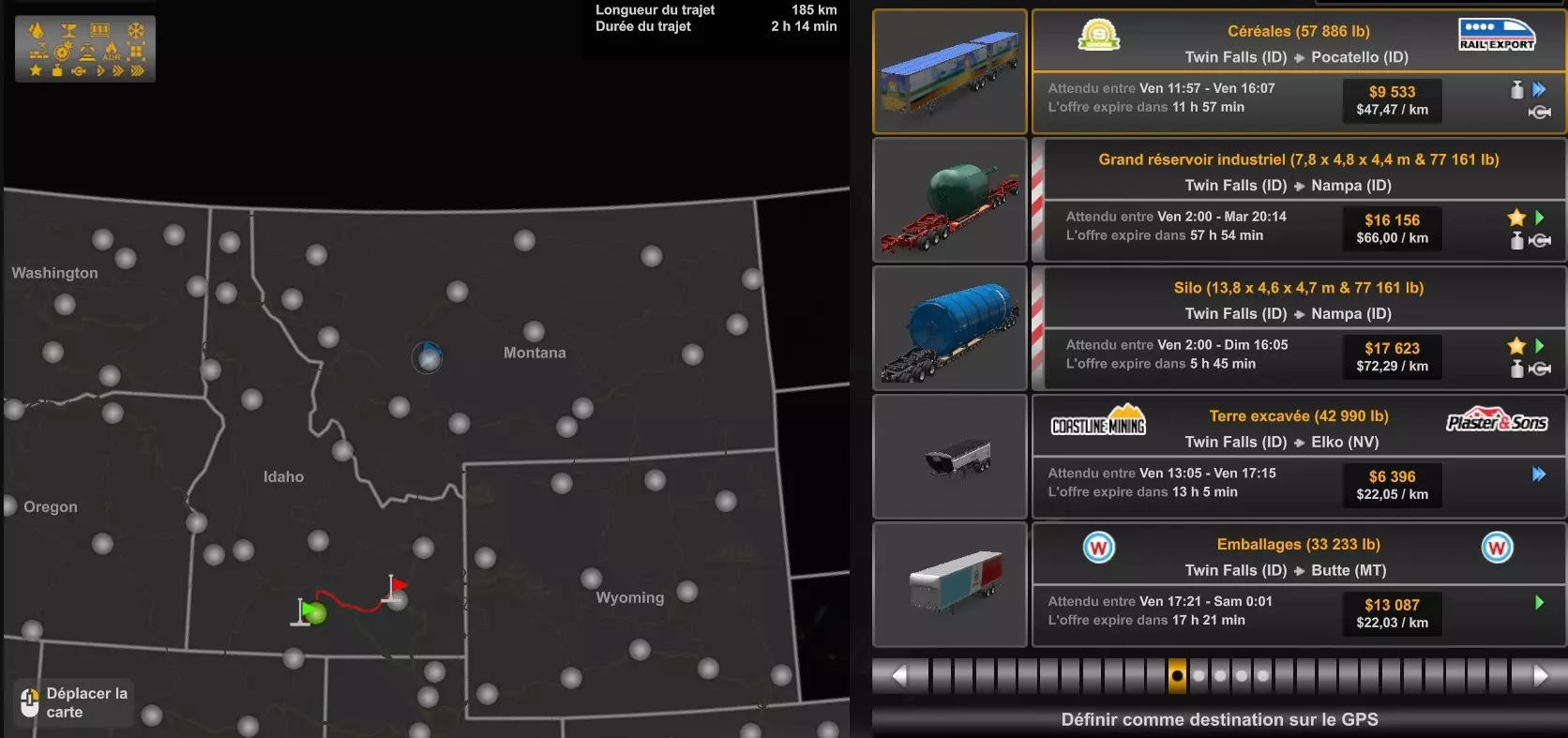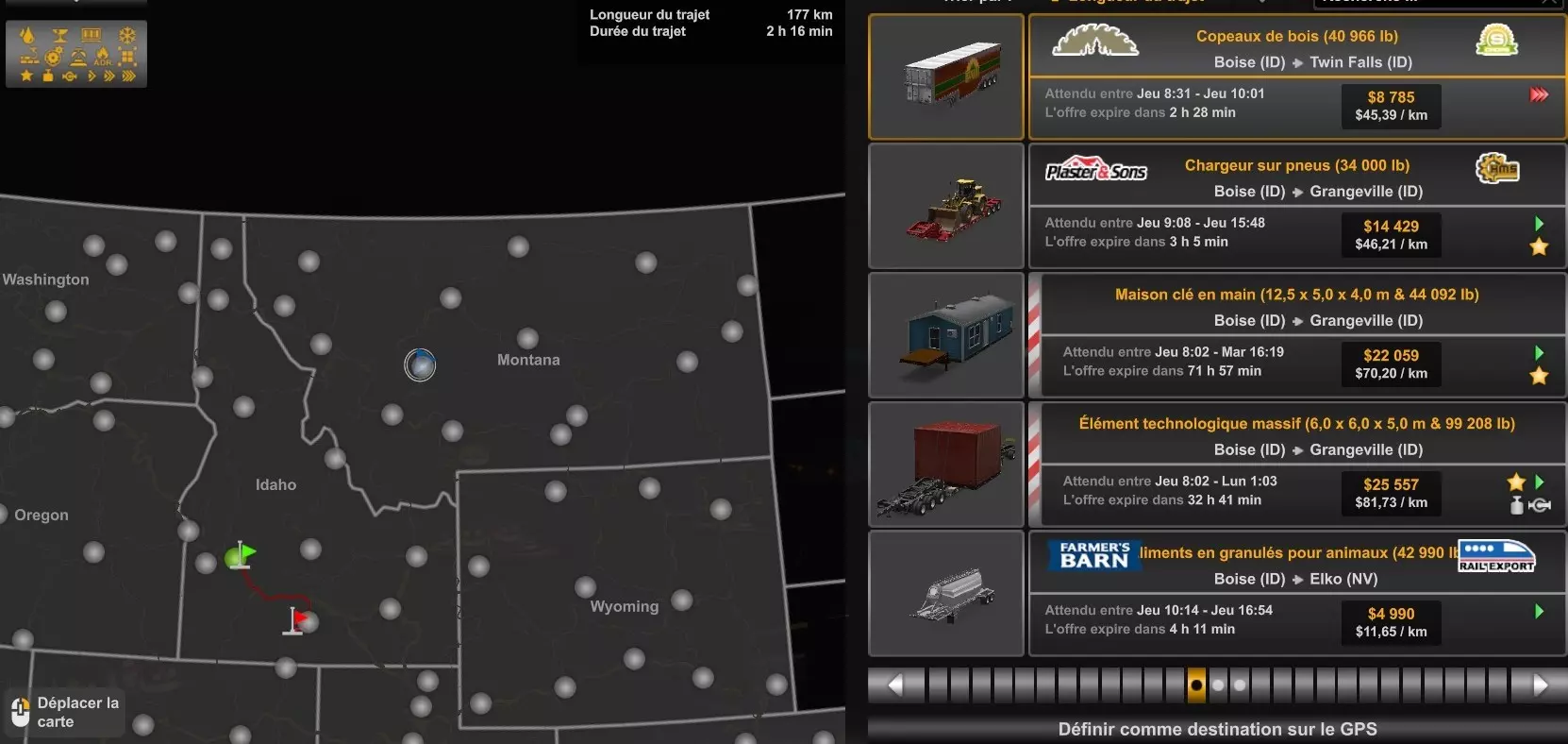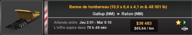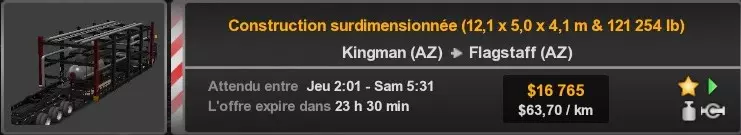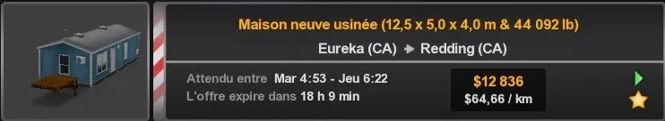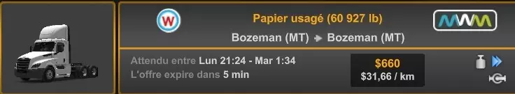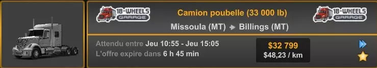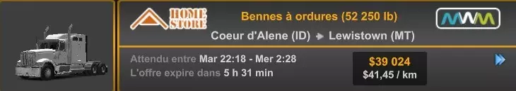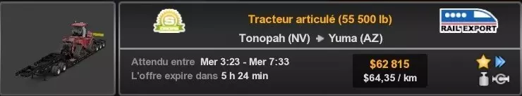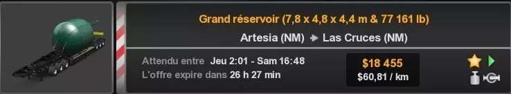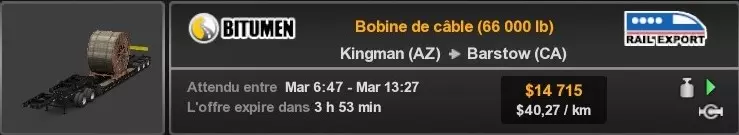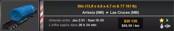 Arizona (AZ)Kingman (AZ) Flagstaff (AZ) 250 km Phoenix (AZ) Sierra Vista (AZ) 293 km Yuma (AZ) Tucson (AZ) 419 km Arkansas (AR)Jonesboro (AR) Hot Springs (AR) 356 km Little Rock (AR) El Dorado (AR) 250 km Little Rock (AR) Texarkana (AR) 344 km Californie (CA)Eureka (CA) Reeding (CA) 186 km Fresno (CA) Bakersfield (CA) 169km Oakland (CA) Huron (CA) 255 km Oakland (CA) Fresno (CA) 332 km Oxnard (CA) Barstow (CA) 298 km Sacramento (CA) Oakdale (CA) 336 km Santa Cruz (CA) Santa Maria (CA) 305 km Stockton (CA) San Francisco (CA) 228 km Stockton (CA) Huron (CA) 295 km Truckee (CA) Oakland () 312 km Truckee (CA) Carson City (NV) 222 km Colorado (CO)Burlington (CO) Lamar (CO) 205 km Denver (CO) Colorado Springs (CO) 206 km Denver (CO) Grand Junction (CO) 467 km Pueblo (CO) Denver (CO) 397 km Pueblo (CO) Marysville (KS) 1139 km Pueblo (CO) Dodge City (KS) 504 km Pueblo (CO) Pueblo (CO) 147 km Sterling (CO) Colorado Springs (CO) 310 km Idaho (ID)Boise (ID) Grangeville (ID) 303 km Idaho Falls (ID) Salmon (ID) 234 km Lewiston (ID) Sandpoint (ID) 277 km Twin Falls (ID) Nampa (ID) 233 km Iowa (IA)Burlington (IA) Iowa City (IA) 156 km Dubuque (IA) Mason City (IA) 395 km Sioux City (IA) Des Moines (IA) 314 km Kansas (KS)Colby (KS) Hutchinson (KS) 418 km Dodge City (KS) Emporia (KS) 345 km Topeka (KS) Pittsburg (KS) 226 km Wichita (KS) Salina (KS) 147 km Louisiane (LA)Houma (LA) Port Fourchon (LA) 121 km Nouvelle-Orléans (LA) Lafayette (LA) 289 km Lake Charles (LA) Natchitoches (LA) 264 km Shreveport (LA) Baton-Rouge (LA) 349 km Missouri (MO)Cap-Girardeau (MO) Springfield (MO) 425 km Kansas City (MO) Rolla (MO) 452 km St Louis (MO) Kirksville (MO) 430 km Montana (MT)Butte (MT) Bozeman (MT) 389 km Havre (MT) Lewistown (MT) 374 km Laurel (MT) Glendive (MT) 395 km Laurel (MT) Billing (MT) 178 km Thompson Falls (MT) Kalispell (MT) 306 km Nevada (NV)Primm (NV) Ely (NV) 520 km Winnemucca (NV) to Carson City (NV) 418 km Nouveau-Mexique (NM)Artesia (NM) Las Cruces (NM) 290 km Clovis(NM) Hobbs (NM) 333 km Farmington (NM) Raton (NM) 525 km Gallup (NM) Raton (NM) 574 km Santa Fe (NM) Socorro (NM) 215 km Socorro (NM) Tucson (AZ) 659 km Oklahoma (OK) Clinton (OK) Guymon (OK) 246 km Lawton (OK) McAlester (OK) 294 km Oklahoma City (OK) Tulsa (OK) 264 km Oregon (OR)Pendleton (OR) Burns (OR) 318 km Portland (OR) Newport (OR) 294 km The Dalles (OR) Salem (OR) 292 km Texas (TX)Corpus Christi (TX) Brownsville (TX) 451 km Del Rio (TX) Van Horn (TX) 516 km Fort Stockton (TX) Abilene (TX) 369 km Laredo (TX) San Antonio (TX) 345 km Longview (TX) Galveston (TX) 521 km Lubbock (TX) Odessa (TX) 312 km San Angelo (TX) Dallas (TX) 446 km Wichita Falls (TX) Amarillo (TX) 392 km Utah (UT)Provo (UT) Price (UT) 184 km Salina (UT) Cedar City (UT) 203 km Vernal (UT) Salt Lake City (UT) 367 km Washington (WA)Omak (WA) Yakima (WA) 358 km Port Angeles (WA) Aberdeen (WA) 190 km Seattle (WA) Everett (WA) 78 km Spokane (WA) Grand Coulee (WA) 210 km Wyoming (WY)Casper (WY) Gilette (WY) 206 km Cheyenne (WY) Rock Springs (WY) 400 km Laramie (WY) Rawlins (WY) 136 km Riverton (WY) Jackson (WY) 331 km 6 - Votre tombereau est arrivé !