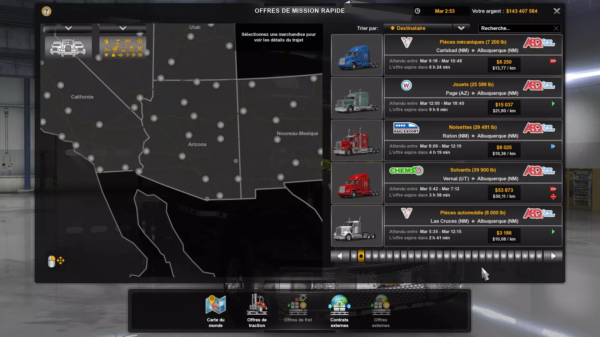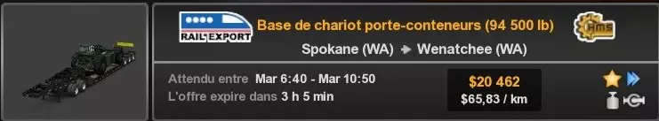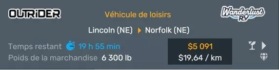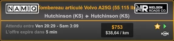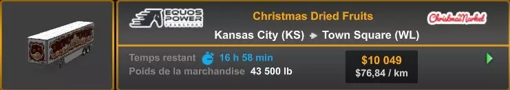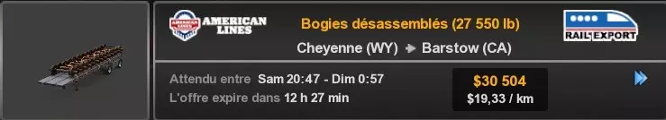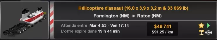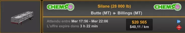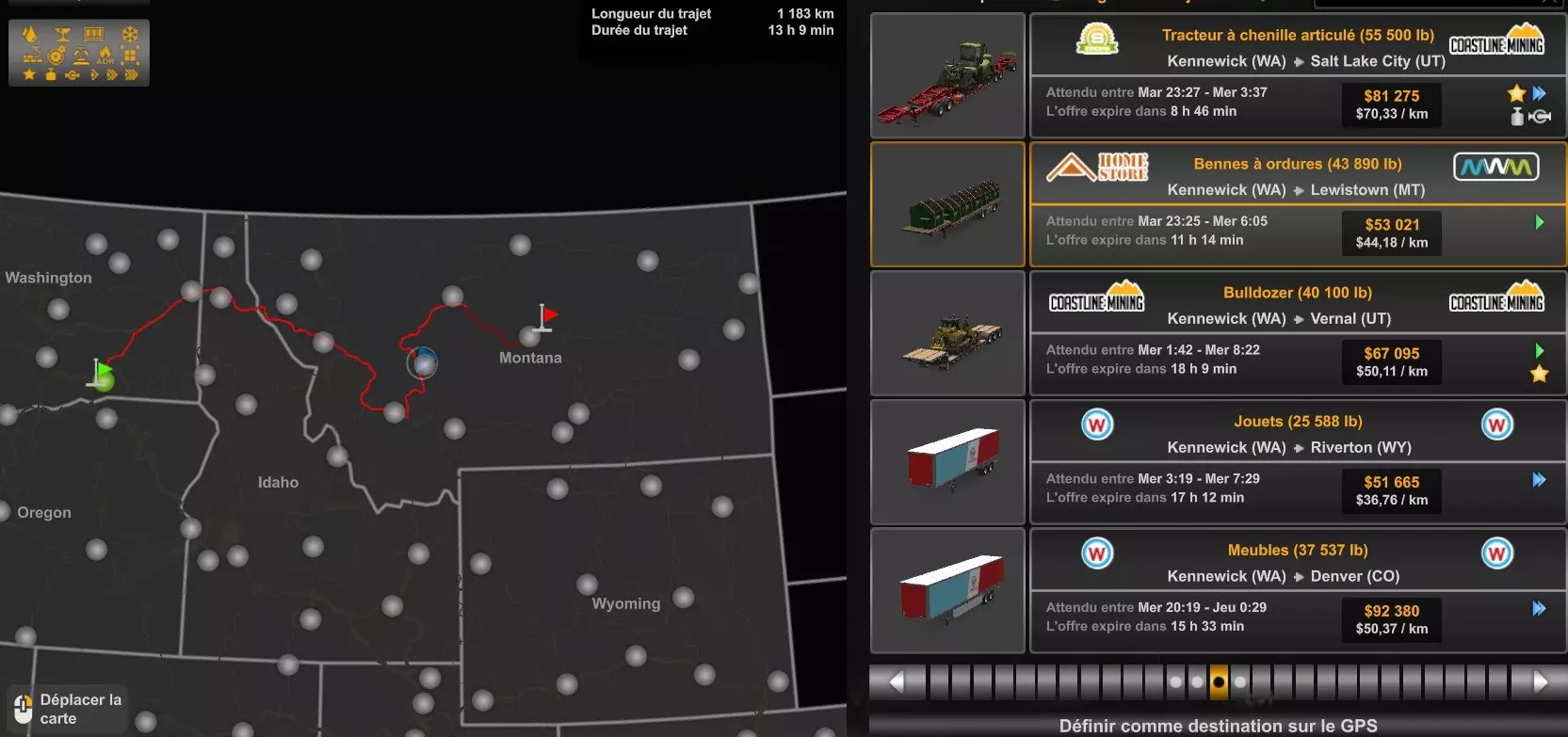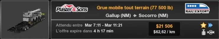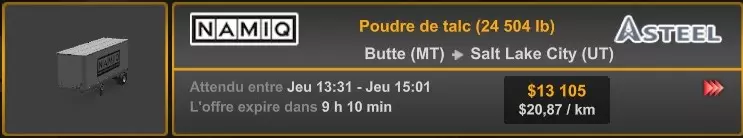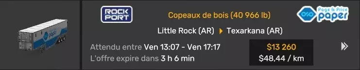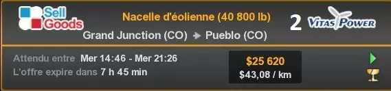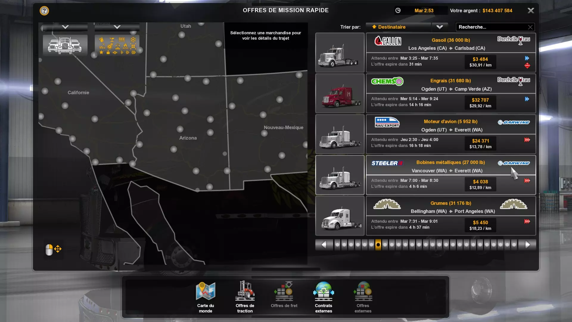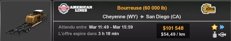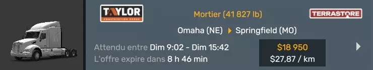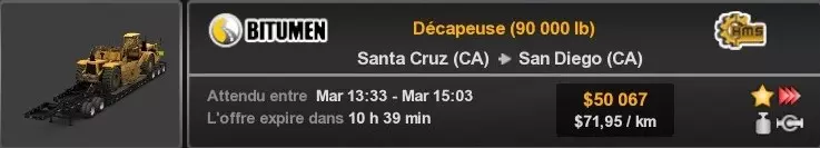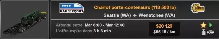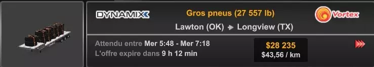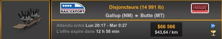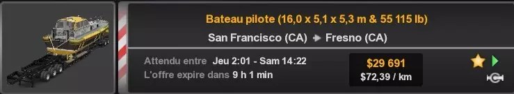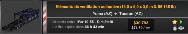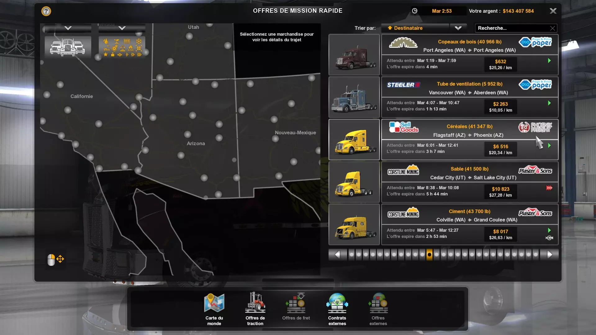 Arizona (AZ)Kingman (AZ) Flagstaff (AZ) 250 km Phoenix (AZ) Sierra Vista (AZ) 293 km Yuma (AZ) Tucson (AZ) 419 km Arkansas (AR)Jonesboro (AR) Hot Springs (AR) 356 km Little Rock (AR) El Dorado (AR) 250 km Little Rock (AR) Texarkana (AR) 344 km Californie (CA)Eureka (CA) Reeding (CA) 186 km Fresno (CA) Bakersfield (CA) 169km Oakland (CA) Huron (CA) 255 km Oakland (CA) Fresno (CA) 332 km Oxnard (CA) Barstow (CA) 298 km Sacramento (CA) Oakdale (CA) 336 km Santa Cruz (CA) Santa Maria (CA) 305 km Stockton (CA) San Francisco (CA) 228 km Stockton (CA) Huron (CA) 295 km Truckee (CA) Oakland () 312 km Truckee (CA) Carson City (NV) 222 km Colorado (CO)Burlington (CO) Lamar (CO) 205 km Denver (CO) Colorado Springs (CO) 206 km Denver (CO) Grand Junction (CO) 467 km Pueblo (CO) Denver (CO) 397 km Pueblo (CO) Marysville (KS) 1139 km Pueblo (CO) Dodge City (KS) 504 km Pueblo (CO) Pueblo (CO) 147 km Sterling (CO) Colorado Springs (CO) 310 km Idaho (ID)Boise (ID) Grangeville (ID) 303 km Idaho Falls (ID) Salmon (ID) 234 km Lewiston (ID) Sandpoint (ID) 277 km Twin Falls (ID) Nampa (ID) 233 km Iowa (IA)Burlington (IA) Iowa City (IA) 156 km Dubuque (IA) Mason City (IA) 395 km Sioux City (IA) Des Moines (IA) 314 km Kansas (KS)Colby (KS) Hutchinson (KS) 418 km Dodge City (KS) Emporia (KS) 345 km Topeka (KS) Pittsburg (KS) 226 km Wichita (KS) Salina (KS) 147 km Louisiane (LA)Houma (LA) Port Fourchon (LA) 121 km Nouvelle-Orléans (LA) Lafayette (LA) 289 km Lake Charles (LA) Natchitoches (LA) 264 km Shreveport (LA) Baton-Rouge (LA) 349 km Missouri (MO)Cap-Girardeau (MO) Springfield (MO) 425 km Kansas City (MO) Rolla (MO) 452 km St Louis (MO) Kirksville (MO) 430 km Montana (MT)Butte (MT) Bozeman (MT) 389 km Havre (MT) Lewistown (MT) 374 km Laurel (MT) Glendive (MT) 395 km Laurel (MT) Billing (MT) 178 km Thompson Falls (MT) Kalispell (MT) 306 km Nevada (NV)Primm (NV) Ely (NV) 520 km Winnemucca (NV) to Carson City (NV) 418 km Nouveau-Mexique (NM)Artesia (NM) Las Cruces (NM) 290 km Clovis(NM) Hobbs (NM) 333 km Farmington (NM) Raton (NM) 525 km Gallup (NM) Raton (NM) 574 km Santa Fe (NM) Socorro (NM) 215 km Socorro (NM) Tucson (AZ) 659 km Oklahoma (OK) Clinton (OK) Guymon (OK) 246 km Lawton (OK) McAlester (OK) 294 km Oklahoma City (OK) Tulsa (OK) 264 km Oregon (OR)Pendleton (OR) Burns (OR) 318 km Portland (OR) Newport (OR) 294 km The Dalles (OR) Salem (OR) 292 km Texas (TX)Corpus Christi (TX) Brownsville (TX) 451 km Del Rio (TX) Van Horn (TX) 516 km Fort Stockton (TX) Abilene (TX) 369 km Laredo (TX) San Antonio (TX) 345 km Longview (TX) Galveston (TX) 521 km Lubbock (TX) Odessa (TX) 312 km San Angelo (TX) Dallas (TX) 446 km Wichita Falls (TX) Amarillo (TX) 392 km Utah (UT)Provo (UT) Price (UT) 184 km Salina (UT) Cedar City (UT) 203 km Vernal (UT) Salt Lake City (UT) 367 km Washington (WA)Omak (WA) Yakima (WA) 358 km Port Angeles (WA) Aberdeen (WA) 190 km Seattle (WA) Everett (WA) 78 km Spokane (WA) Grand Coulee (WA) 210 km Wyoming (WY)Casper (WY) Gilette (WY) 206 km Cheyenne (WY) Rock Springs (WY) 400 km Laramie (WY) Rawlins (WY) 136 km Riverton (WY) Jackson (WY) 331 km 6 - Votre tombereau est arrivé !