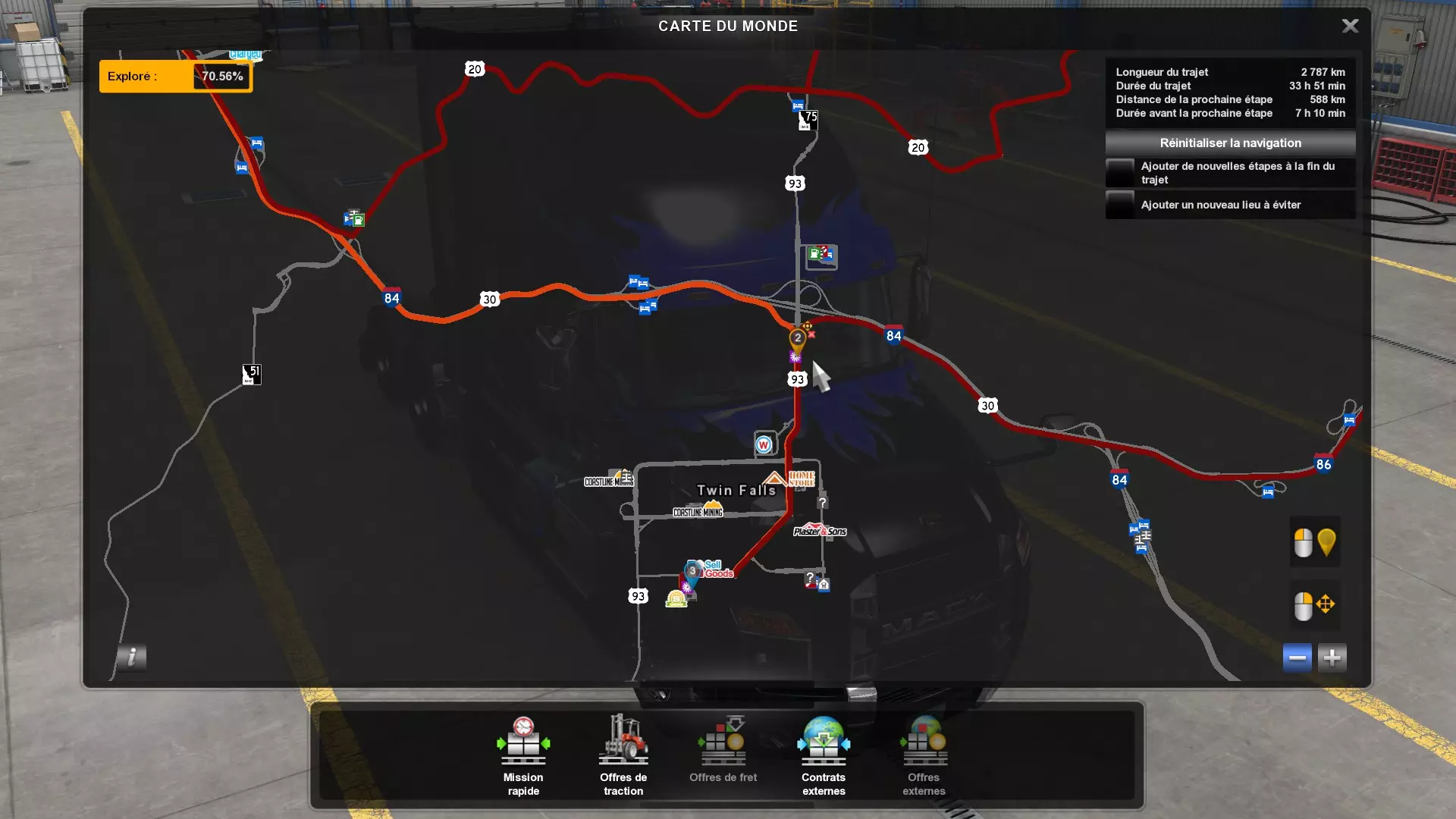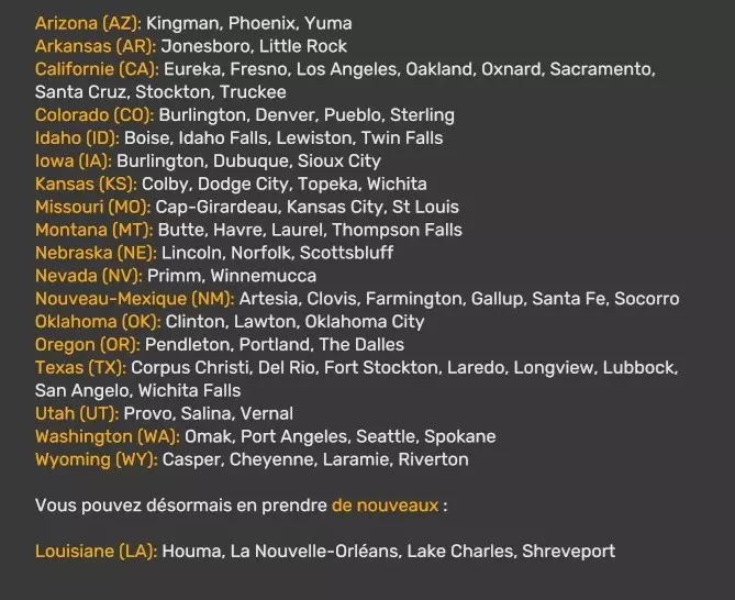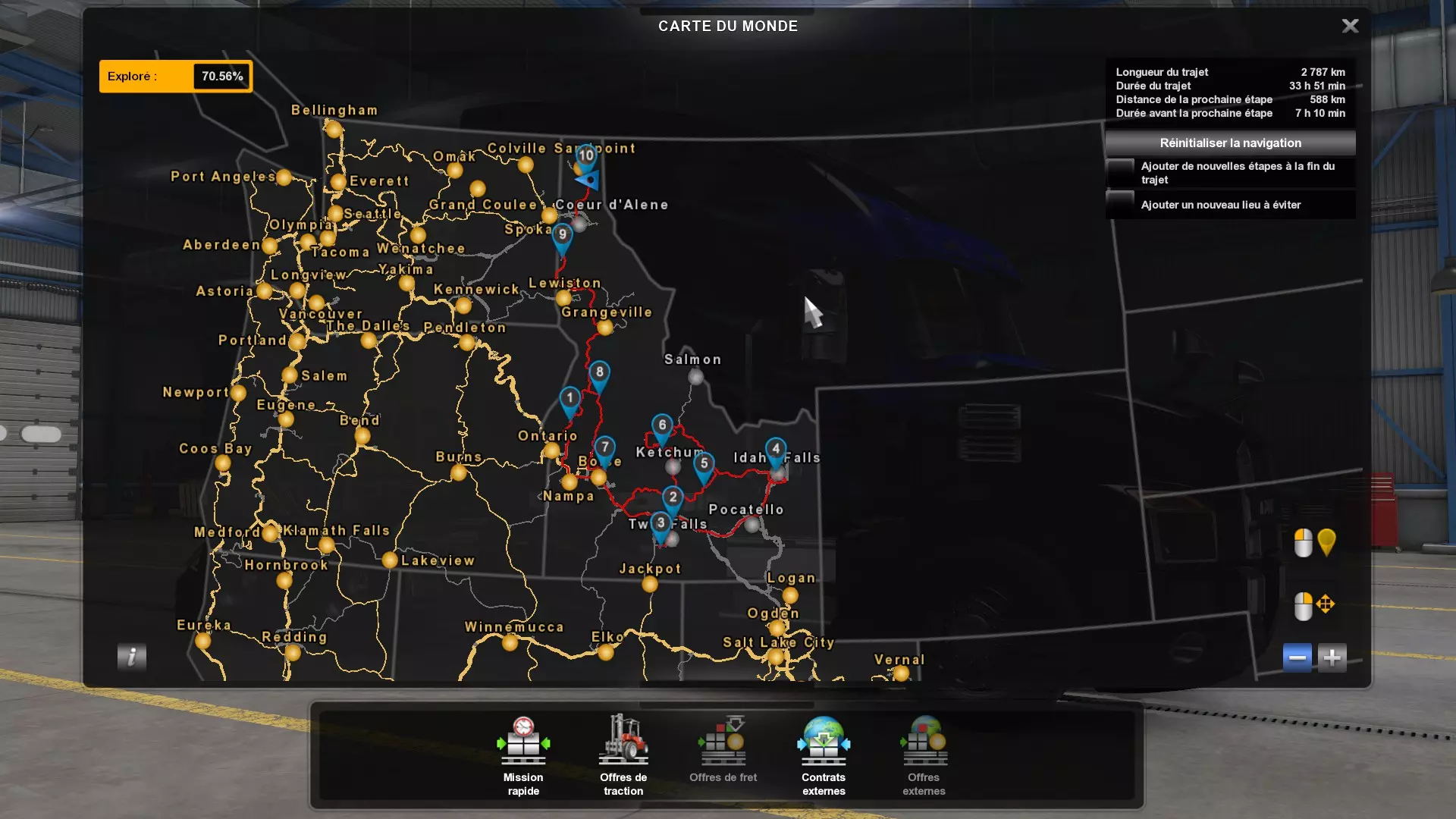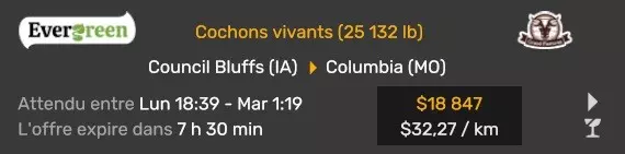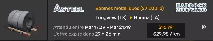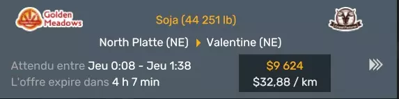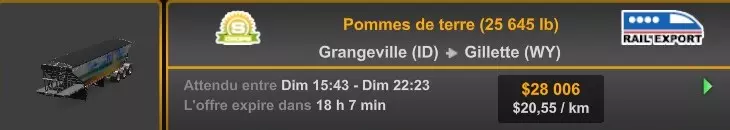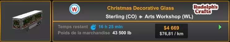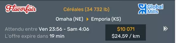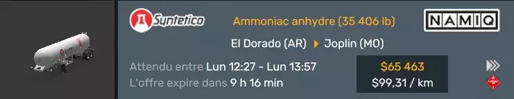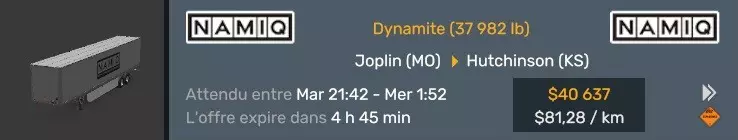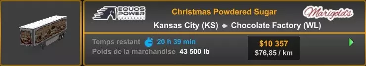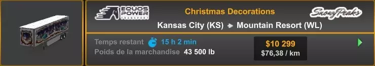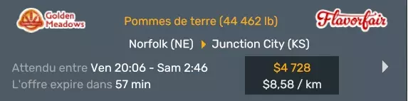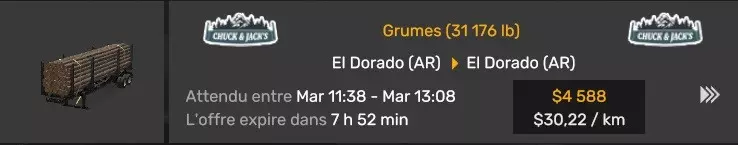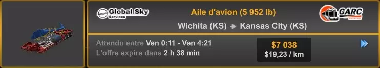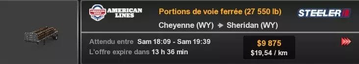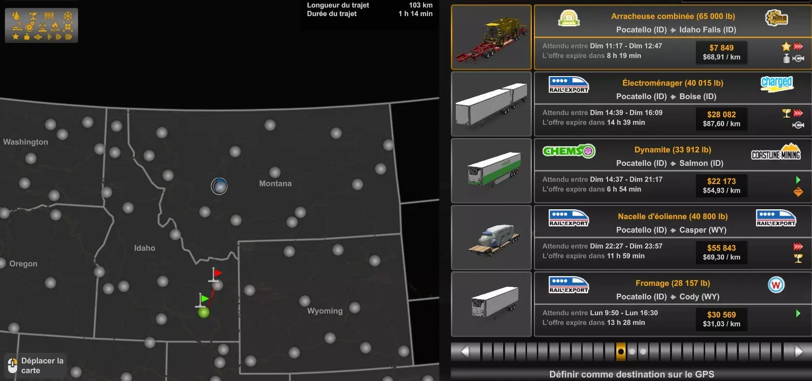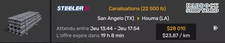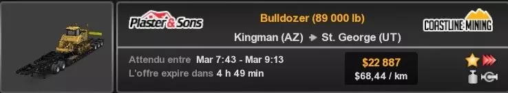 Arizona (AZ)Kingman (AZ) Flagstaff (AZ) 250 km Phoenix (AZ) Sierra Vista (AZ) 293 km Yuma (AZ) Tucson (AZ) 419 km Arkansas (AR)Jonesboro (AR) Hot Springs (AR) 356 km Little Rock (AR) El Dorado (AR) 250 km Little Rock (AR) Texarkana (AR) 344 km Californie (CA)Eureka (CA) Reeding (CA) 186 km Fresno (CA) Bakersfield (CA) 169km Oakland (CA) Huron (CA) 255 km Oakland (CA) Fresno (CA) 332 km Oxnard (CA) Barstow (CA) 298 km Sacramento (CA) Oakdale (CA) 336 km Santa Cruz (CA) Santa Maria (CA) 305 km Stockton (CA) San Francisco (CA) 228 km Stockton (CA) Huron (CA) 295 km Truckee (CA) Oakland () 312 km Truckee (CA) Carson City (NV) 222 km Colorado (CO)Burlington (CO) Lamar (CO) 205 km Denver (CO) Colorado Springs (CO) 206 km Denver (CO) Grand Junction (CO) 467 km Pueblo (CO) Denver (CO) 397 km Pueblo (CO) Marysville (KS) 1139 km Pueblo (CO) Dodge City (KS) 504 km Pueblo (CO) Pueblo (CO) 147 km Sterling (CO) Colorado Springs (CO) 310 km Idaho (ID)Boise (ID) Grangeville (ID) 303 km Idaho Falls (ID) Salmon (ID) 234 km Lewiston (ID) Sandpoint (ID) 277 km Twin Falls (ID) Nampa (ID) 233 km Iowa (IA)Burlington (IA) Iowa City (IA) 156 km Dubuque (IA) Mason City (IA) 395 km Sioux City (IA) Des Moines (IA) 314 km Kansas (KS)Colby (KS) Hutchinson (KS) 418 km Dodge City (KS) Emporia (KS) 345 km Topeka (KS) Pittsburg (KS) 226 km Wichita (KS) Salina (KS) 147 km Louisiane (LA)Houma (LA) Port Fourchon (LA) 121 km Nouvelle-Orléans (LA) Lafayette (LA) 289 km Lake Charles (LA) Natchitoches (LA) 264 km Shreveport (LA) Baton-Rouge (LA) 349 km Missouri (MO)Cap-Girardeau (MO) Springfield (MO) 425 km Kansas City (MO) Rolla (MO) 452 km St Louis (MO) Kirksville (MO) 430 km Montana (MT)Butte (MT) Bozeman (MT) 389 km Havre (MT) Lewistown (MT) 374 km Laurel (MT) Glendive (MT) 395 km Laurel (MT) Billing (MT) 178 km Thompson Falls (MT) Kalispell (MT) 306 km Nevada (NV)Primm (NV) Ely (NV) 520 km Winnemucca (NV) to Carson City (NV) 418 km Nouveau-Mexique (NM)Artesia (NM) Las Cruces (NM) 290 km Clovis(NM) Hobbs (NM) 333 km Farmington (NM) Raton (NM) 525 km Gallup (NM) Raton (NM) 574 km Santa Fe (NM) Socorro (NM) 215 km Socorro (NM) Tucson (AZ) 659 km Oklahoma (OK) Clinton (OK) Guymon (OK) 246 km Lawton (OK) McAlester (OK) 294 km Oklahoma City (OK) Tulsa (OK) 264 km Oregon (OR)Pendleton (OR) Burns (OR) 318 km Portland (OR) Newport (OR) 294 km The Dalles (OR) Salem (OR) 292 km Texas (TX)Corpus Christi (TX) Brownsville (TX) 451 km Del Rio (TX) Van Horn (TX) 516 km Fort Stockton (TX) Abilene (TX) 369 km Laredo (TX) San Antonio (TX) 345 km Longview (TX) Galveston (TX) 521 km Lubbock (TX) Odessa (TX) 312 km San Angelo (TX) Dallas (TX) 446 km Wichita Falls (TX) Amarillo (TX) 392 km Utah (UT)Provo (UT) Price (UT) 184 km Salina (UT) Cedar City (UT) 203 km Vernal (UT) Salt Lake City (UT) 367 km Washington (WA)Omak (WA) Yakima (WA) 358 km Port Angeles (WA) Aberdeen (WA) 190 km Seattle (WA) Everett (WA) 78 km Spokane (WA) Grand Coulee (WA) 210 km Wyoming (WY)Casper (WY) Gilette (WY) 206 km Cheyenne (WY) Rock Springs (WY) 400 km Laramie (WY) Rawlins (WY) 136 km Riverton (WY) Jackson (WY) 331 km 6 - Votre tombereau est arrivé !