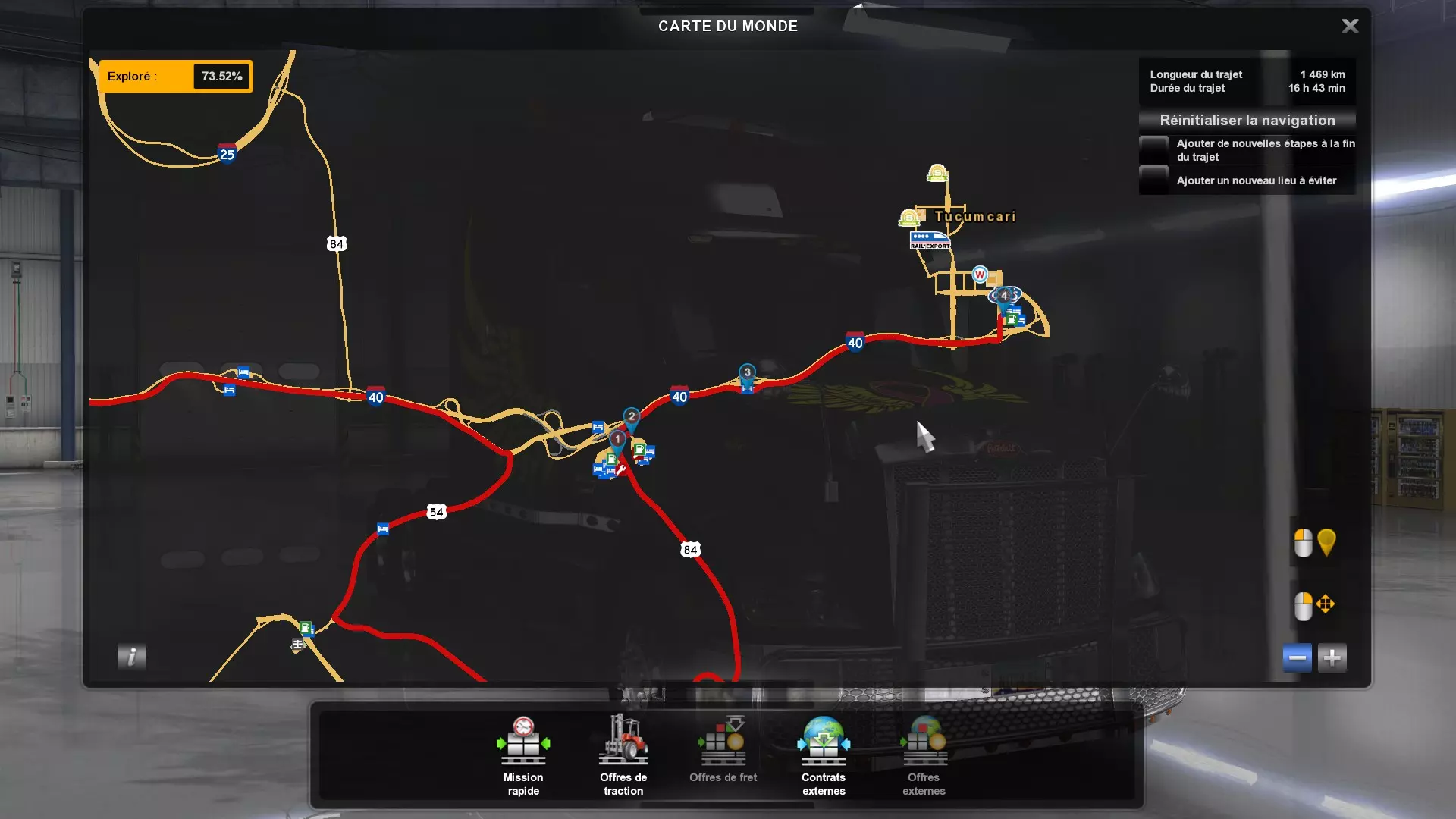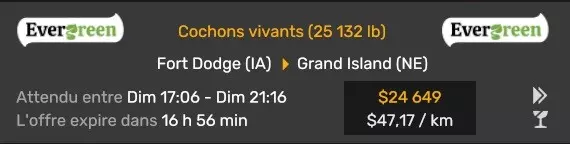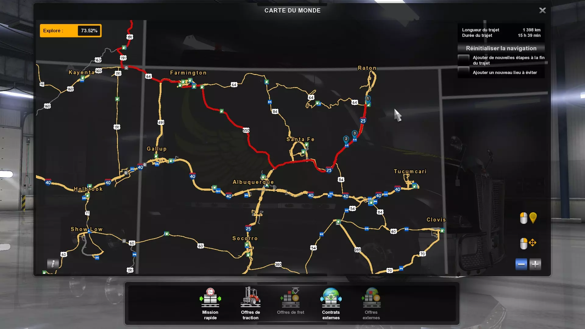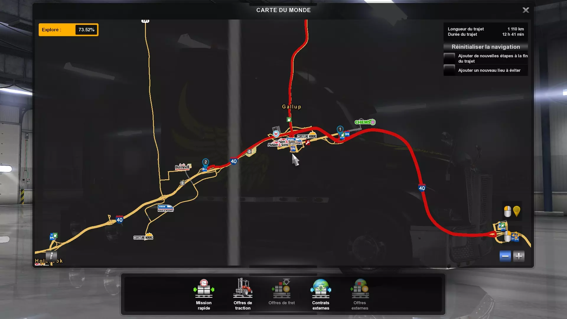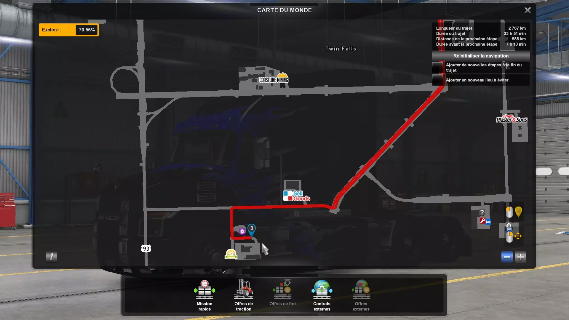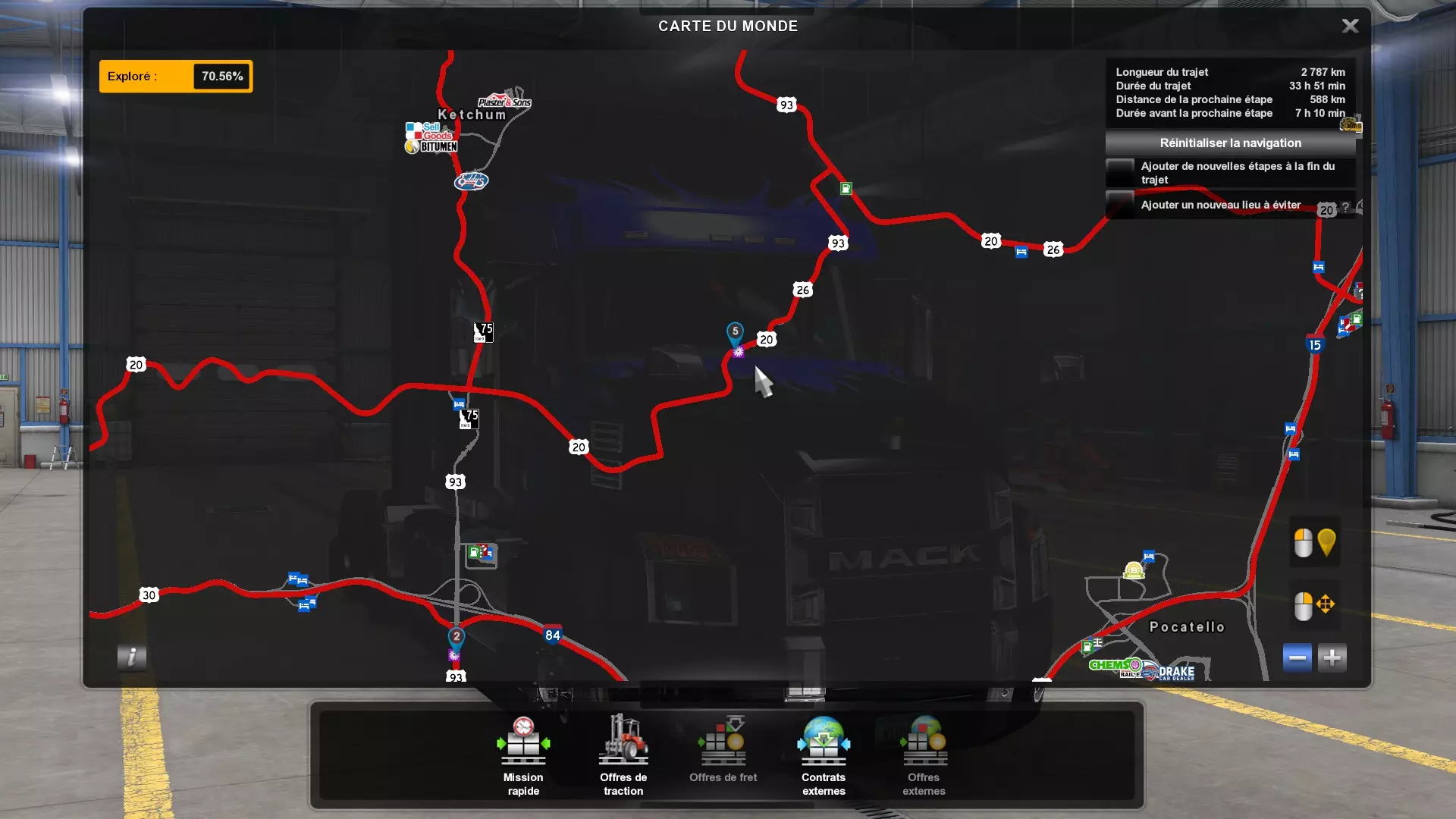 Arizona (AZ)Kingman (AZ) Flagstaff (AZ) 250 km Phoenix (AZ) Sierra Vista (AZ) 293 km Yuma (AZ) Tucson (AZ) 419 km Arkansas (AR)Jonesboro (AR) Hot Springs (AR) 356 km Little Rock (AR) El Dorado (AR) 250 km Little Rock (AR) Texarkana (AR) 344 km Californie (CA)Eureka (CA) Reeding (CA) 186 km Fresno (CA) Bakersfield (CA) 169km Oakland (CA) Huron (CA) 255 km Oakland (CA) Fresno (CA) 332 km Oxnard (CA) Barstow (CA) 298 km Sacramento (CA) Oakdale (CA) 336 km Santa Cruz (CA) Santa Maria (CA) 305 km Stockton (CA) San Francisco (CA) 228 km Stockton (CA) Huron (CA) 295 km Truckee (CA) Oakland () 312 km Truckee (CA) Carson City (NV) 222 km Colorado (CO)Burlington (CO) Lamar (CO) 205 km Denver (CO) Colorado Springs (CO) 206 km Denver (CO) Grand Junction (CO) 467 km Pueblo (CO) Denver (CO) 397 km Pueblo (CO) Marysville (KS) 1139 km Pueblo (CO) Dodge City (KS) 504 km Pueblo (CO) Pueblo (CO) 147 km Sterling (CO) Colorado Springs (CO) 310 km Idaho (ID)Boise (ID) Grangeville (ID) 303 km Idaho Falls (ID) Salmon (ID) 234 km Lewiston (ID) Sandpoint (ID) 277 km Twin Falls (ID) Nampa (ID) 233 km Iowa (IA)Burlington (IA) Iowa City (IA) 156 km Dubuque (IA) Mason City (IA) 395 km Sioux City (IA) Des Moines (IA) 314 km Kansas (KS)Colby (KS) Hutchinson (KS) 418 km Dodge City (KS) Emporia (KS) 345 km Topeka (KS) Pittsburg (KS) 226 km Wichita (KS) Salina (KS) 147 km Louisiane (LA)Houma (LA) Port Fourchon (LA) 121 km Nouvelle-Orléans (LA) Lafayette (LA) 289 km Lake Charles (LA) Natchitoches (LA) 264 km Shreveport (LA) Baton-Rouge (LA) 349 km Missouri (MO)Cap-Girardeau (MO) Springfield (MO) 425 km Kansas City (MO) Rolla (MO) 452 km St Louis (MO) Kirksville (MO) 430 km Montana (MT)Butte (MT) Bozeman (MT) 389 km Havre (MT) Lewistown (MT) 374 km Laurel (MT) Glendive (MT) 395 km Laurel (MT) Billing (MT) 178 km Thompson Falls (MT) Kalispell (MT) 306 km Nevada (NV)Primm (NV) Ely (NV) 520 km Winnemucca (NV) to Carson City (NV) 418 km Nouveau-Mexique (NM)Artesia (NM) Las Cruces (NM) 290 km Clovis(NM) Hobbs (NM) 333 km Farmington (NM) Raton (NM) 525 km Gallup (NM) Raton (NM) 574 km Santa Fe (NM) Socorro (NM) 215 km Socorro (NM) Tucson (AZ) 659 km Oklahoma (OK) Clinton (OK) Guymon (OK) 246 km Lawton (OK) McAlester (OK) 294 km Oklahoma City (OK) Tulsa (OK) 264 km Oregon (OR)Pendleton (OR) Burns (OR) 318 km Portland (OR) Newport (OR) 294 km The Dalles (OR) Salem (OR) 292 km Texas (TX)Corpus Christi (TX) Brownsville (TX) 451 km Del Rio (TX) Van Horn (TX) 516 km Fort Stockton (TX) Abilene (TX) 369 km Laredo (TX) San Antonio (TX) 345 km Longview (TX) Galveston (TX) 521 km Lubbock (TX) Odessa (TX) 312 km San Angelo (TX) Dallas (TX) 446 km Wichita Falls (TX) Amarillo (TX) 392 km Utah (UT)Provo (UT) Price (UT) 184 km Salina (UT) Cedar City (UT) 203 km Vernal (UT) Salt Lake City (UT) 367 km Washington (WA)Omak (WA) Yakima (WA) 358 km Port Angeles (WA) Aberdeen (WA) 190 km Seattle (WA) Everett (WA) 78 km Spokane (WA) Grand Coulee (WA) 210 km Wyoming (WY)Casper (WY) Gilette (WY) 206 km Cheyenne (WY) Rock Springs (WY) 400 km Laramie (WY) Rawlins (WY) 136 km Riverton (WY) Jackson (WY) 331 km 6 - Votre tombereau est arrivé !