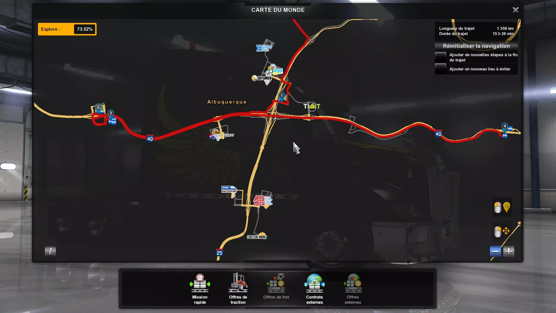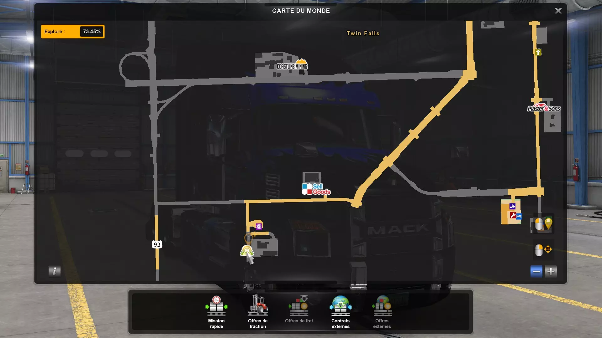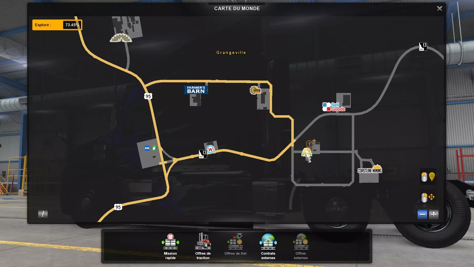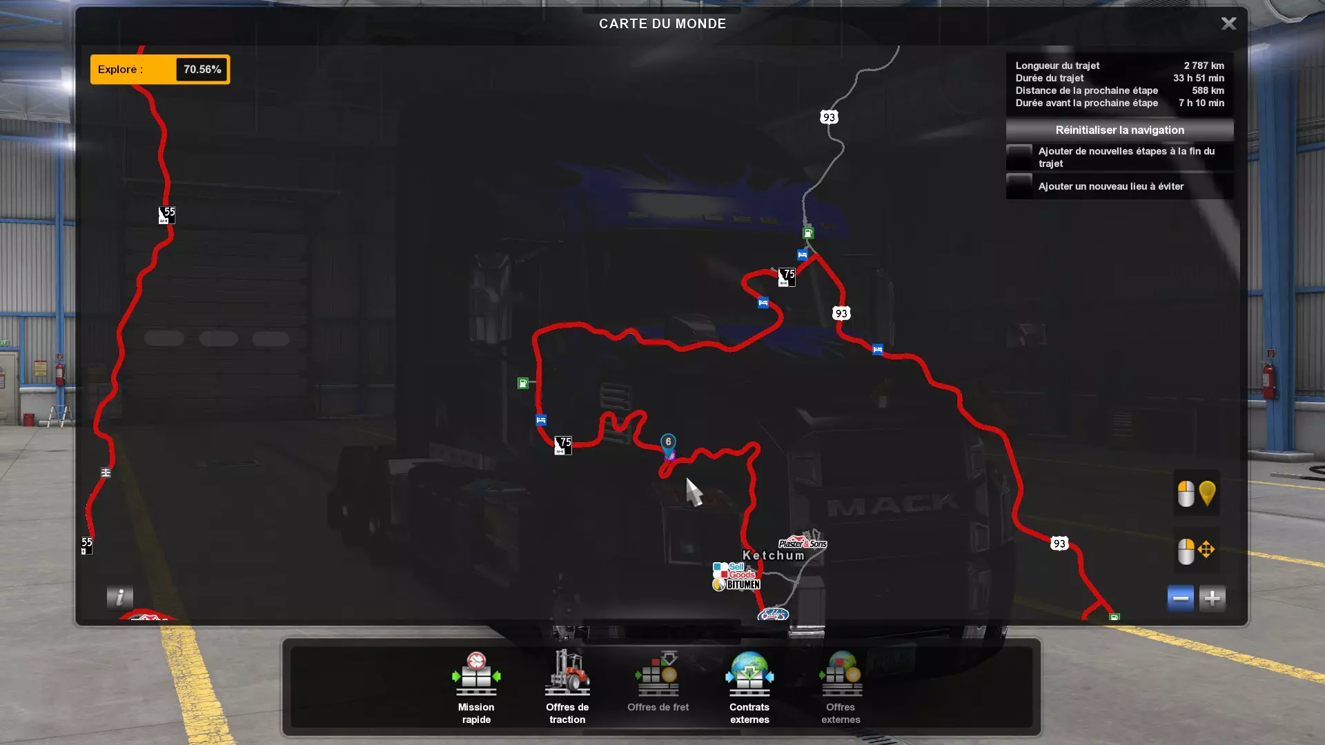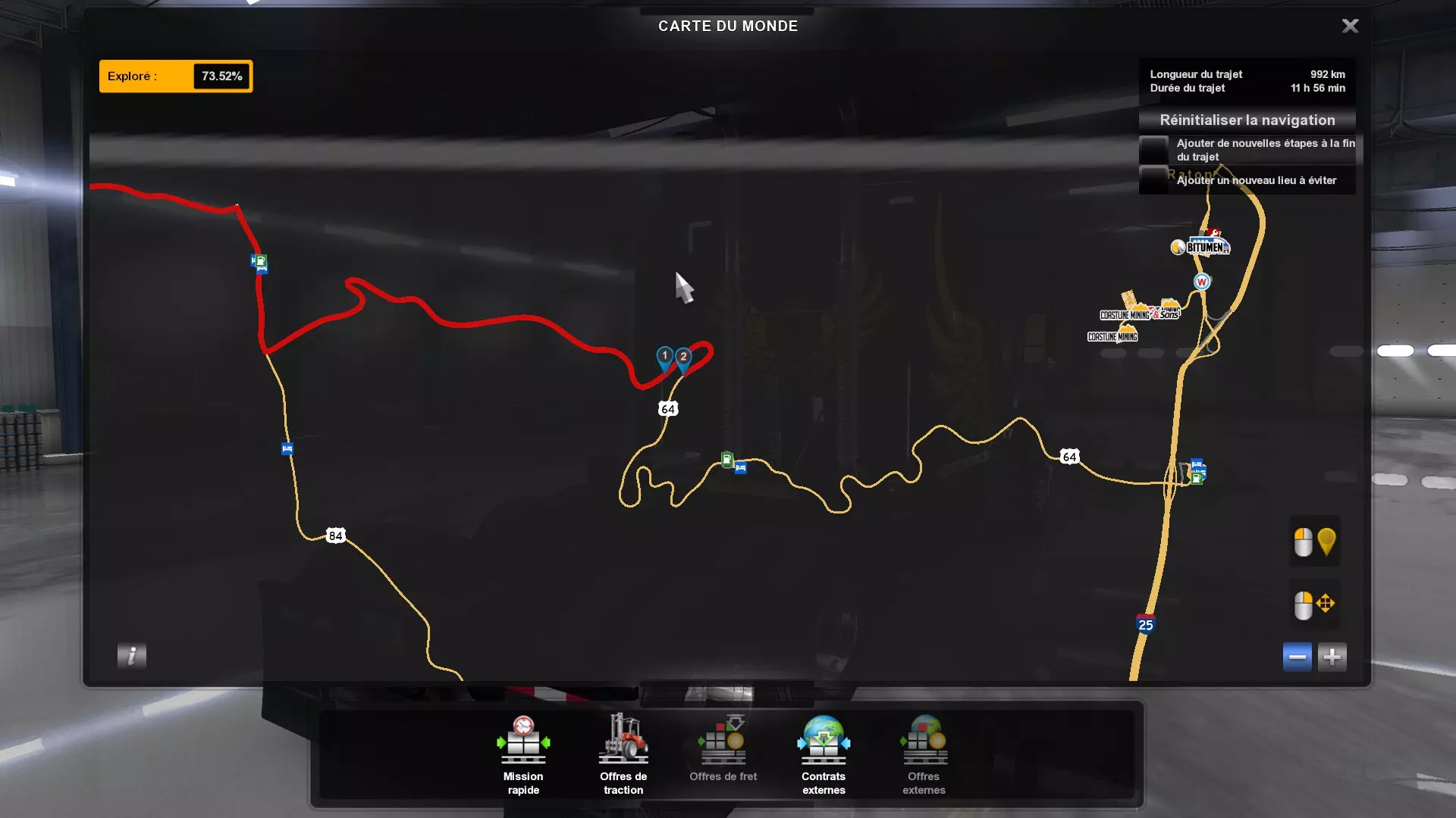 Arizona (AZ)Kingman (AZ) Flagstaff (AZ) 250 km Phoenix (AZ) Sierra Vista (AZ) 293 km Yuma (AZ) Tucson (AZ) 419 km Arkansas (AR)Jonesboro (AR) Hot Springs (AR) 356 km Little Rock (AR) El Dorado (AR) 250 km Little Rock (AR) Texarkana (AR) 344 km Californie (CA)Eureka (CA) Reeding (CA) 186 km Fresno (CA) Bakersfield (CA) 169km Oakland (CA) Huron (CA) 255 km Oakland (CA) Fresno (CA) 332 km Oxnard (CA) Barstow (CA) 298 km Sacramento (CA) Oakdale (CA) 336 km Santa Cruz (CA) Santa Maria (CA) 305 km Stockton (CA) San Francisco (CA) 228 km Stockton (CA) Huron (CA) 295 km Truckee (CA) Oakland () 312 km Truckee (CA) Carson City (NV) 222 km Colorado (CO)Burlington (CO) Lamar (CO) 205 km Denver (CO) Colorado Springs (CO) 206 km Denver (CO) Grand Junction (CO) 467 km Pueblo (CO) Denver (CO) 397 km Pueblo (CO) Marysville (KS) 1139 km Pueblo (CO) Dodge City (KS) 504 km Pueblo (CO) Pueblo (CO) 147 km Sterling (CO) Colorado Springs (CO) 310 km Idaho (ID)Boise (ID) Grangeville (ID) 303 km Idaho Falls (ID) Salmon (ID) 234 km Lewiston (ID) Sandpoint (ID) 277 km Twin Falls (ID) Nampa (ID) 233 km Iowa (IA)Burlington (IA) Iowa City (IA) 156 km Dubuque (IA) Mason City (IA) 395 km Sioux City (IA) Des Moines (IA) 314 km Kansas (KS)Colby (KS) Hutchinson (KS) 418 km Dodge City (KS) Emporia (KS) 345 km Topeka (KS) Pittsburg (KS) 226 km Wichita (KS) Salina (KS) 147 km Louisiane (LA)Houma (LA) Port Fourchon (LA) 121 km Nouvelle-Orléans (LA) Lafayette (LA) 289 km Lake Charles (LA) Natchitoches (LA) 264 km Shreveport (LA) Baton-Rouge (LA) 349 km Missouri (MO)Cap-Girardeau (MO) Springfield (MO) 425 km Kansas City (MO) Rolla (MO) 452 km St Louis (MO) Kirksville (MO) 430 km Montana (MT)Butte (MT) Bozeman (MT) 389 km Havre (MT) Lewistown (MT) 374 km Laurel (MT) Glendive (MT) 395 km Laurel (MT) Billing (MT) 178 km Thompson Falls (MT) Kalispell (MT) 306 km Nevada (NV)Primm (NV) Ely (NV) 520 km Winnemucca (NV) to Carson City (NV) 418 km Nouveau-Mexique (NM)Artesia (NM) Las Cruces (NM) 290 km Clovis(NM) Hobbs (NM) 333 km Farmington (NM) Raton (NM) 525 km Gallup (NM) Raton (NM) 574 km Santa Fe (NM) Socorro (NM) 215 km Socorro (NM) Tucson (AZ) 659 km Oklahoma (OK) Clinton (OK) Guymon (OK) 246 km Lawton (OK) McAlester (OK) 294 km Oklahoma City (OK) Tulsa (OK) 264 km Oregon (OR)Pendleton (OR) Burns (OR) 318 km Portland (OR) Newport (OR) 294 km The Dalles (OR) Salem (OR) 292 km Texas (TX)Corpus Christi (TX) Brownsville (TX) 451 km Del Rio (TX) Van Horn (TX) 516 km Fort Stockton (TX) Abilene (TX) 369 km Laredo (TX) San Antonio (TX) 345 km Longview (TX) Galveston (TX) 521 km Lubbock (TX) Odessa (TX) 312 km San Angelo (TX) Dallas (TX) 446 km Wichita Falls (TX) Amarillo (TX) 392 km Utah (UT)Provo (UT) Price (UT) 184 km Salina (UT) Cedar City (UT) 203 km Vernal (UT) Salt Lake City (UT) 367 km Washington (WA)Omak (WA) Yakima (WA) 358 km Port Angeles (WA) Aberdeen (WA) 190 km Seattle (WA) Everett (WA) 78 km Spokane (WA) Grand Coulee (WA) 210 km Wyoming (WY)Casper (WY) Gilette (WY) 206 km Cheyenne (WY) Rock Springs (WY) 400 km Laramie (WY) Rawlins (WY) 136 km Riverton (WY) Jackson (WY) 331 km 6 - Votre tombereau est arrivé !