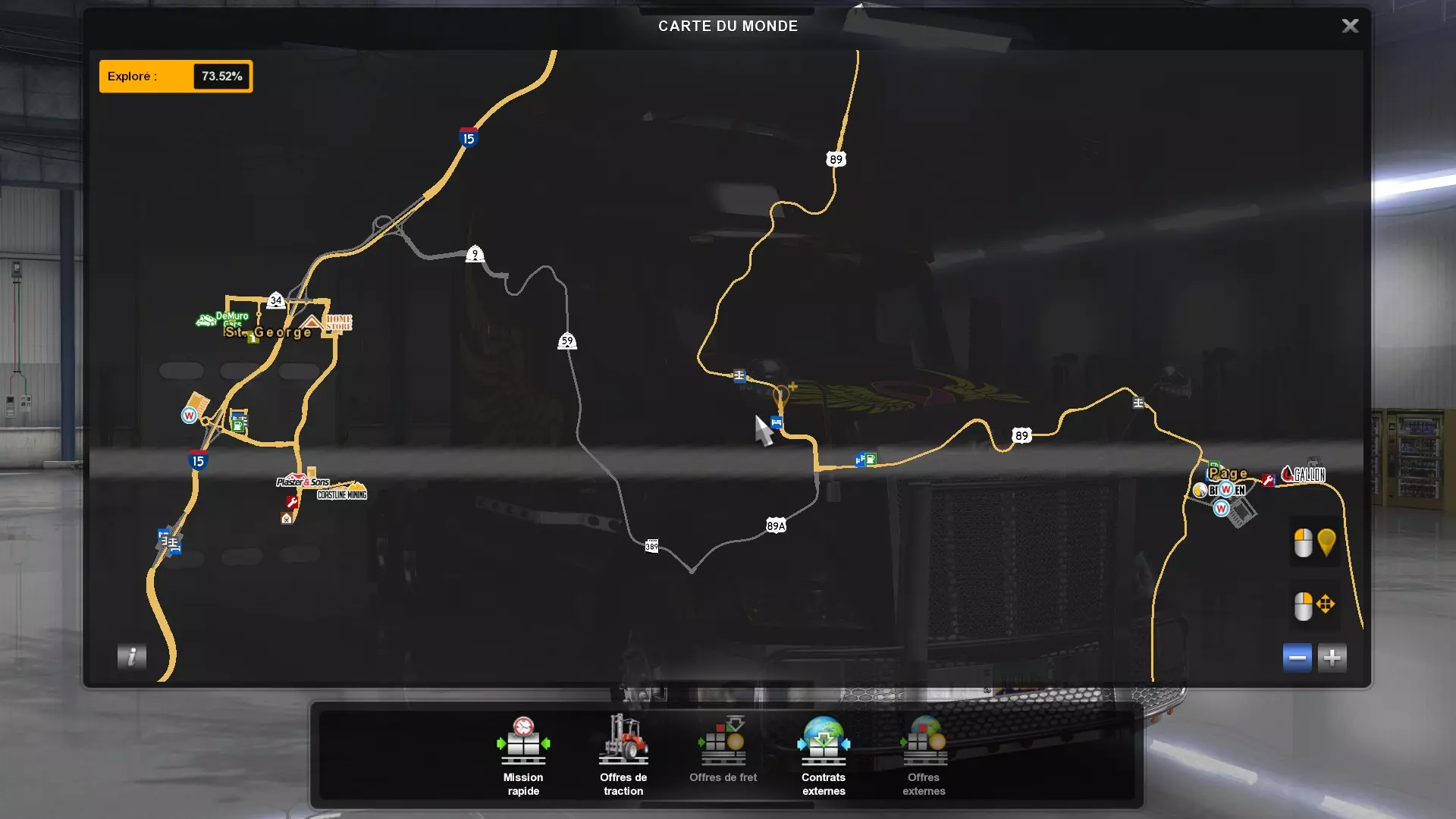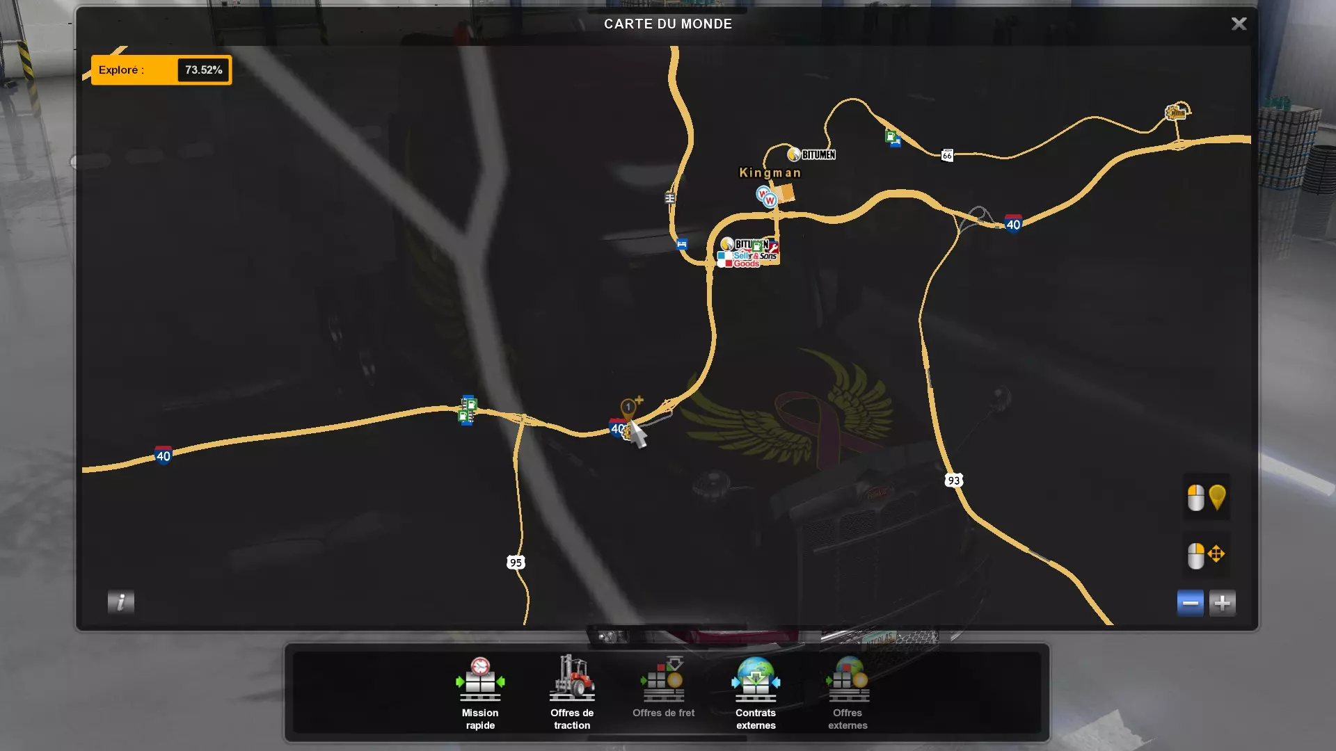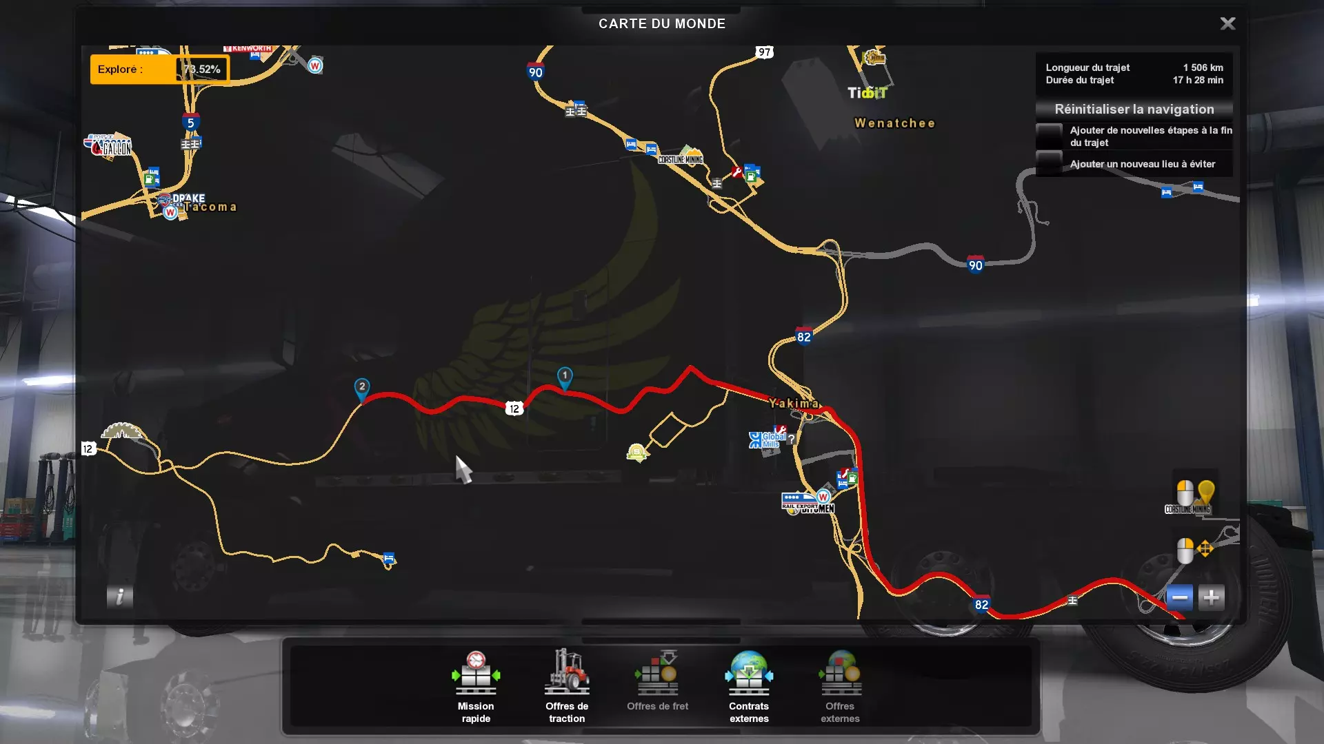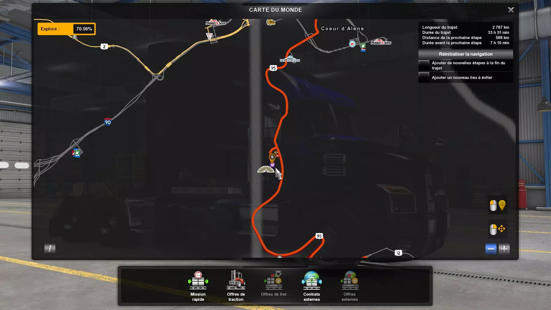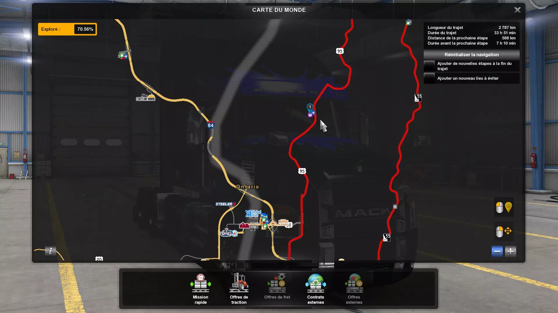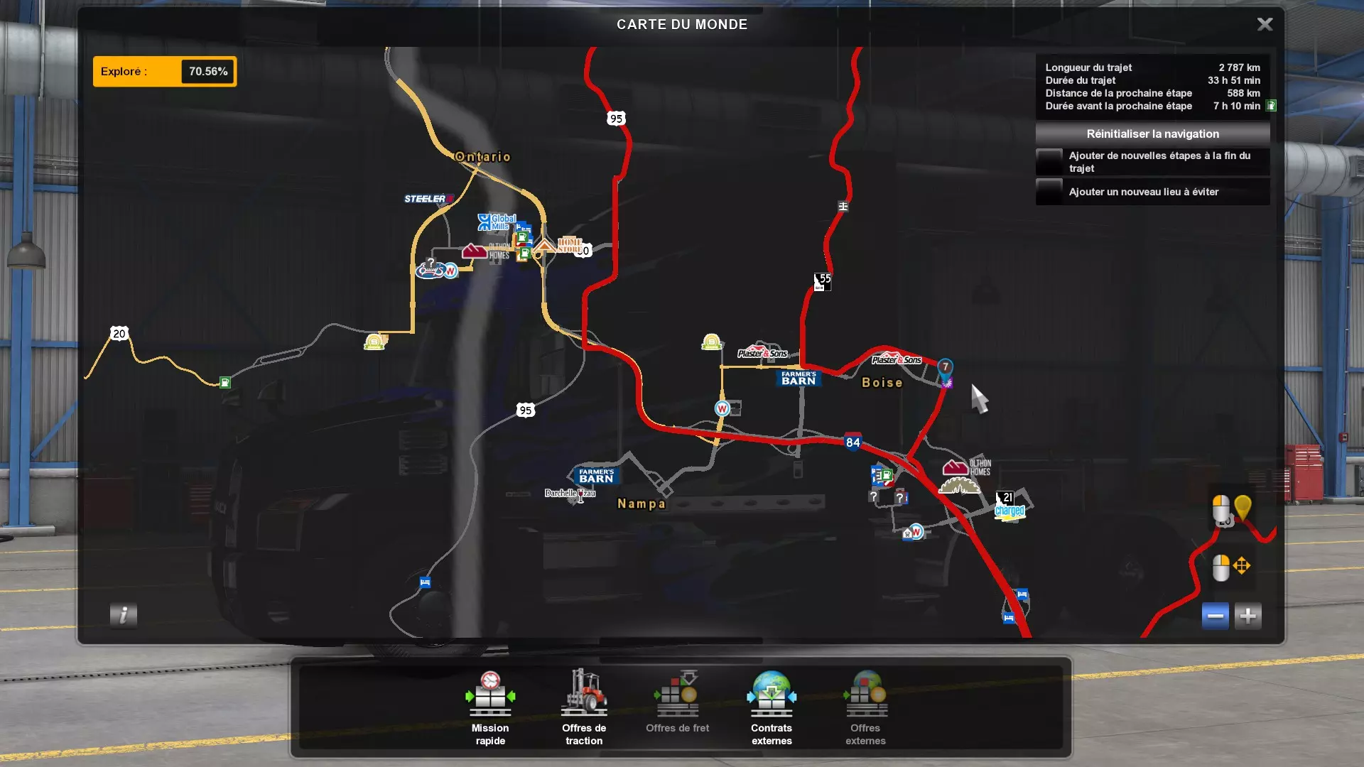 Arizona (AZ)Kingman (AZ) Flagstaff (AZ) 250 km Phoenix (AZ) Sierra Vista (AZ) 293 km Yuma (AZ) Tucson (AZ) 419 km Arkansas (AR)Jonesboro (AR) Hot Springs (AR) 356 km Little Rock (AR) El Dorado (AR) 250 km Little Rock (AR) Texarkana (AR) 344 km Californie (CA)Eureka (CA) Reeding (CA) 186 km Fresno (CA) Bakersfield (CA) 169km Oakland (CA) Huron (CA) 255 km Oakland (CA) Fresno (CA) 332 km Oxnard (CA) Barstow (CA) 298 km Sacramento (CA) Oakdale (CA) 336 km Santa Cruz (CA) Santa Maria (CA) 305 km Stockton (CA) San Francisco (CA) 228 km Stockton (CA) Huron (CA) 295 km Truckee (CA) Oakland () 312 km Truckee (CA) Carson City (NV) 222 km Colorado (CO)Burlington (CO) Lamar (CO) 205 km Denver (CO) Colorado Springs (CO) 206 km Denver (CO) Grand Junction (CO) 467 km Pueblo (CO) Denver (CO) 397 km Pueblo (CO) Marysville (KS) 1139 km Pueblo (CO) Dodge City (KS) 504 km Pueblo (CO) Pueblo (CO) 147 km Sterling (CO) Colorado Springs (CO) 310 km Idaho (ID)Boise (ID) Grangeville (ID) 303 km Idaho Falls (ID) Salmon (ID) 234 km Lewiston (ID) Sandpoint (ID) 277 km Twin Falls (ID) Nampa (ID) 233 km Iowa (IA)Burlington (IA) Iowa City (IA) 156 km Dubuque (IA) Mason City (IA) 395 km Sioux City (IA) Des Moines (IA) 314 km Kansas (KS)Colby (KS) Hutchinson (KS) 418 km Dodge City (KS) Emporia (KS) 345 km Topeka (KS) Pittsburg (KS) 226 km Wichita (KS) Salina (KS) 147 km Louisiane (LA)Houma (LA) Port Fourchon (LA) 121 km Nouvelle-Orléans (LA) Lafayette (LA) 289 km Lake Charles (LA) Natchitoches (LA) 264 km Shreveport (LA) Baton-Rouge (LA) 349 km Missouri (MO)Cap-Girardeau (MO) Springfield (MO) 425 km Kansas City (MO) Rolla (MO) 452 km St Louis (MO) Kirksville (MO) 430 km Montana (MT)Butte (MT) Bozeman (MT) 389 km Havre (MT) Lewistown (MT) 374 km Laurel (MT) Glendive (MT) 395 km Laurel (MT) Billing (MT) 178 km Thompson Falls (MT) Kalispell (MT) 306 km Nevada (NV)Primm (NV) Ely (NV) 520 km Winnemucca (NV) to Carson City (NV) 418 km Nouveau-Mexique (NM)Artesia (NM) Las Cruces (NM) 290 km Clovis(NM) Hobbs (NM) 333 km Farmington (NM) Raton (NM) 525 km Gallup (NM) Raton (NM) 574 km Santa Fe (NM) Socorro (NM) 215 km Socorro (NM) Tucson (AZ) 659 km Oklahoma (OK) Clinton (OK) Guymon (OK) 246 km Lawton (OK) McAlester (OK) 294 km Oklahoma City (OK) Tulsa (OK) 264 km Oregon (OR)Pendleton (OR) Burns (OR) 318 km Portland (OR) Newport (OR) 294 km The Dalles (OR) Salem (OR) 292 km Texas (TX)Corpus Christi (TX) Brownsville (TX) 451 km Del Rio (TX) Van Horn (TX) 516 km Fort Stockton (TX) Abilene (TX) 369 km Laredo (TX) San Antonio (TX) 345 km Longview (TX) Galveston (TX) 521 km Lubbock (TX) Odessa (TX) 312 km San Angelo (TX) Dallas (TX) 446 km Wichita Falls (TX) Amarillo (TX) 392 km Utah (UT)Provo (UT) Price (UT) 184 km Salina (UT) Cedar City (UT) 203 km Vernal (UT) Salt Lake City (UT) 367 km Washington (WA)Omak (WA) Yakima (WA) 358 km Port Angeles (WA) Aberdeen (WA) 190 km Seattle (WA) Everett (WA) 78 km Spokane (WA) Grand Coulee (WA) 210 km Wyoming (WY)Casper (WY) Gilette (WY) 206 km Cheyenne (WY) Rock Springs (WY) 400 km Laramie (WY) Rawlins (WY) 136 km Riverton (WY) Jackson (WY) 331 km 6 - Votre tombereau est arrivé !