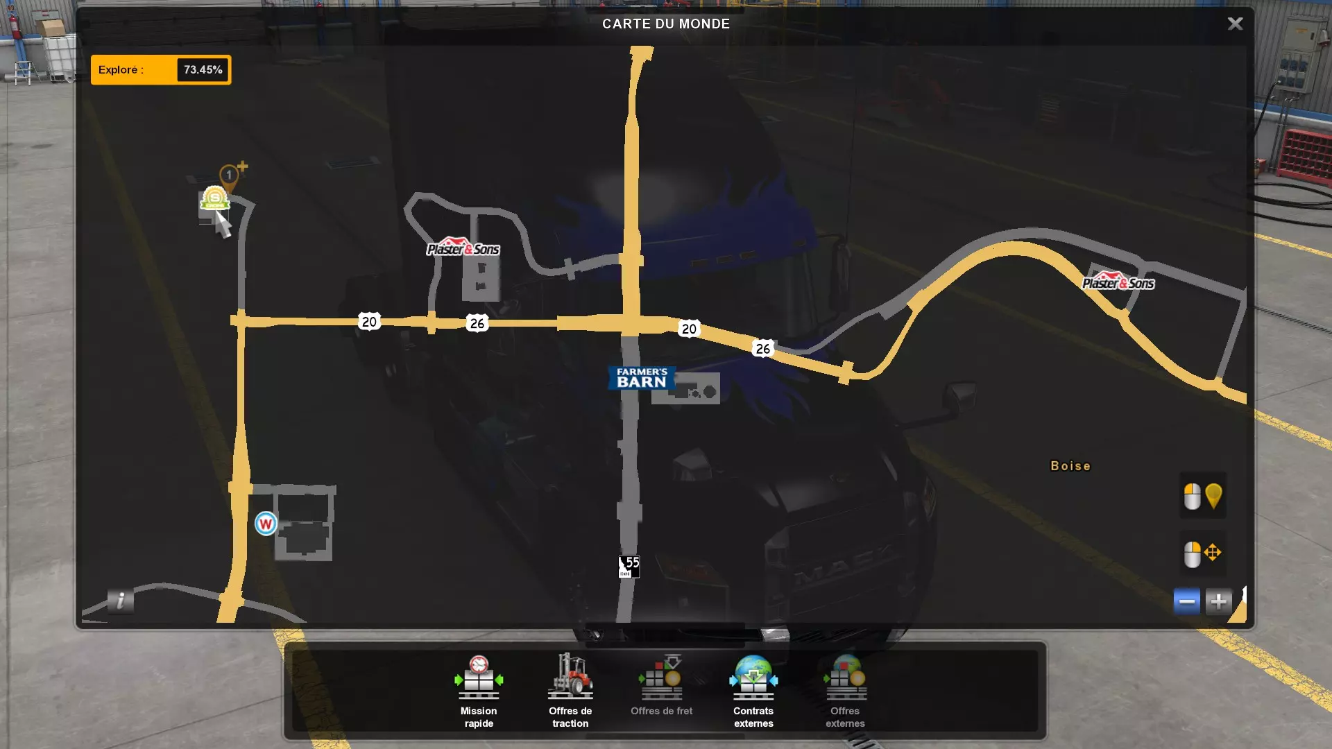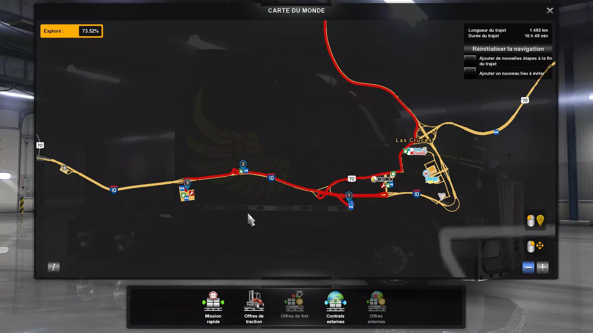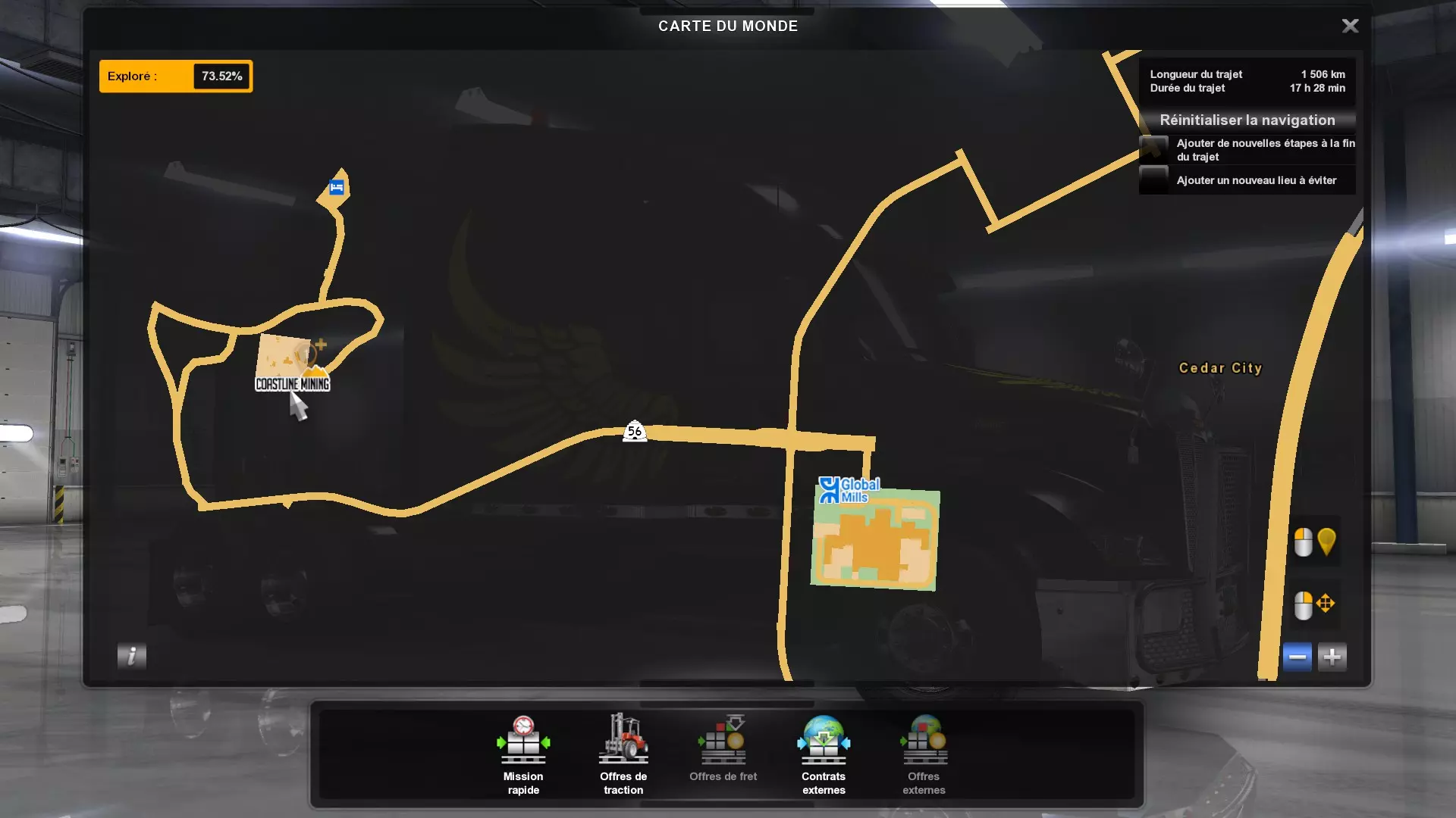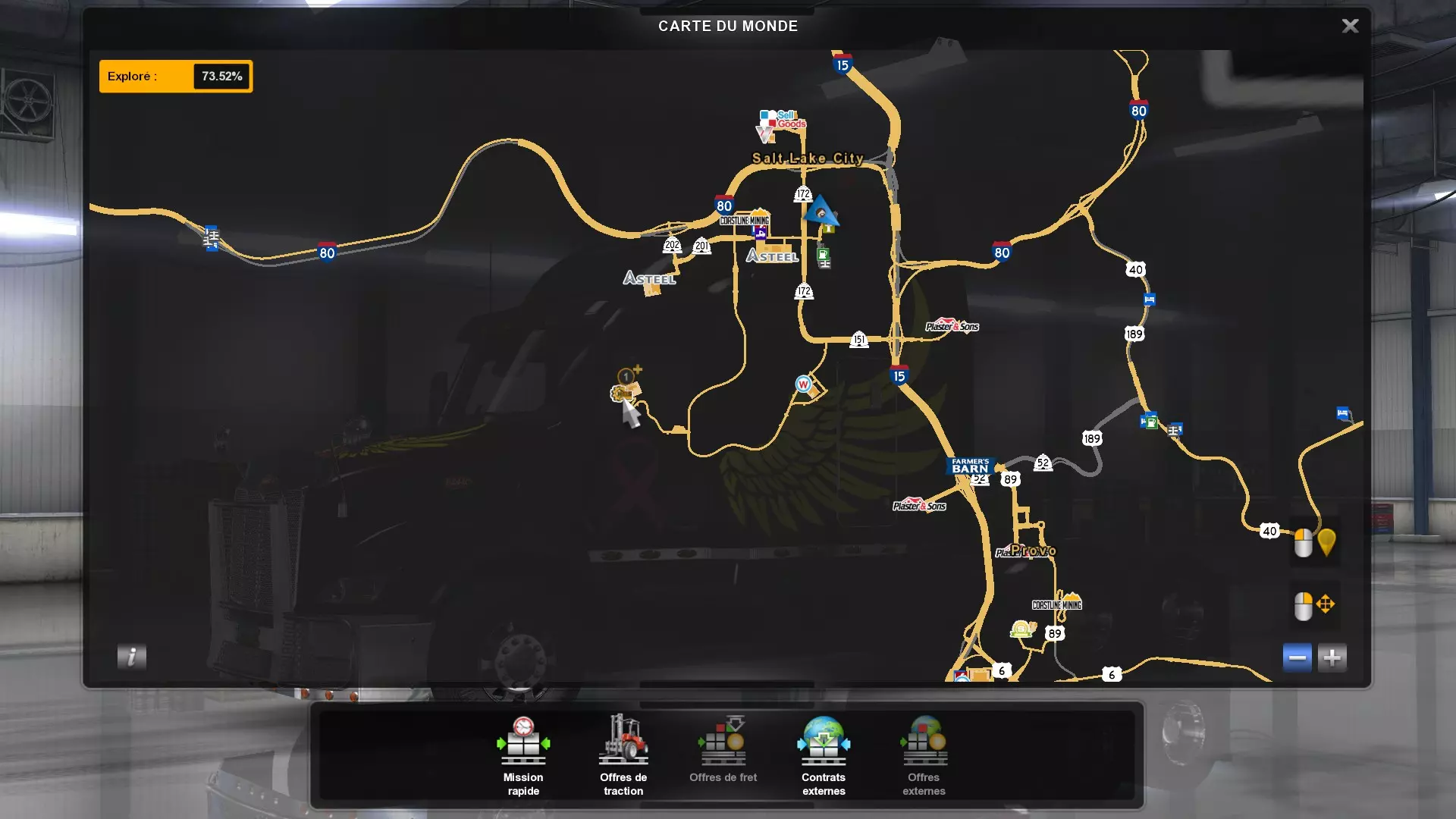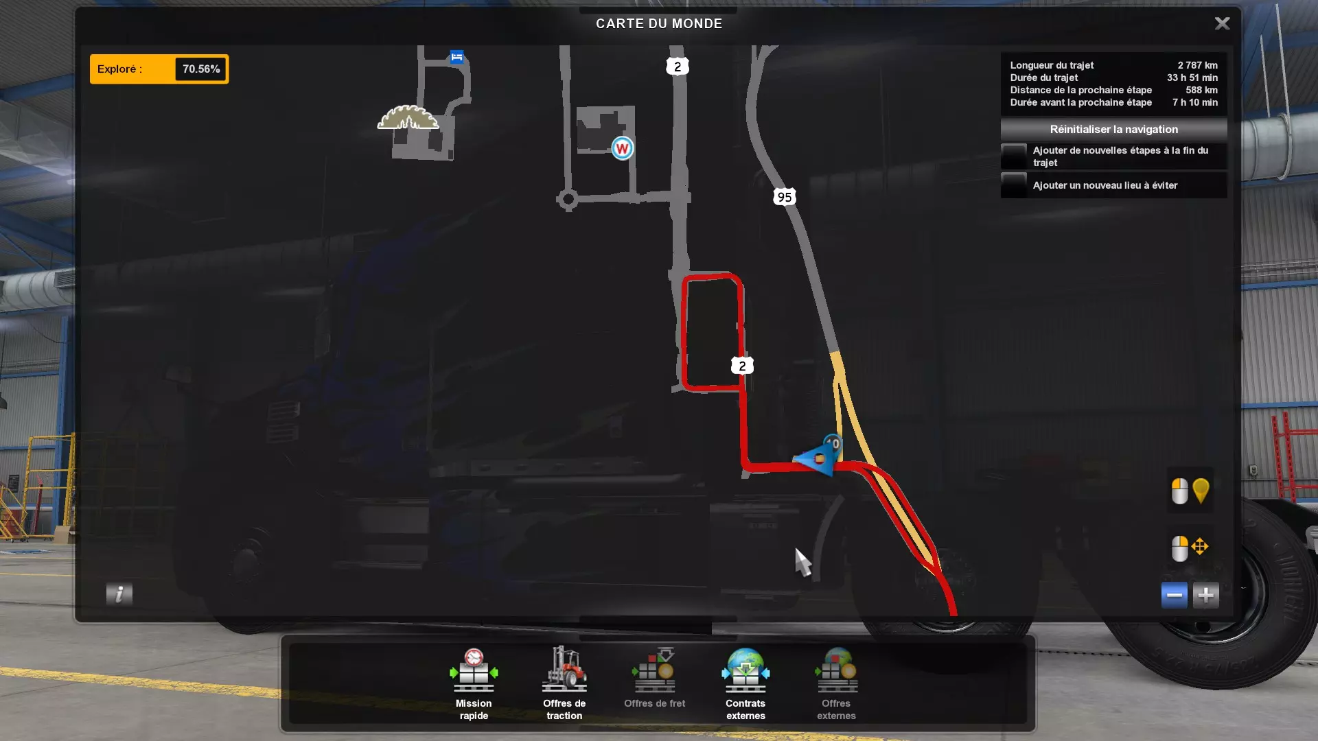 Arizona (AZ)Kingman (AZ) Flagstaff (AZ) 250 km Phoenix (AZ) Sierra Vista (AZ) 293 km Yuma (AZ) Tucson (AZ) 419 km Arkansas (AR)Jonesboro (AR) Hot Springs (AR) 356 km Little Rock (AR) El Dorado (AR) 250 km Little Rock (AR) Texarkana (AR) 344 km Californie (CA)Eureka (CA) Reeding (CA) 186 km Fresno (CA) Bakersfield (CA) 169km Oakland (CA) Huron (CA) 255 km Oakland (CA) Fresno (CA) 332 km Oxnard (CA) Barstow (CA) 298 km Sacramento (CA) Oakdale (CA) 336 km Santa Cruz (CA) Santa Maria (CA) 305 km Stockton (CA) San Francisco (CA) 228 km Stockton (CA) Huron (CA) 295 km Truckee (CA) Oakland () 312 km Truckee (CA) Carson City (NV) 222 km Colorado (CO)Burlington (CO) Lamar (CO) 205 km Denver (CO) Colorado Springs (CO) 206 km Denver (CO) Grand Junction (CO) 467 km Pueblo (CO) Denver (CO) 397 km Pueblo (CO) Marysville (KS) 1139 km Pueblo (CO) Dodge City (KS) 504 km Pueblo (CO) Pueblo (CO) 147 km Sterling (CO) Colorado Springs (CO) 310 km Idaho (ID)Boise (ID) Grangeville (ID) 303 km Idaho Falls (ID) Salmon (ID) 234 km Lewiston (ID) Sandpoint (ID) 277 km Twin Falls (ID) Nampa (ID) 233 km Iowa (IA)Burlington (IA) Iowa City (IA) 156 km Dubuque (IA) Mason City (IA) 395 km Sioux City (IA) Des Moines (IA) 314 km Kansas (KS)Colby (KS) Hutchinson (KS) 418 km Dodge City (KS) Emporia (KS) 345 km Topeka (KS) Pittsburg (KS) 226 km Wichita (KS) Salina (KS) 147 km Louisiane (LA)Houma (LA) Port Fourchon (LA) 121 km Nouvelle-Orléans (LA) Lafayette (LA) 289 km Lake Charles (LA) Natchitoches (LA) 264 km Shreveport (LA) Baton-Rouge (LA) 349 km Missouri (MO)Cap-Girardeau (MO) Springfield (MO) 425 km Kansas City (MO) Rolla (MO) 452 km St Louis (MO) Kirksville (MO) 430 km Montana (MT)Butte (MT) Bozeman (MT) 389 km Havre (MT) Lewistown (MT) 374 km Laurel (MT) Glendive (MT) 395 km Laurel (MT) Billing (MT) 178 km Thompson Falls (MT) Kalispell (MT) 306 km Nevada (NV)Primm (NV) Ely (NV) 520 km Winnemucca (NV) to Carson City (NV) 418 km Nouveau-Mexique (NM)Artesia (NM) Las Cruces (NM) 290 km Clovis(NM) Hobbs (NM) 333 km Farmington (NM) Raton (NM) 525 km Gallup (NM) Raton (NM) 574 km Santa Fe (NM) Socorro (NM) 215 km Socorro (NM) Tucson (AZ) 659 km Oklahoma (OK) Clinton (OK) Guymon (OK) 246 km Lawton (OK) McAlester (OK) 294 km Oklahoma City (OK) Tulsa (OK) 264 km Oregon (OR)Pendleton (OR) Burns (OR) 318 km Portland (OR) Newport (OR) 294 km The Dalles (OR) Salem (OR) 292 km Texas (TX)Corpus Christi (TX) Brownsville (TX) 451 km Del Rio (TX) Van Horn (TX) 516 km Fort Stockton (TX) Abilene (TX) 369 km Laredo (TX) San Antonio (TX) 345 km Longview (TX) Galveston (TX) 521 km Lubbock (TX) Odessa (TX) 312 km San Angelo (TX) Dallas (TX) 446 km Wichita Falls (TX) Amarillo (TX) 392 km Utah (UT)Provo (UT) Price (UT) 184 km Salina (UT) Cedar City (UT) 203 km Vernal (UT) Salt Lake City (UT) 367 km Washington (WA)Omak (WA) Yakima (WA) 358 km Port Angeles (WA) Aberdeen (WA) 190 km Seattle (WA) Everett (WA) 78 km Spokane (WA) Grand Coulee (WA) 210 km Wyoming (WY)Casper (WY) Gilette (WY) 206 km Cheyenne (WY) Rock Springs (WY) 400 km Laramie (WY) Rawlins (WY) 136 km Riverton (WY) Jackson (WY) 331 km 6 - Votre tombereau est arrivé !