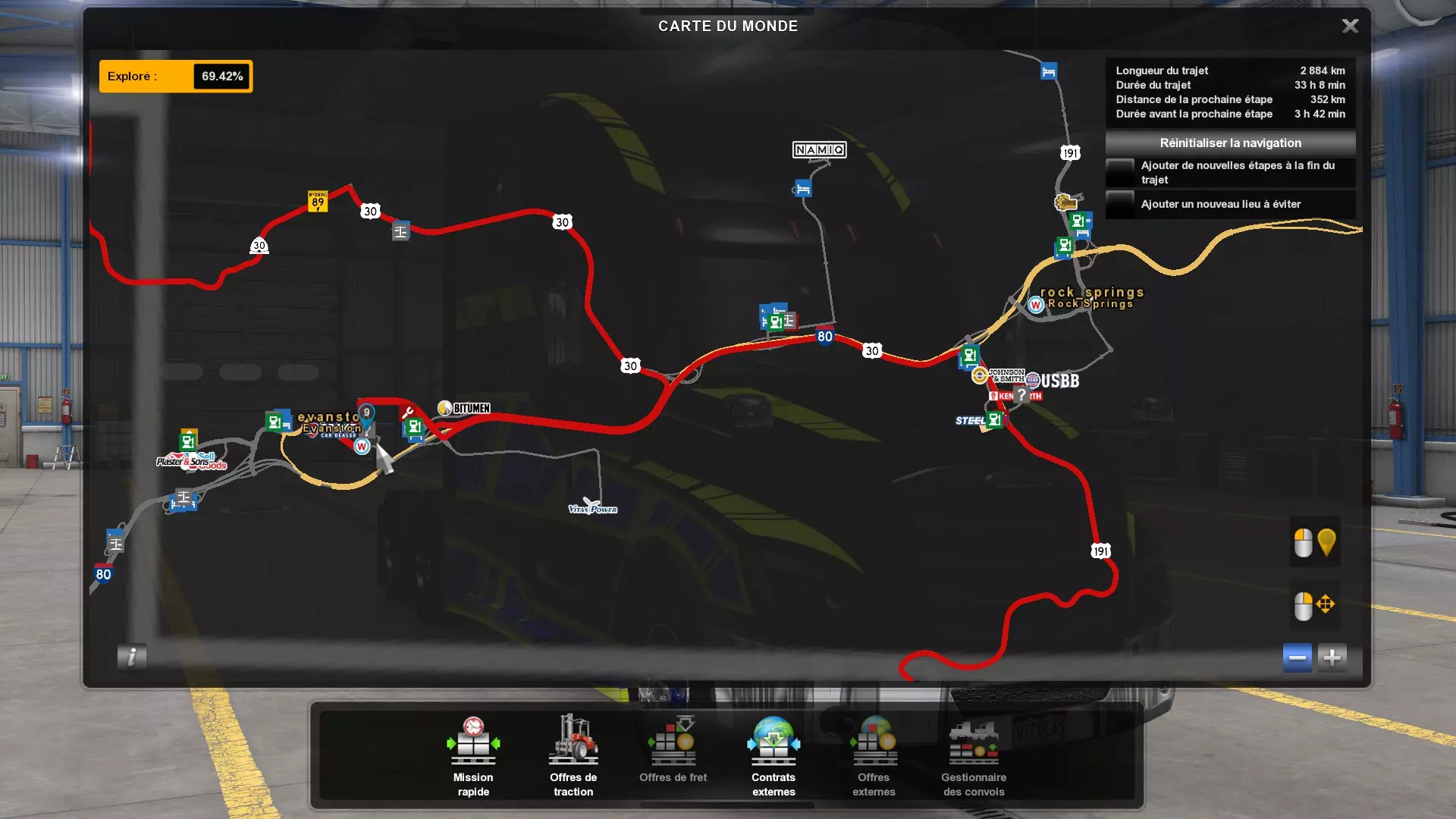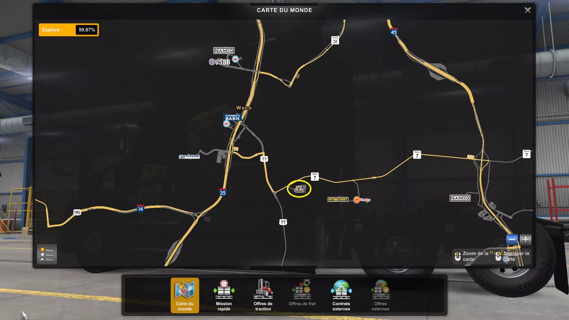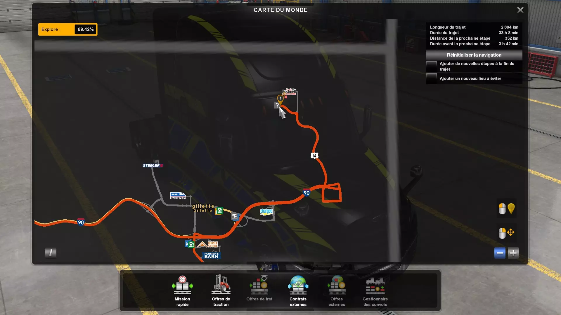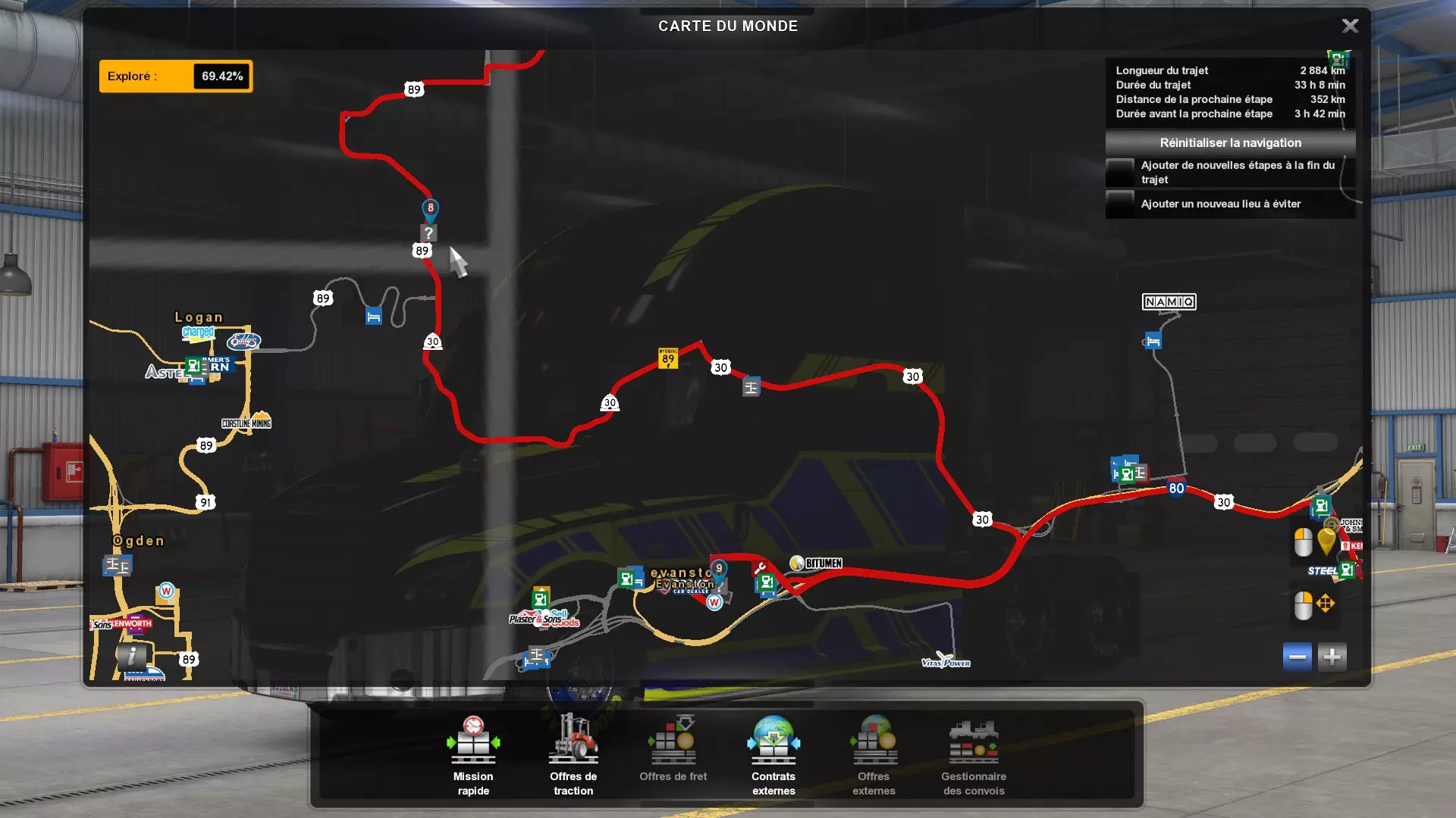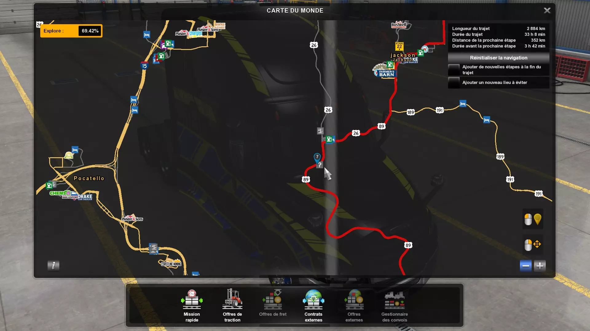 Arizona (AZ)Kingman (AZ) Flagstaff (AZ) 250 km Phoenix (AZ) Sierra Vista (AZ) 293 km Yuma (AZ) Tucson (AZ) 419 km Arkansas (AR)Jonesboro (AR) Hot Springs (AR) 356 km Little Rock (AR) El Dorado (AR) 250 km Little Rock (AR) Texarkana (AR) 344 km Californie (CA)Eureka (CA) Reeding (CA) 186 km Fresno (CA) Bakersfield (CA) 169km Oakland (CA) Huron (CA) 255 km Oakland (CA) Fresno (CA) 332 km Oxnard (CA) Barstow (CA) 298 km Sacramento (CA) Oakdale (CA) 336 km Santa Cruz (CA) Santa Maria (CA) 305 km Stockton (CA) San Francisco (CA) 228 km Stockton (CA) Huron (CA) 295 km Truckee (CA) Oakland () 312 km Truckee (CA) Carson City (NV) 222 km Colorado (CO)Burlington (CO) Lamar (CO) 205 km Denver (CO) Colorado Springs (CO) 206 km Denver (CO) Grand Junction (CO) 467 km Pueblo (CO) Denver (CO) 397 km Pueblo (CO) Marysville (KS) 1139 km Pueblo (CO) Dodge City (KS) 504 km Pueblo (CO) Pueblo (CO) 147 km Sterling (CO) Colorado Springs (CO) 310 km Idaho (ID)Boise (ID) Grangeville (ID) 303 km Idaho Falls (ID) Salmon (ID) 234 km Lewiston (ID) Sandpoint (ID) 277 km Twin Falls (ID) Nampa (ID) 233 km Iowa (IA)Burlington (IA) Iowa City (IA) 156 km Dubuque (IA) Mason City (IA) 395 km Sioux City (IA) Des Moines (IA) 314 km Kansas (KS)Colby (KS) Hutchinson (KS) 418 km Dodge City (KS) Emporia (KS) 345 km Topeka (KS) Pittsburg (KS) 226 km Wichita (KS) Salina (KS) 147 km Louisiane (LA)Houma (LA) Port Fourchon (LA) 121 km Nouvelle-Orléans (LA) Lafayette (LA) 289 km Lake Charles (LA) Natchitoches (LA) 264 km Shreveport (LA) Baton-Rouge (LA) 349 km Missouri (MO)Cap-Girardeau (MO) Springfield (MO) 425 km Kansas City (MO) Rolla (MO) 452 km St Louis (MO) Kirksville (MO) 430 km Montana (MT)Butte (MT) Bozeman (MT) 389 km Havre (MT) Lewistown (MT) 374 km Laurel (MT) Glendive (MT) 395 km Laurel (MT) Billing (MT) 178 km Thompson Falls (MT) Kalispell (MT) 306 km Nevada (NV)Primm (NV) Ely (NV) 520 km Winnemucca (NV) to Carson City (NV) 418 km Nouveau-Mexique (NM)Artesia (NM) Las Cruces (NM) 290 km Clovis(NM) Hobbs (NM) 333 km Farmington (NM) Raton (NM) 525 km Gallup (NM) Raton (NM) 574 km Santa Fe (NM) Socorro (NM) 215 km Socorro (NM) Tucson (AZ) 659 km Oklahoma (OK) Clinton (OK) Guymon (OK) 246 km Lawton (OK) McAlester (OK) 294 km Oklahoma City (OK) Tulsa (OK) 264 km Oregon (OR)Pendleton (OR) Burns (OR) 318 km Portland (OR) Newport (OR) 294 km The Dalles (OR) Salem (OR) 292 km Texas (TX)Corpus Christi (TX) Brownsville (TX) 451 km Del Rio (TX) Van Horn (TX) 516 km Fort Stockton (TX) Abilene (TX) 369 km Laredo (TX) San Antonio (TX) 345 km Longview (TX) Galveston (TX) 521 km Lubbock (TX) Odessa (TX) 312 km San Angelo (TX) Dallas (TX) 446 km Wichita Falls (TX) Amarillo (TX) 392 km Utah (UT)Provo (UT) Price (UT) 184 km Salina (UT) Cedar City (UT) 203 km Vernal (UT) Salt Lake City (UT) 367 km Washington (WA)Omak (WA) Yakima (WA) 358 km Port Angeles (WA) Aberdeen (WA) 190 km Seattle (WA) Everett (WA) 78 km Spokane (WA) Grand Coulee (WA) 210 km Wyoming (WY)Casper (WY) Gilette (WY) 206 km Cheyenne (WY) Rock Springs (WY) 400 km Laramie (WY) Rawlins (WY) 136 km Riverton (WY) Jackson (WY) 331 km 6 - Votre tombereau est arrivé !