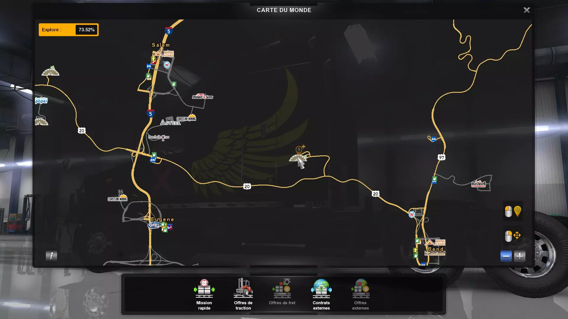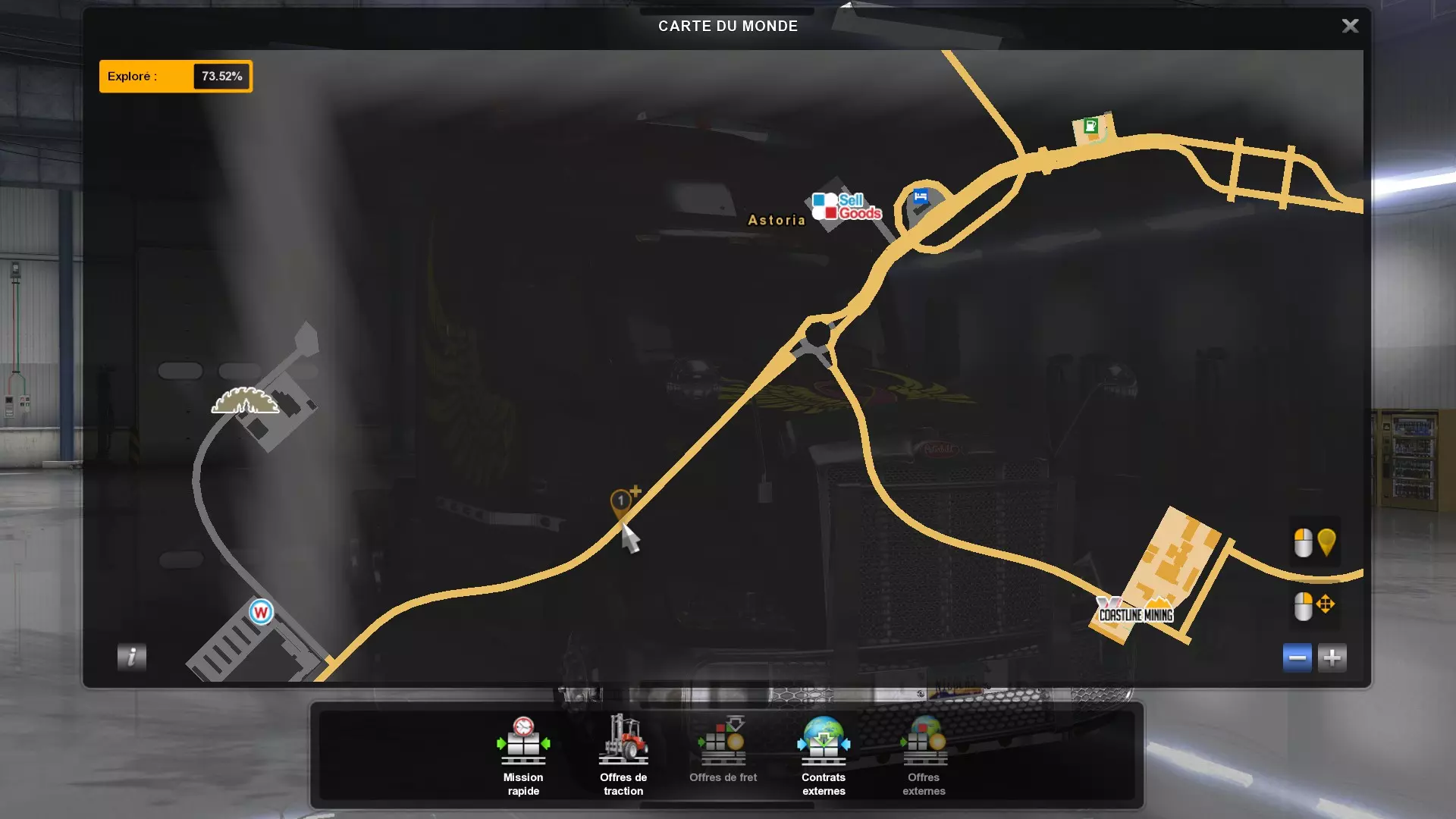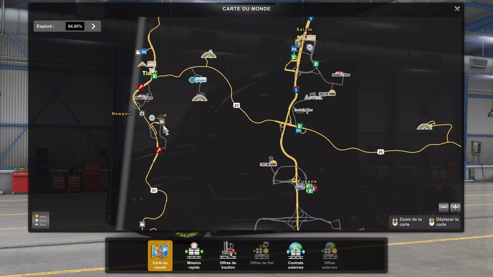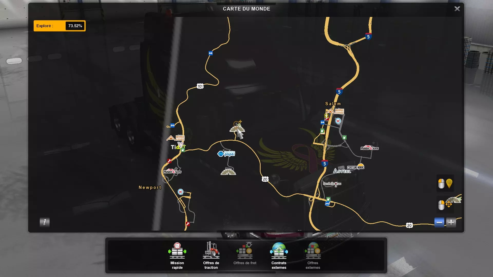 从俄勒冈州的所有木材采伐场运送货物(需要DLC《俄勒冈》) 你需要从这些地点运送货物。以下是你需要提取货物并运往其他地方的五个地点的截图。请注意,如果你在快速任务列表中选择,必须谨慎选择【原木】货物,这才是正确的采伐地点的货物。 第一个地点位于纽波特东部。