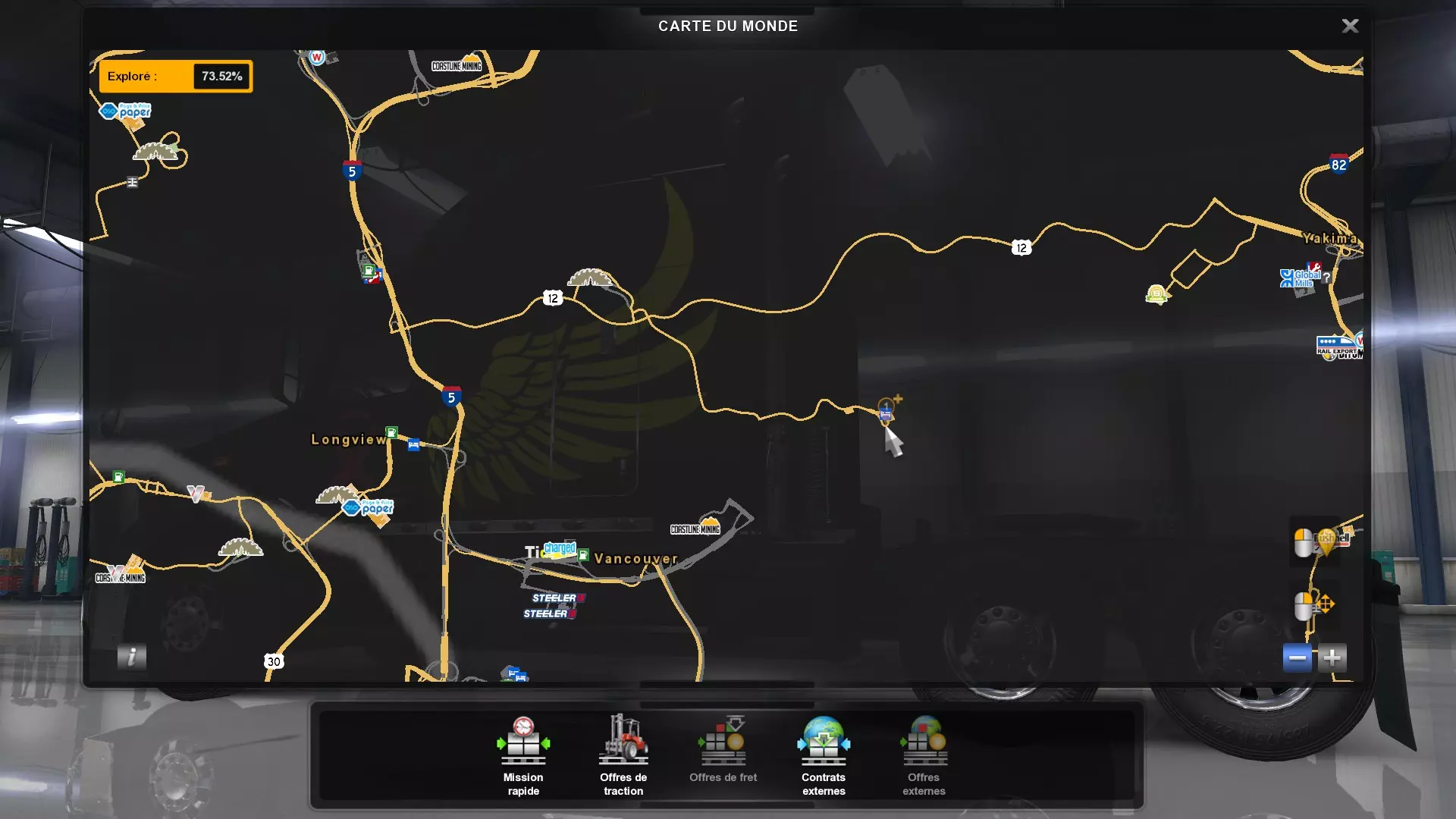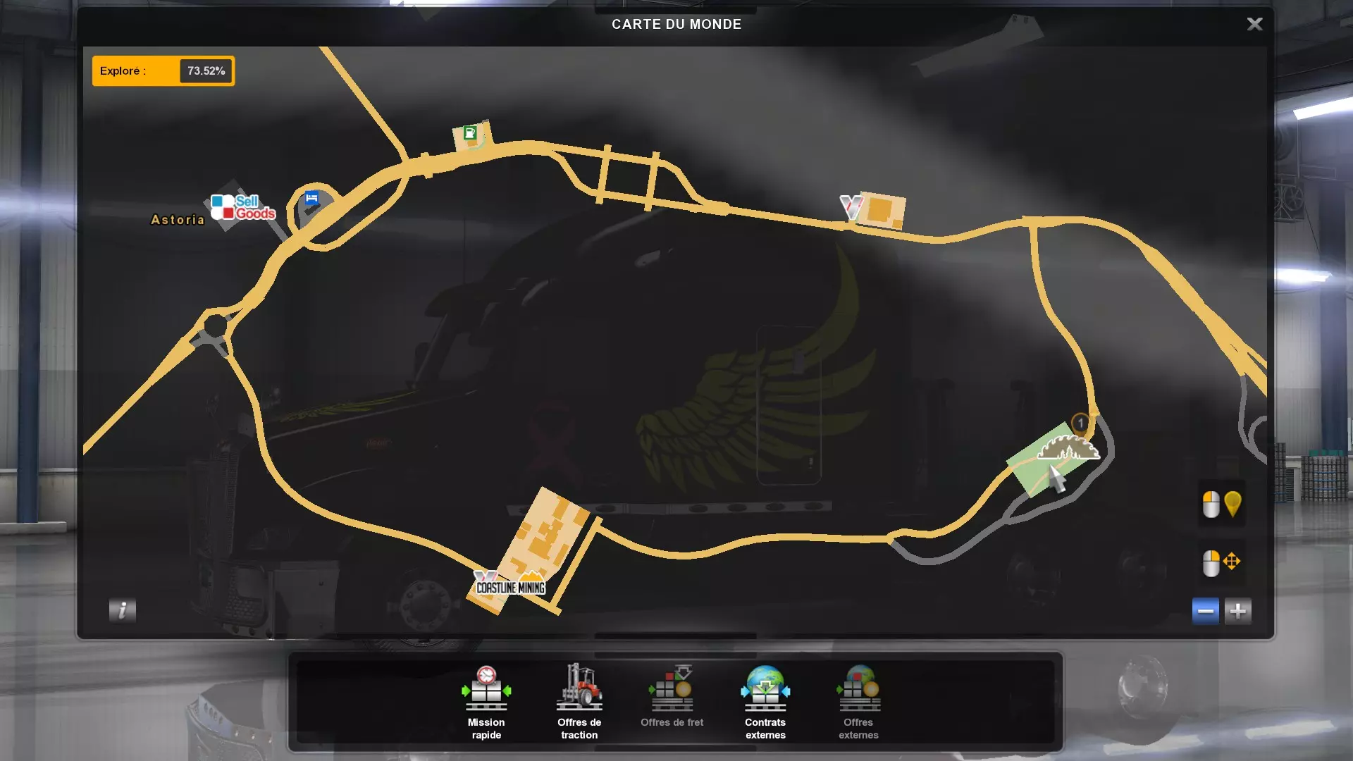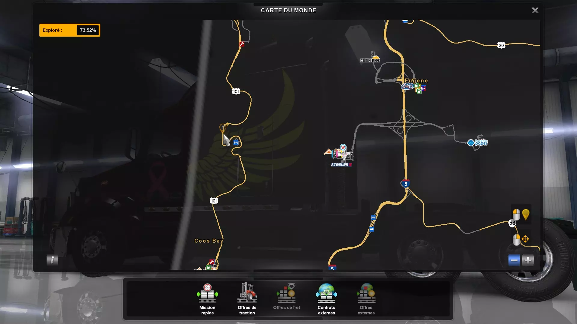从俄勒冈州的所有木材采伐场运送货物(需要DLC《俄勒冈》) 你需要从这些地点运送货物。以下是你需要提取货物并运往其他地方的五个地点的截图。请注意,如果你在快速任务列表中选择,必须谨慎选择【原木】货物,这才是正确的采伐地点的货物。 第一个地点位于纽波特东部。
