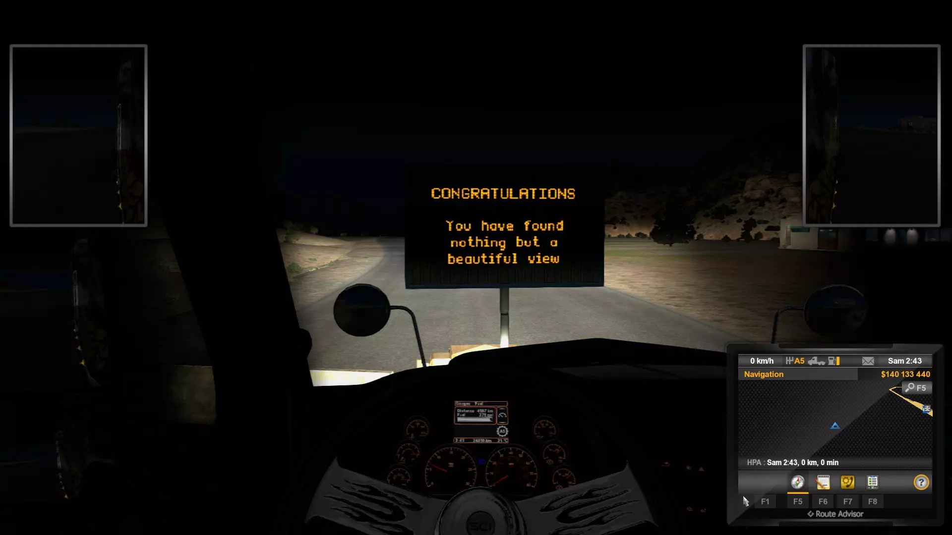 这会将游戏推迟到次日凌晨12点。 到时候你会感到疲劳,所以去睡觉吧。 你可以休息3次并重复此操作。 重复这两个步骤,直到获得你需要或想要的所有金钱。 首先要偿还银行债务,然后你的司机们会为你带来大量金钱,司机越多越好! 其他实用指令: 关闭和开启警察 ATS ETS2 关闭警察 "g_police 0" 开启警察 "g_police 1" 无交通 如果交通问题影响你达到最高速度 关闭交通 "g_traffic 0" 开启交通 "g_traffic 1" 一般成就 #1 1 - 没问题
