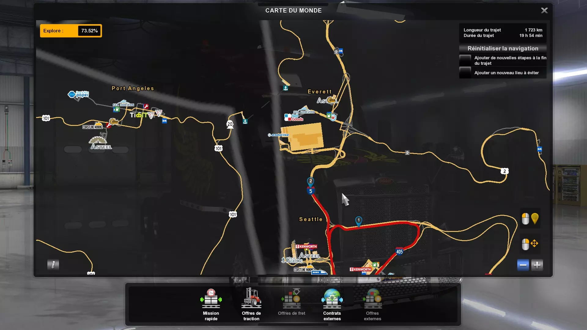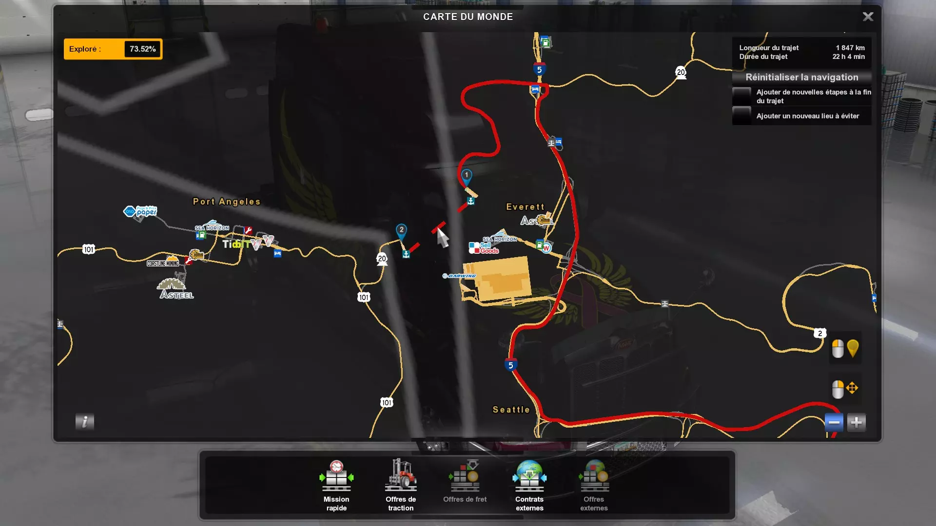 在华盛顿州的一家航空航天企业交付货物(需要【华盛顿】DLC)。你需要向其交付货物的企业名称是Darwing。你必须向埃弗雷特市的Darwing工厂(波音)交付货物,货物的位置和类型不限。