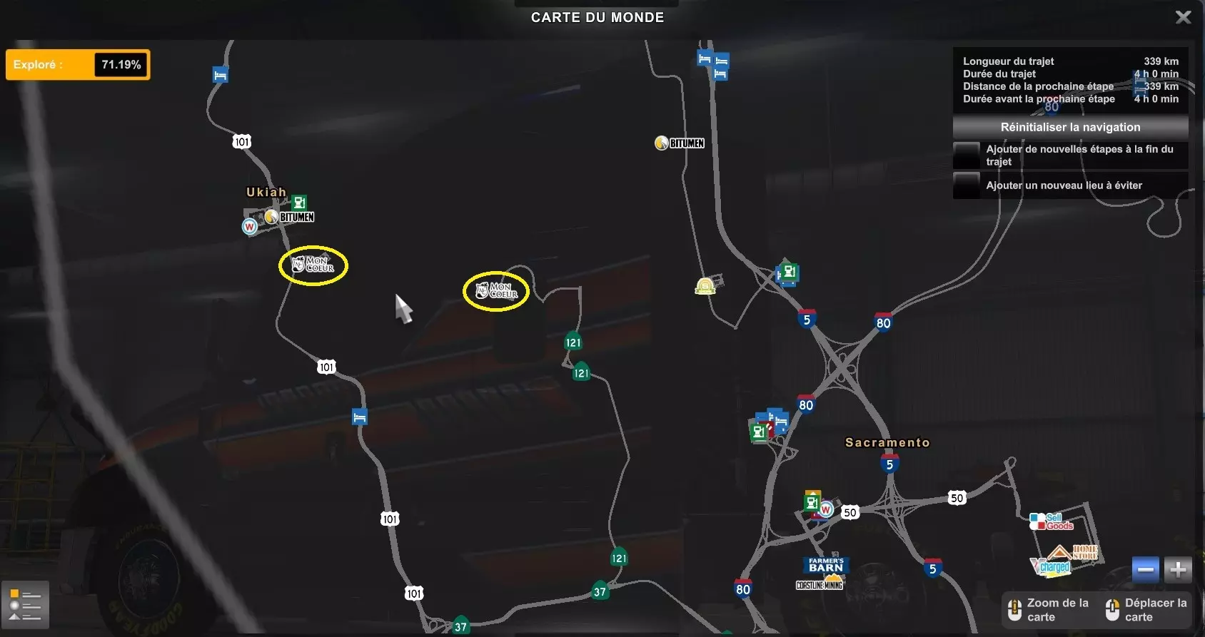 在加利福尼亚的3个葡萄园交付货物 您需要从加利福尼亚的3个葡萄园运送三批货物。请注意,这些葡萄园不是您的目的地,而是您的出发地。公司名称为Darchelle Uzau和Mon Coeur,您可以在下方截图中查看这三个葡萄园的位置。 尤凯亚和萨克拉门托(Mon Coeur)