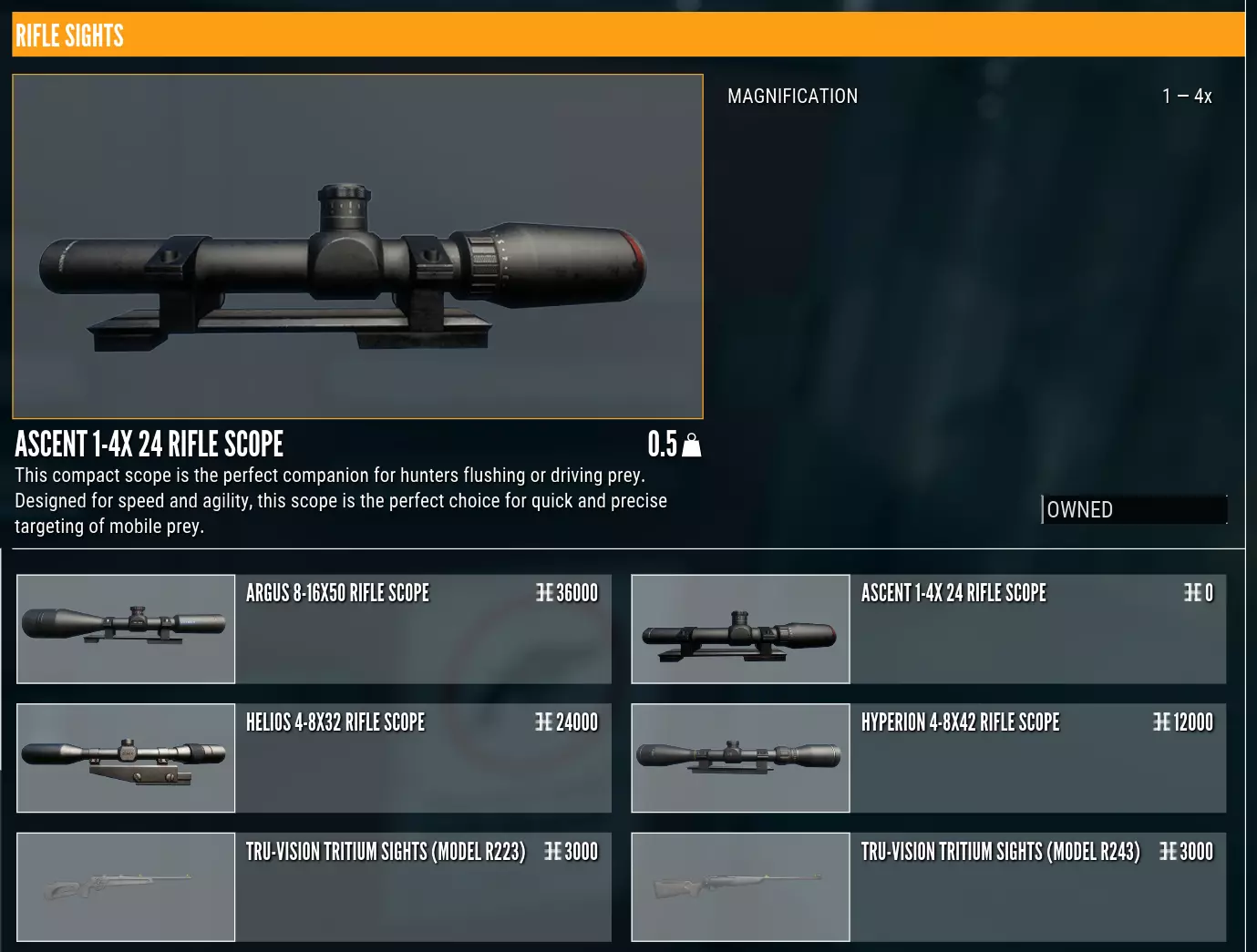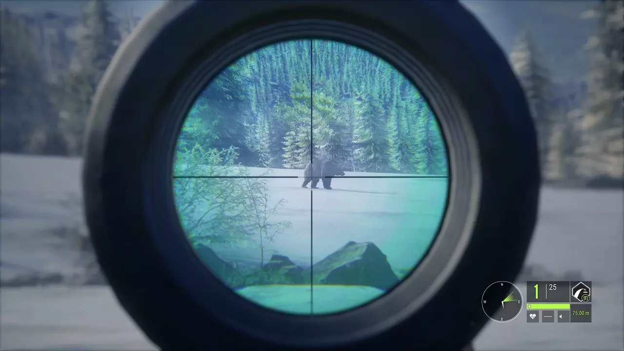 与许多其他第一人称射击游戏不同,在《猎人:荒野的呼唤》中,系统鼓励你花时间仔细瞄准,只在准备充分时才开枪。在解锁相应技能前,你只能在瞄准状态下发射一发子弹——必须放下步枪拉动枪栓、装填另一发子弹后才能再次射击。即便解锁技能后,武器的后坐力依然相当大,装填时间也较长,而且弹匣容量只有5发。这绝对不是一款靠扫射来猎杀毛茸茸小动物的游戏。 我强烈建议你刚开始游戏时,先去赫希费尔登的射击场练习,熟悉步枪操作。射击场位于地图最东南边的孤岛上,就在通往岛屿的小路尽头,你很容易就能找到。瞄准镜 你初始配备的是Ascent 1-4x24步枪瞄准镜。对于新手瞄准镜来说,它已经足够好用。记住,在瞄准镜状态下可以通过鼠标滚轮进行放大和缩小,点击鼠标滚轮可以在瞄准镜和机械瞄具之间切换。