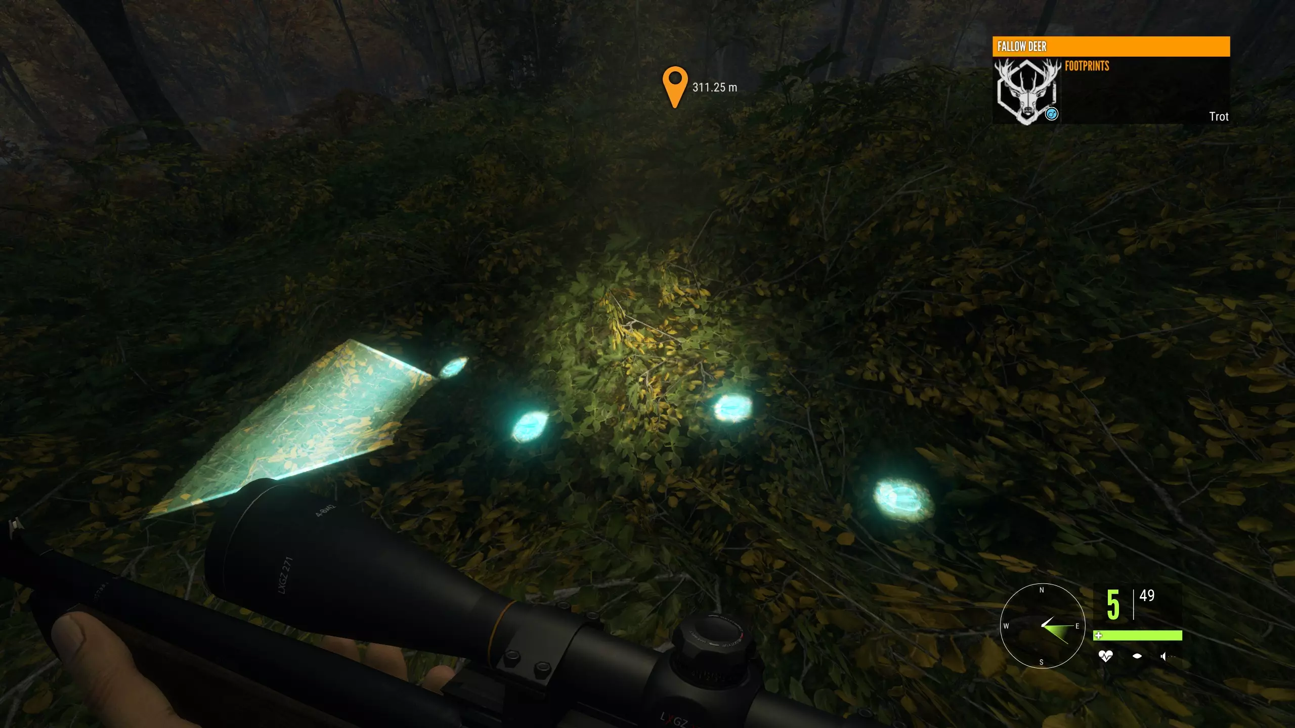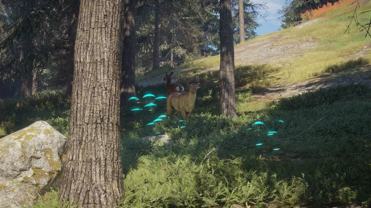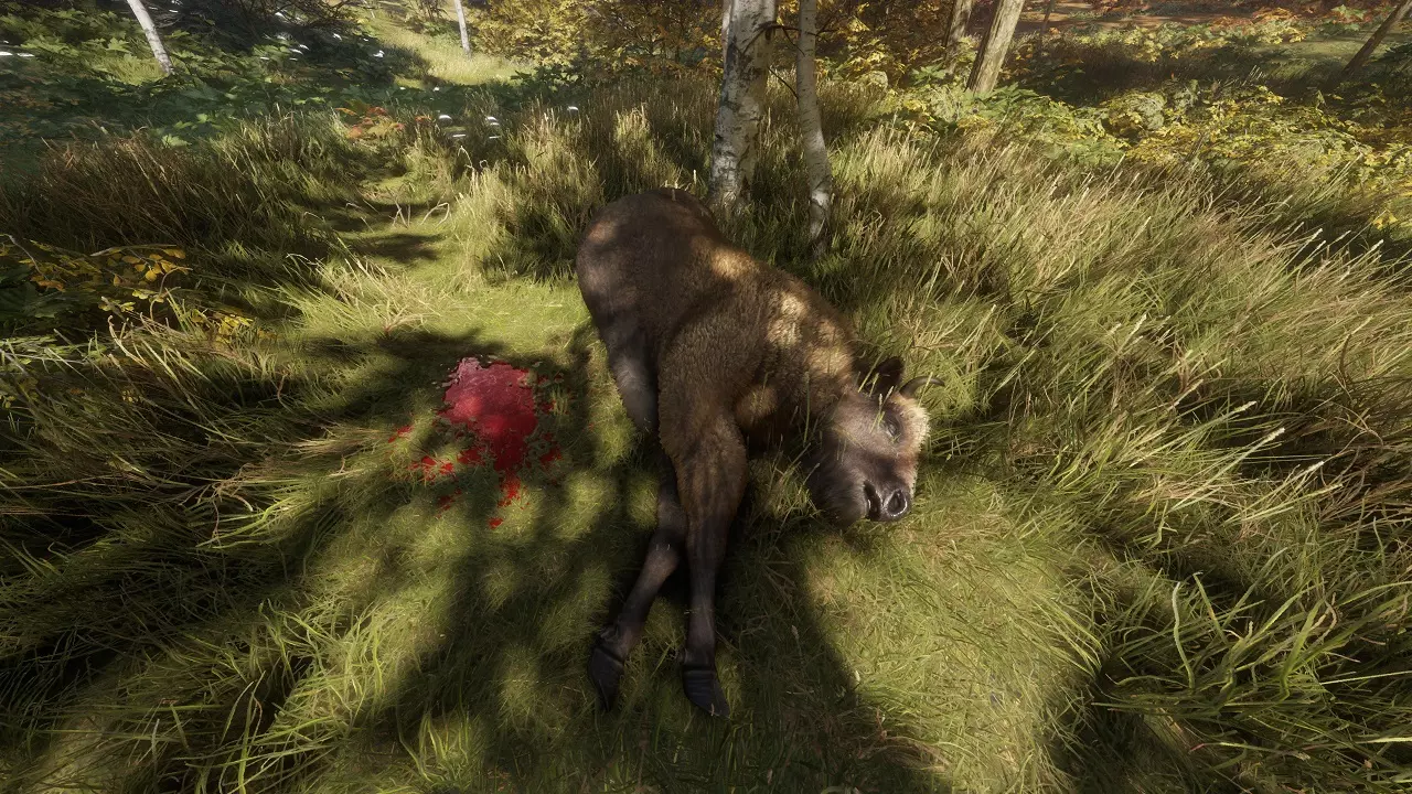 Remember our earlier lesson? Let's review it. You'll want to place your shot into the heart-lungs area, from a broadside shot of the animal. You want to avoid shooting through thick muscle and especially avoid shooting through bone. This means you should look to take a shot at the animal's broadside, and put it about a third to halfway up the chest, behind the front leg. For a more in-depth guide, and as you move on to different quarry, check out Frorton's great guide: https://steamcommunity.com/sharedfiles/filedetails/?id=877148380 Great distances will affect how you place your shot, but within 100m- you should not shoot any further than this for now, and in fact try to get as close as you can- no compensation for bullet rise or drop is necessary. Wind also won't be a factor at this distance. There are some no-nos. Unlike other FPSs, do not go for head shots. It's very difficult to penetrate the skulls of most animals, and you're very likely to miss and hit the jaw instead- which is not a lethal kill. Imagine a deer running around with its jaw flapping in the wind. You should never be the cause of something like that. If the animal is quartering- not directly sideways or head-on, but turned slightly towards or away from you- you could still try to take the shot. Quartering away (animal is facing away from you) is a little easier than quartering towards (animal is looking at you), but of course broadside is always preferred. When quartering away, use the animal's leg further away from you as a reference instead of the nearer leg. When quartering towards, use the front of the shoulder of the nearer leg as a reference. Since you're starting out, you should simply wait for a broadside, then take the time to examine the animal's x-ray after you harvest it. Patience is a virtue in this game! An animal facing away from you is a gigantic no-no in real life. Same for when the animal is facing towards you. Learn proper shot placement first. With the changes to hunt scoring, going for spine or brain shots is now penalized in most cases. Stick with what works. Pulling the trigger Stabilize yourself. Stop moving, secure a firing position- either crouched or prone. Avoid shooting while standing. Hold your breath. Steady your aim. Squeeze the trigger gently. In theHunter as in real life, jerking on the trigger will throw your aim off-course. Squeeze it slowly and purposefully. Observe Don't release your aim yet. Look at the animal. Remember where you shot it. Did it fall where it stood? If not, which direction did it run off in? If it ran off, you will need to stalk it all over again. It's good ethics to never leave an animal running around wounded- put it out of its misery. If you downed an animal, you will notice a purple circle area on your HunterMate and your map around the area where the first bullet hit it. This is hunting pressure, and it shouldn't affect you for now- just note that, if you're ever doubting if an animal died from one of your shots, look for the hunting pressure to appear as soon as it dies. As you hunt and harvest more animals in an area, hunting pressure will increase and start to overlap. Animals will start avoiding areas with high levels of hunting pressure, meaning that you will have to change your hunting grounds. As well, need zones in areas of high hunting pressure will disappear. The good news is that hunting pressure disappears over time and with harvests in different locations. Also, hunting from a tree stand or a tripod immensely reduces the hunting pressure from any harvest. Skin Sometimes an animal doesn't die where it stands. It runs away, and takes some time to bleed out. If it dies, you will see hunting pressure appear- a purple circle area on your HunterMate and your map centered on where it first got shot. In real life, if the animal doesn't fall where it stands, it's generally recommended to wait for at least half an hour before starting to track it. Going after it right away risks spooking it and sending a rush of adrenaline through it, making it run away and take longer to expire naturally. You can apply the same thinking to theHunter. If the animal doesn't fall where it stands, make a mental note of where it fell and which direction it ran off in. Then wait and check your map until you see the hunting pressure appear, which is a sign that it has died. Now you can begin tracking it. Look out for bloodstains. These are clear signs that you hit an animal. Once you've found the first bloodstain and examined it, if you approach another trail marker and it glows blue instead of white, then you know that you're on the trail of the right animal. Look for tracks that show the animal running- that means it was fleeing after it took the bullet. You may have to track it for a very long time! A large splatter means that you hit a vital organ, but doesn't mean the animal will die very quickly- the size of the next splatter will tell you how fast it's losing blood. If you leave a dead animal unharvested, that's unethical in real life, and in theHunter it is penalized by you forfeiting any accumulated consecutive harvest bonus. Tracks are sometimes interrupted. If you cannot find the next set of tracks, broaden your search area. It's usually enough to simply look a little further to the left or right, but sometimes you need to start at a known track (most commonly a blood splatter) and move in an ever-widening circle to look for the next blood splatter. The cones are generally accurate, but many tracks are at the edge or slightly out of the edges of the cones. If it's at night, make sure your headlamp is on!