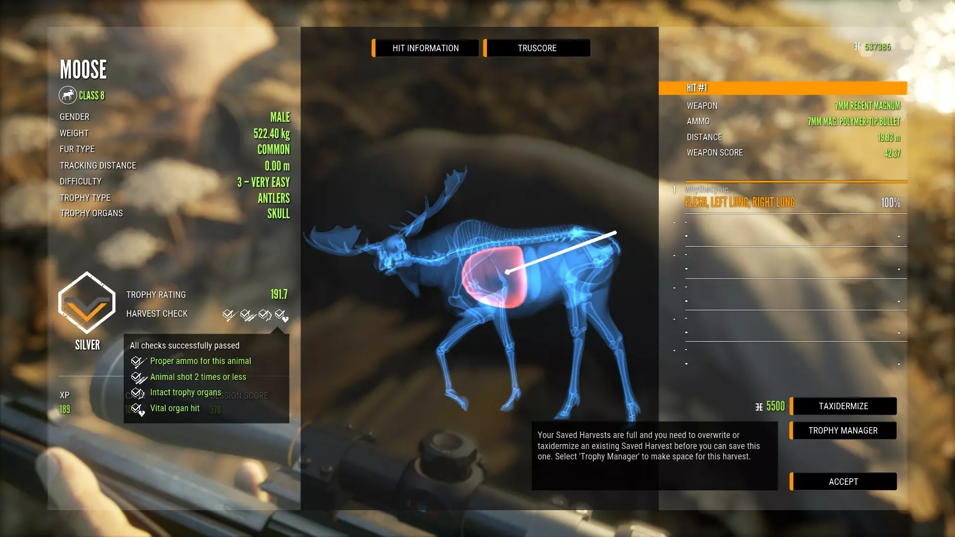 Once you find the downed animal, you will see it lying in a pile. It will glow blue. Move closer until you see the prompt to interact with it. Congratulations, you've harvested your first animal! Don't hit "accept" immediately. Take the time to look at the screen. This will be the best learning experience for you. You can see where your shot(s) landed on the animal. You'll get an x-ray of the animal in the pose the bullet hit it in, which is useful for anatomy lessons and especially useful for learning how the animals move. You can click and drag the x-ray to look around. On the left, you'll see the trophy rating for the animal, which is purely based on its trophy characteristic- antlers, skull size, weight, and so on depending on the species. Below it is the harvest check, which shows you how well you hunted the animal. If you used the proper ammo, shot it 2 times or fewer, hit it in a vital organ, and did not hit any trophy organs, you will achieve the maximum score for this particular harvest. This drives home the importance of responsible hunting! Next Steps Congratulations! You've successfully shot your first deer. It took a lot, but all the lessons you've learned go directly to your next hunt. As you hunt, you might want to take on different kind of game. You'll want bigger rifles (at first, at least), better sights, and better lures. You'll wonder what skills and perks to get. What's your playstyle? Are you more of an ambusher, relying on calls and scents? Or are you a stalker, stealthily creeping through the woods? I personally am more of a deerstalker. I got the Stalker skills that improve my stealth, and the skill that lets my HunterMate connect the dots. Most of my perks so far have been rifle perks. Note that the Zeroing perk will be useless until you're shooting at very long range, or if you're hunting with bows- within 150m, your rifles shoot essentially flat, and the short-range zero is useless for rifles. Try out polymer-tip ammo and see if it works better for you. If all else fails, you can go back to soft-nose. Although, to be honest, you probably won't notice the difference until you've put quite a few more hours into the game. If you want a new scope, the 4-8x scope is much better than the 8-16x, since you'll only rarely be shooting at really long ranges. I'd get that first instead of saving up for the big one. As for new rifles, I'd save up for a 7mm first, which will take down classes 4-9 and is extremely useful in general, though I'd still buy a bigger rifle if you plan to regularly go after class 9. A .270 rifle is also a decent first purchase, and puts you in the running for bigger game, but not the biggest. A .223 rifle is useful only if you plan to shoot lots and lots of Canada geese and red fox. Avoid the lever-action rifles until you're more familiar with the game- there's just not enough money to splurge on everything, especially since you'll need to buy a separate sight for them. The inventory system is actually very simple. You have 2 storage locations- your stash, shared between all outposts, and your backpack, which you carry with you. So after buying something, you need to move it from your stash to your backpack. This is done from inside the "Backpack" tab in the outpost menu. Once something is in your backpack, you still need to assign it to a hotkey in order to use it. If you're equipping a weapon, you must assign it ammunition, and optionally assign it sights. Yes, you can re-use a single sight for multiple rifles! This is done from the "Inventory" screen in the pause menu. Remember that tripods and tree stands greatly reduce hunting pressure, and too much hunting pressure will push animal populations out of an area. Tents act as fast travel / store points, and I usually pair them up with each other. Once I've found a good hunting spot close by lots of need zones, I put down a tripod or tree stand about 100-200m away, and a tent next to it. This lets me fast travel there without spooking animals, use callers to bring them in, and then harvest many animals without creating too much pressure. Bird hunting is a different matter altogether. You'll want a shotgun and birdshot, the appropriate bird callers, the decoys do help (up to 20 in the same location), and then lots of patience. However it is easy once you get the hang of it, and historically bird hunting has put food on many tables. Have fun, and good hunting! Bugs and Fixes theHunter has many bugs, some worse than others. Weapon disappears Sometimes your weapon disappears. Your HUD changes, but you don't see it in your hands, and you can't aim with it. This happens usually when switching between items very quickly. To fix this, hit the Holster hey (H) twice. Weapon keeps reloading after aiming down sights This is extremely irritating for single-shot rifles, and usually happens after a session at the shooting range. Unfortunately there is no fix for this that I've found other than actually shooting a round of ammo. GEESE Geese are horribly bugged. Sometimes (especially during rain) you'll see solo geese fly really slowly and not go anywhere. Don't shoot these, unless they're literally right in front of you and you have a deer rifle- they're invulnerable at long range to the usual weapons. There's no fix for these other than leaving and rejoining the game. Map doesn't load It takes some time. Give it a couple of seconds for the textures to load properly.