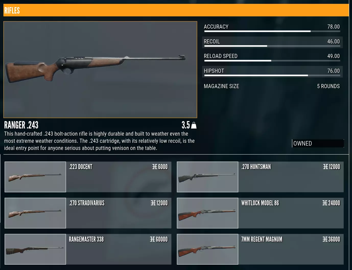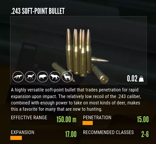 我建议一直开启它。十字准星比机械瞄具更容易瞄准射击。即使你紧挨着猎物,也可以一直缩小视野,同时仍能保持精确的瞄准线。 另外,我建议跳过最贵的瞄准镜【Argus 8-16x50】。它只在非常特定的场景下有用,而且会让近距离射击变得更困难。【Hyperion 4-8x42】是一款适用于各种用途的优秀瞄准镜。 弹药 你一开始使用的是.243软尖弹。这种弹药的软铅弹头暴露在外,击中目标时铅弹头会膨胀,造成更大的伤口和更多伤害。然而,这会导致穿透力降低和空气动力学性能变差,意味着子弹的精准度不高,下坠速度也更快。另请注意,建议对2-6级的动物使用。在每种动物的图鉴条目中,你可以查看其等级评级。