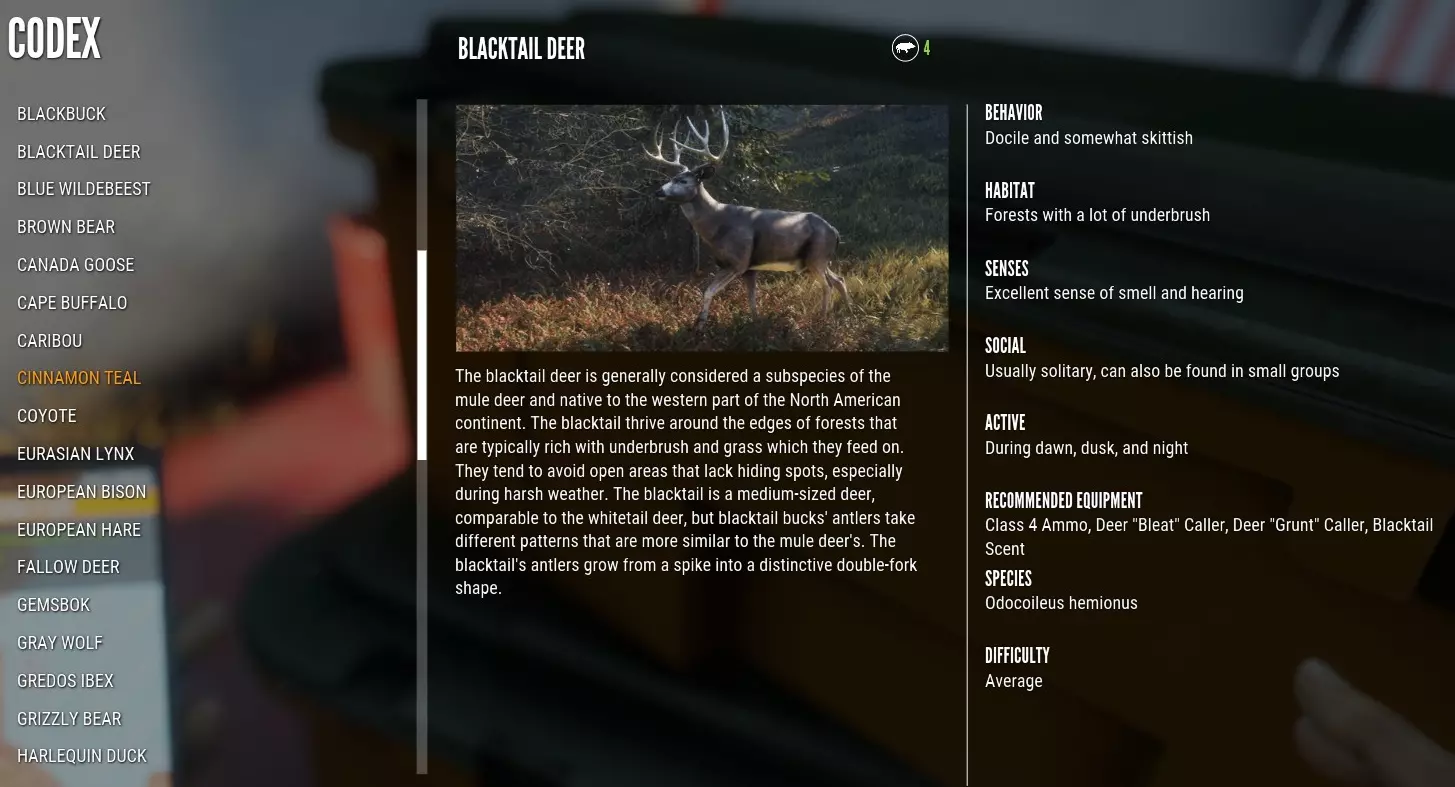 不过,在150米范围内,只要瞄准得当,这款子弹对所有预期目标乃至更多目标都具有致命性。更棒的是,这款子弹始终可以免费购买。请注意,它并非用于爆头。 当.243聚合物尖头弹可用时,你可能会忍不住购买。这种子弹飞行更稳定、射程更远,穿透力也更强,这意味着即使角度不佳,你也更有可能命中要害。 在现实中,这类子弹的聚合物尖头实际上有助于子弹膨胀,对软目标造成严重伤害。但在这款游戏中,聚合物尖头弹的膨胀程度明显低于软尖弹。 你会注意到区别吗?其实不会。用保罗·哈雷尔的话说,精准瞄准是无可替代的。我在游戏里用了一段时间的聚合物弹头(现实中聚合物弹头确实很不错),之后又换回了软尖弹,只是因为这种弹药更便宜。 商店里也有一些步枪的全金属被甲弹,这样你就能像卡拉莫乔·贝尔那样,放心地瞄准脑部射击。不过说真的,除非你真的是卡拉莫乔·贝尔,否则永远都不该尝试脑部射击。 猎物 了解你的猎物至关重要。你要猎捕的是什么动物?它的行为模式是怎样的?它对视觉、气味和声音的敏感度如何?在什么时间、什么地点可以找到它?它的要害部位在哪里?使用多大口径的武器射击它才合适?所有这些问题在狩猎的各个阶段——发现、追踪、射击和剥皮——都会变得非常重要。打开暂停菜单,选择【法典】,然后点击【野生动物】。阅读你将要狩猎的各种猎物的相关信息。在物品栏中查看你使用的步枪和弹药,确认它们是否适合该猎物。注意,从下方截图可以看出,黑尾鹿属于4级猎物。由于.243软尖弹适用于2-6级猎物,因此它适合猎杀黑尾鹿。