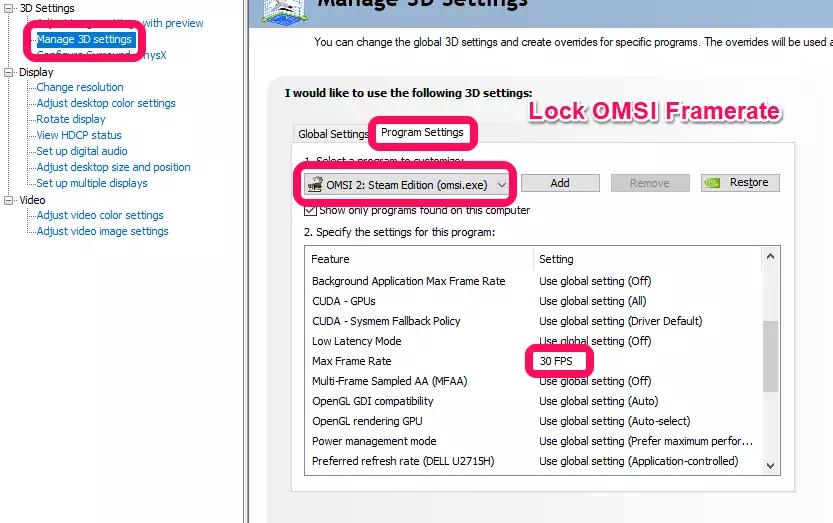 3. 按以下设置流动缩放比例:4K=50,1440P=75,1080P=90。 4. 垂直同步可开可关,这取决于个人偏好。在Lossless Scaling中启用垂直同步可以修复屏幕撕裂,但会增加输入延迟;禁用垂直同步会导致屏幕撕裂,但能减少输入延迟。由于Lossless Scaling默认会产生输入延迟,部分玩家可能更倾向于禁用垂直同步。 5. 现在跳至下一步【启动Omsi 2】。 帧生成方法2(可选):固定帧生成 1. 还有另一种提高Omsi 2帧率的方法,同样使用Lossless Scaling。此方法可能会带来更稳定的帧率。该方法需要你先锁定Omsi 2的帧率。此步骤中,你需要打开英伟达(或AMD)控制面板,并锁定【巴士模拟2】的帧率。以下截图展示了如何在英伟达控制面板中将【巴士模拟2】的帧率锁定为30 FPS。将【巴士模拟2】锁定到你在游戏中能达到的最低稳定帧率。我个人的情况是30 FPS,其他人可能会更高。不建议将帧率限制在30 FPS以下。
