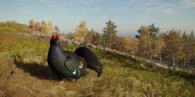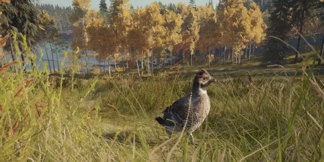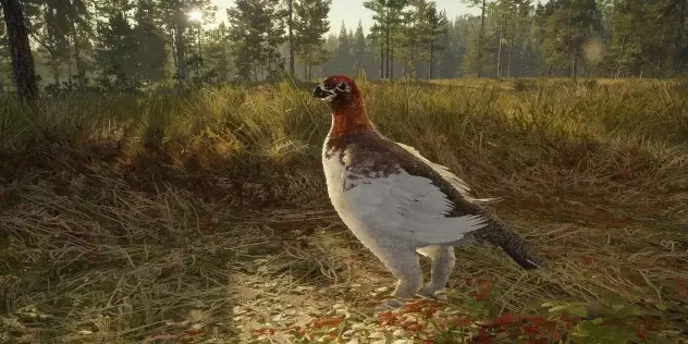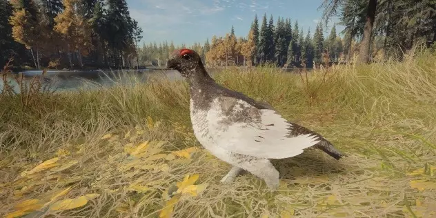 (8级)驼鹿:最高等级5级或传奇等级10级 所需区域: 饮水时间 - 12:00–16:30 觅食时间 - 4:00–8:30及16:00–20:30 休息时间 - 00:00–4:30、8:00–12:30及20:00–00:30 毛皮:棕色、浅棕色、深棕色、棕褐色、花斑、白化、黑化 传奇个体:传奇云杉色、传奇双色、传奇灰烬色、传奇桦木色、传奇橡木色、传奇斑点色 钻石奖杯分数及最大重量:274.9+及620千克(1367磅),传奇个体:700千克(1543磅) 步枪:6.5毫米、.270、45-70、30-06、7毫米、.303、.308、.50米尼弹、9.3×74R、.300、.338 手枪:.44、.454 霰弹枪:12号口径独头弹、10号口径独头弹 弓与弩:600格令箭、600格令弩箭、700格令箭 注:摩卡毛色仅可通过蒂阿罗瓦国家公园的任务获得,所有人都能在那里获取。 梅德韦泰加国家公园 松鸡