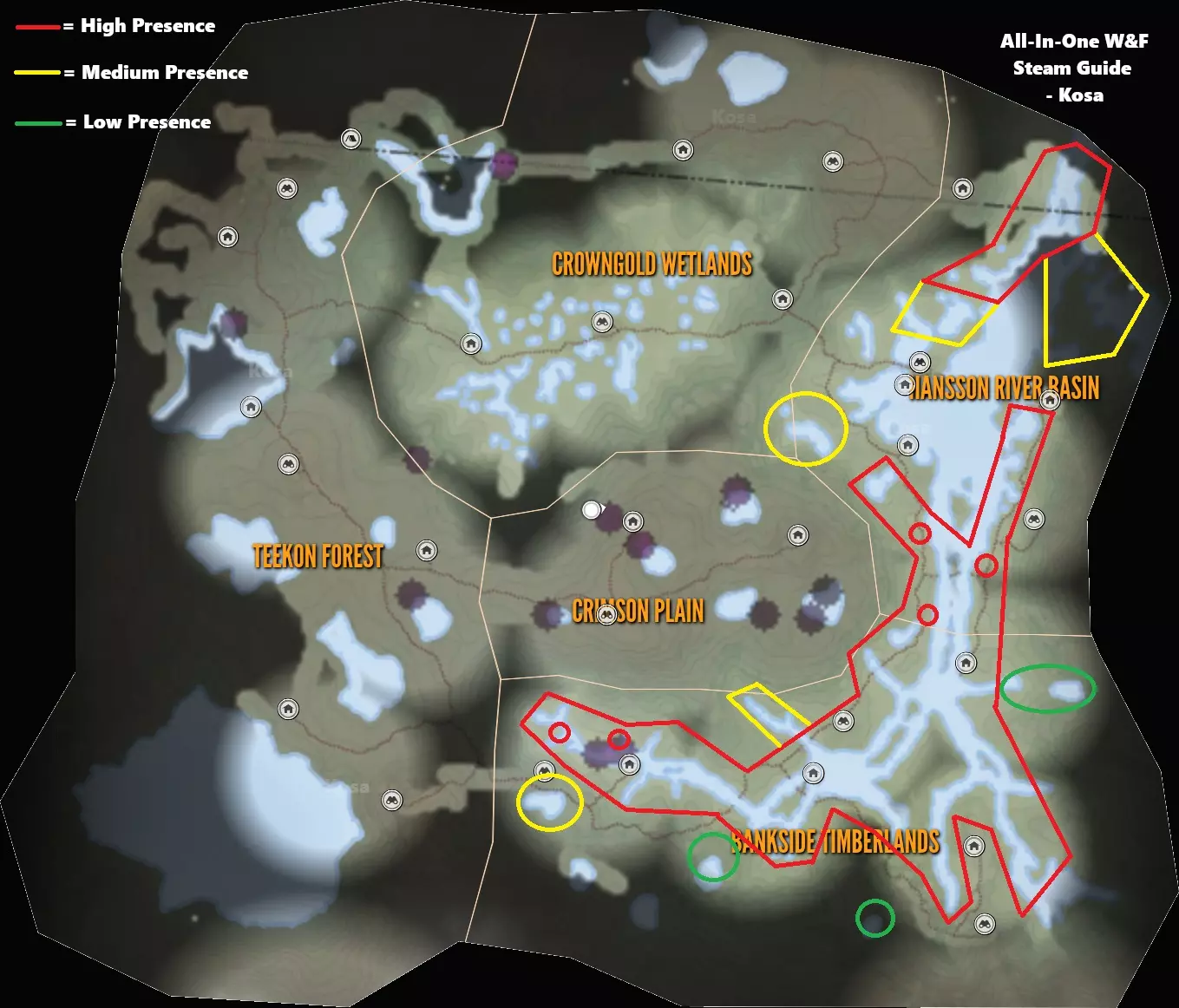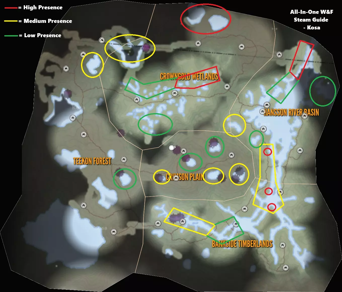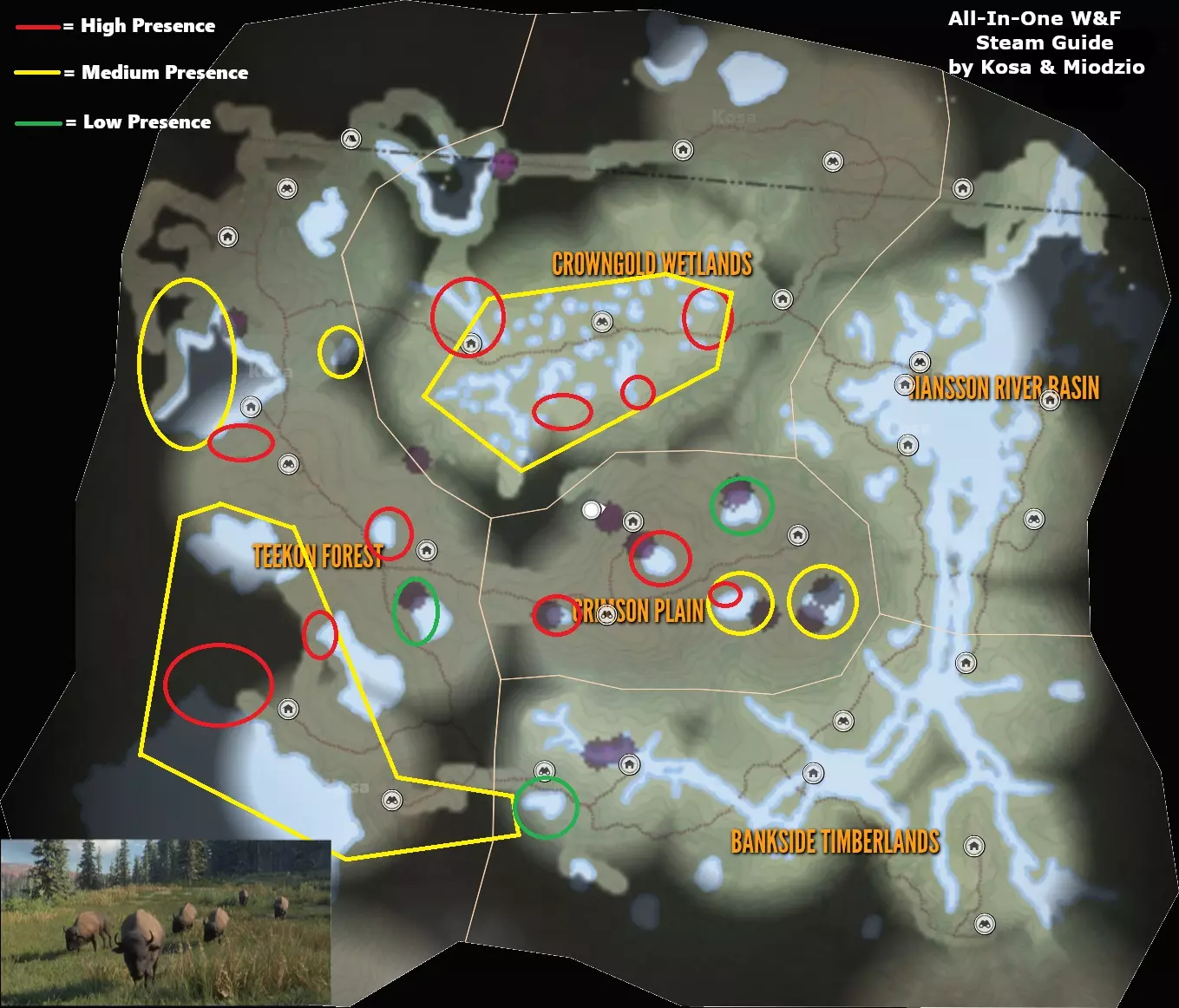 【9级】水牛:最高等级9级(TruRACS) 需求区域: - 饮水:12:00–15:30 - 进食:6:00–9:30、9:00–12:30、15:30–18:30 - 休息:00:00–6:30、18:00–21:30、21:00–00:00 毛皮:黑色、棕色、灰色、橙色、白化 钻石奖杯分数及最大重量:167.54+,1250千克(2756磅) 步枪:.45-70、7mm、9.3x74R、.300、.338、.470 手枪:.454 霰弹枪:10号口径独头弹 弓与弩:600格令、600格令弩箭、700格令 育空谷 丑鸭