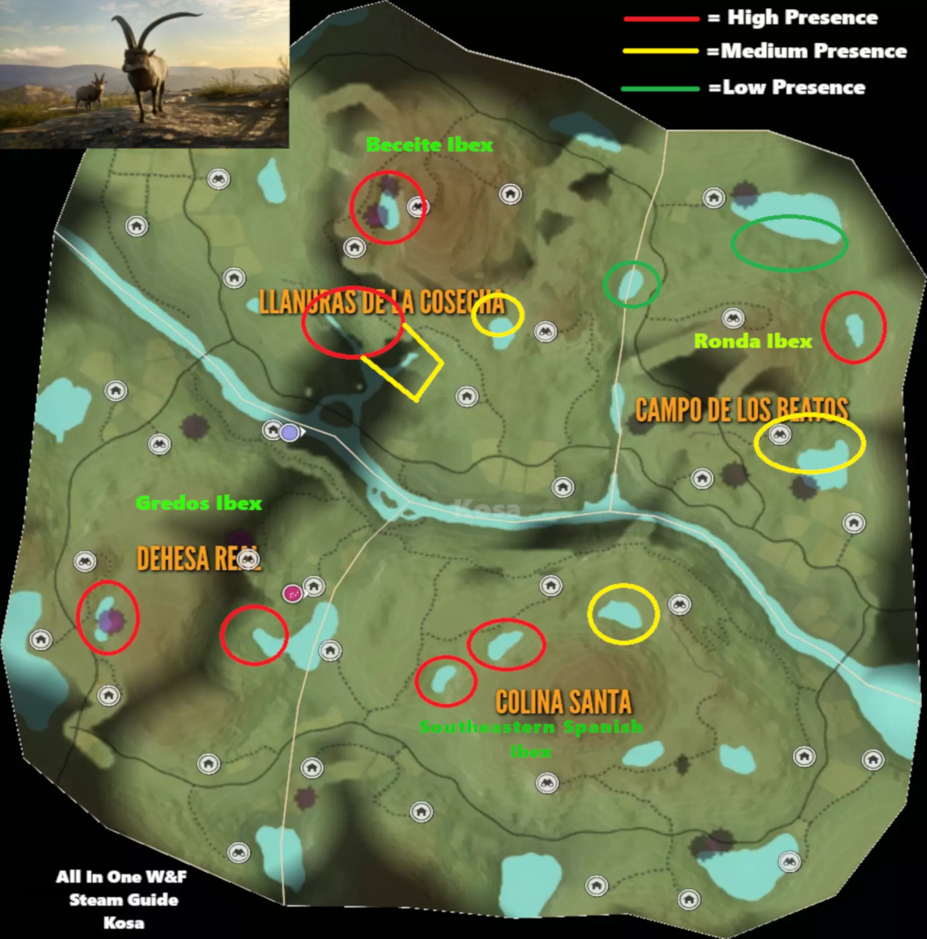 (4级)贝塞特羱羊、格雷多斯羱羊、朗达羱羊、西班牙东南部羱羊: 最大等级5级(真实动物评分系统) 所需区域:饮水时间:10:00–14:30 觅食时间:00:00–4:00及17:00–21:00 休息时间:4:00–7:00及21:00–00:00 毛皮:贝塞特羱羊 - 浅黄色、浅棕色、橙色、棕混合色、灰色、灰棕色、白化、黑化 格雷多斯羱羊 - 浅黄色、棕混合色、灰色、灰棕色、棕色、白化、黑化 朗达羱羊 - 浅黄色、棕色、棕混合色、灰色、灰棕色、白化、黑化 西班牙东南部羱羊 - 浅黄色、浅棕色、浅灰色、棕混合色、灰棕色、橙色、白化、黑化 钻石奖杯分数及最大重量:朗达羱羊:107.9+及70千克(158.7磅) 西班牙东南部羱羊:89.6+及87千克(189磅) 格雷多斯羱羊:100.1+及102千克(227磅) 贝塞特羱羊:191.6+ & 110公斤(242磅) 步枪:.223、.45气枪、.243、.30-30、.303、.308、.50、7.62x54R、6.5毫米、.270、45-70、30-06、7毫米 手枪:.45柯尔特、.357、.44、.454 霰弹枪:16号鹿弹、12号鹿弹、20号独头弹、16号独头弹、12号独头弹、10号鹿弹 弓与弩:420格令、420格令弩箭、540格令 野猪