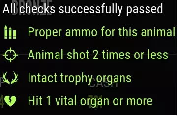 【1级】绿头鸭:最高等级3 羽毛类型:花斑、棕杂交、黑棕、金色、黑化、白化 钻石奖杯分数及最大重量:19.6+ 及 2.1千克(4.6磅) 步枪:.22LR/H 手枪:.22LR 霰弹枪:.410号鸟弹、20号鸟弹、16号鸟弹、12号鸟弹、10号鸟弹 弓与弩:300格令、300格令弩箭、350格令 欧洲野兔