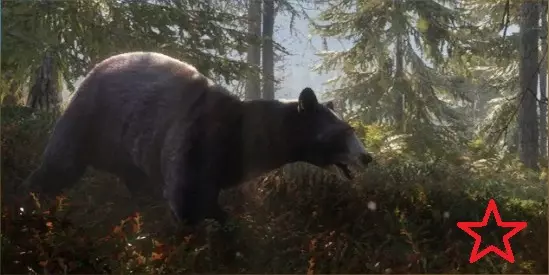 (7级)黑熊:最高等级9级或传奇等级10级 需求区域: 【饮水】- 10:30–12:30及15:00–20:30 【进食】- 5:30–10:30 【休息】- 12:30–15:00及20:30–5:30 毛皮:深色、黑色、暗灰色、肉桂色、金色、棕色 传奇毛皮:冰川色、奶油色、斑点色、灵魂色、栗色 钻石战利品分数及最大重量:22.8+分及290千克(639磅),传奇:409千克(902磅) 步枪:7.62x54R、6.5毫米、.270、45-70、.303、.308、.50、30-06、7毫米、9.3x74R、.300、.338 手枪:.44、.454 霰弹枪:20号口径独头弹、16号口径独头弹、12号口径独头弹、10号口径鹿弹/独头弹 弓与弩:420格令箭、420格令弩箭、540格令箭、600格令箭、600格令弩箭 落基山麋鹿
