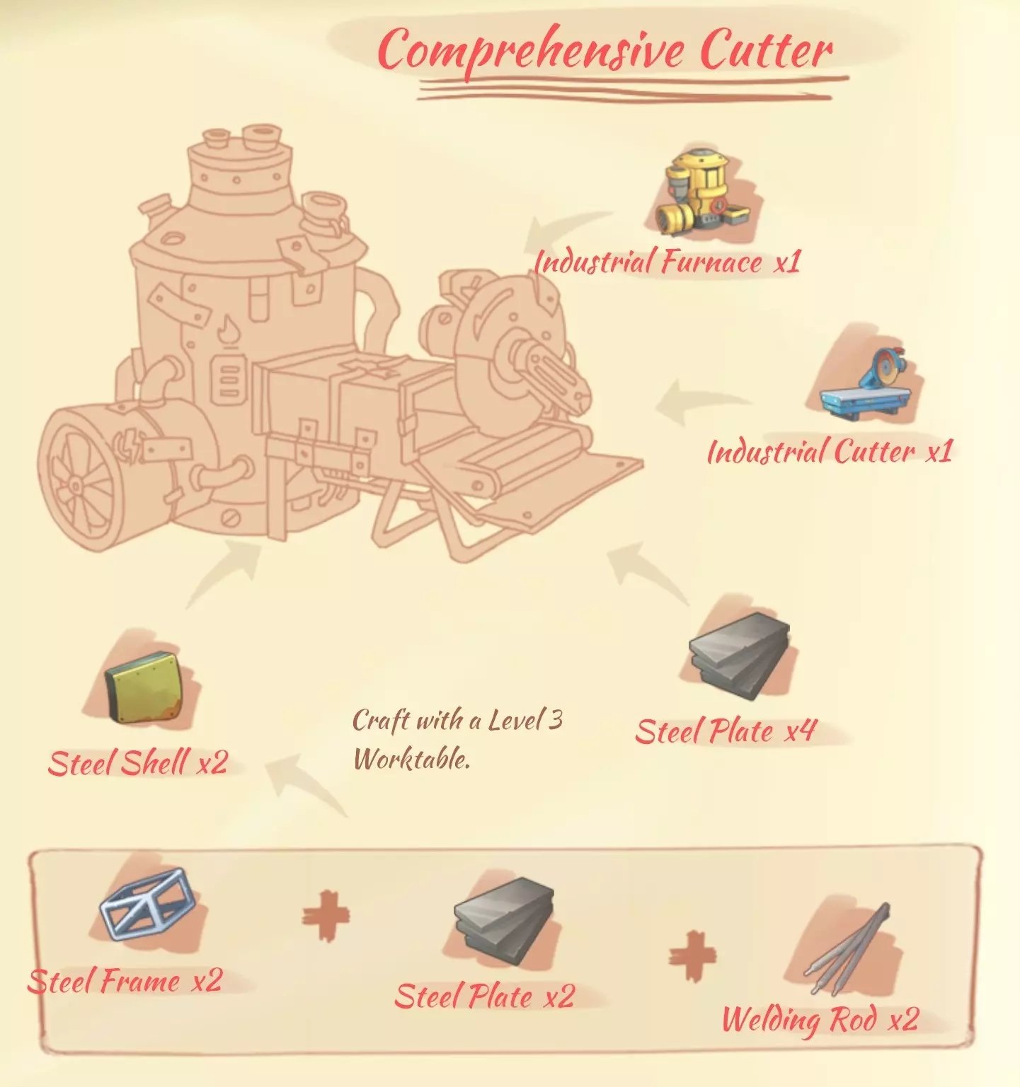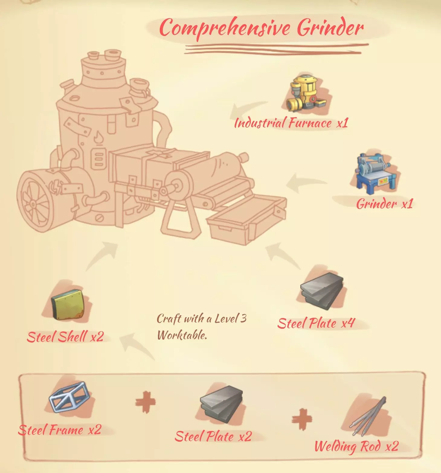 资源: 与之前的熔炉所需资源相同,新增: 锰钢锭(manganese steel bar):4个铁矿石,1个锰矿石。 焊条(welding rod):3个锡矿石,1个铜矿石。 高级削片机(Advanced skiver)