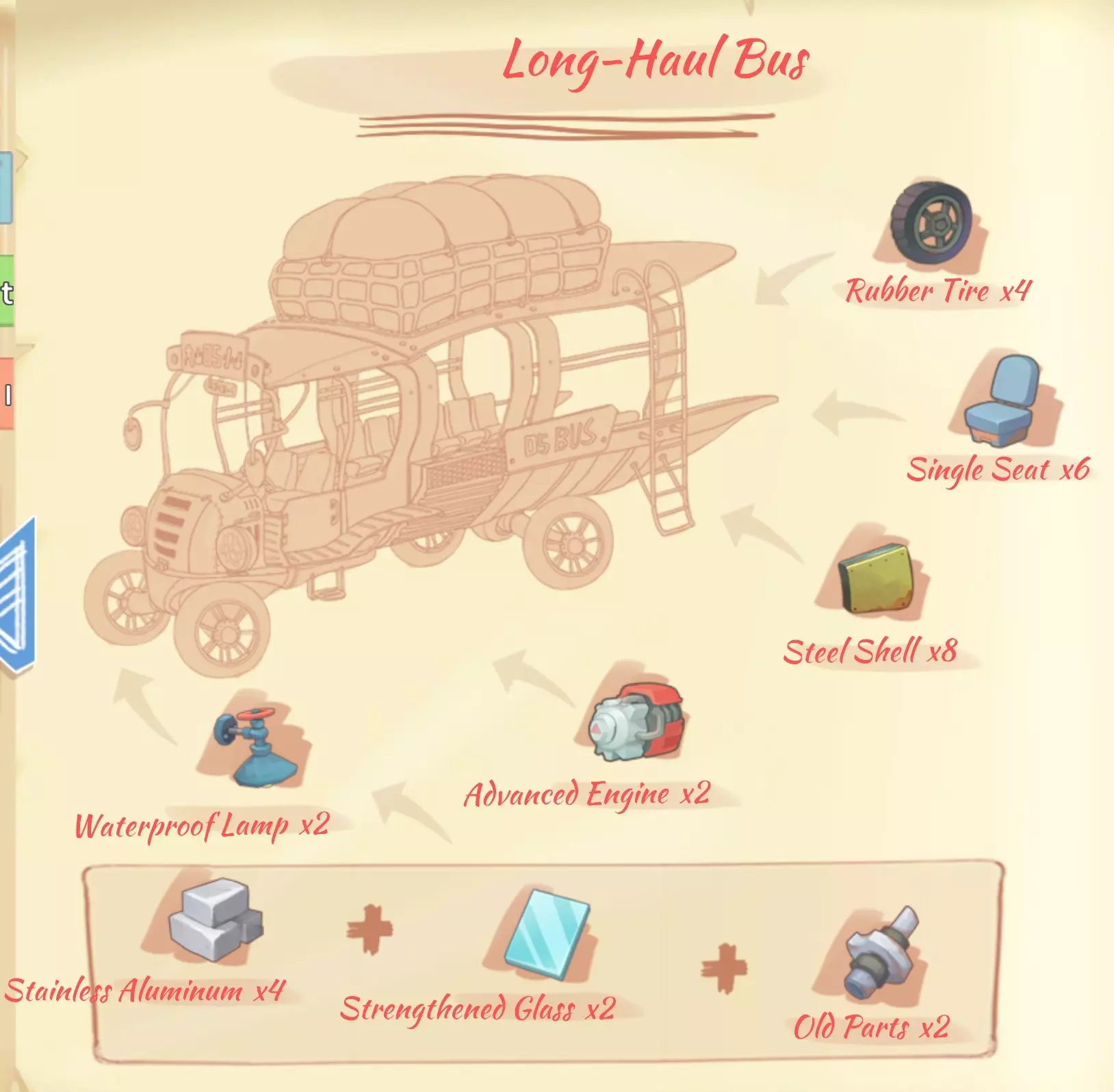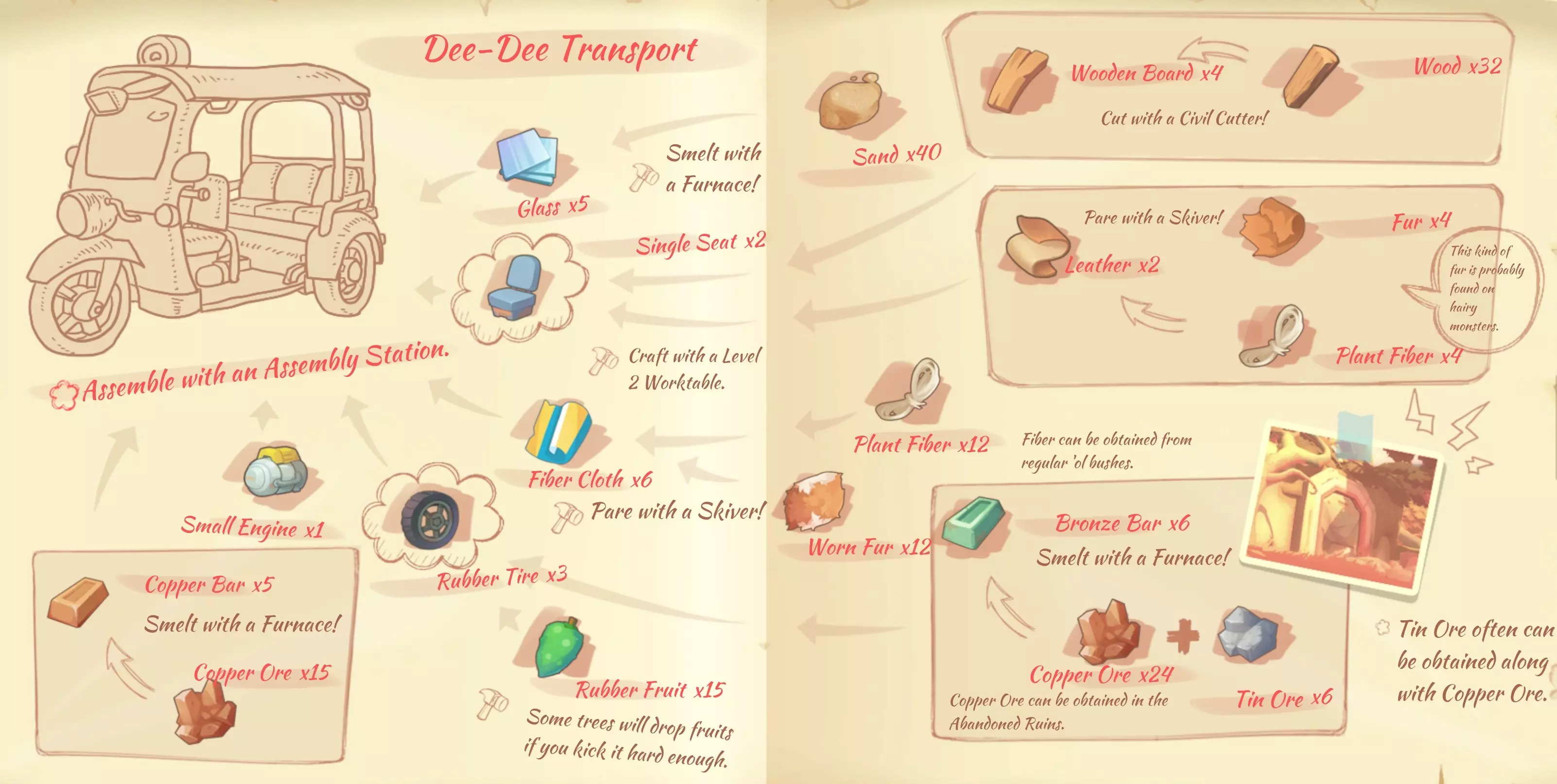 迪迪运输:1个小型发动机,3个橡胶轮胎,2个单人座椅,5块玻璃,6块纤维布料,5个铜锭