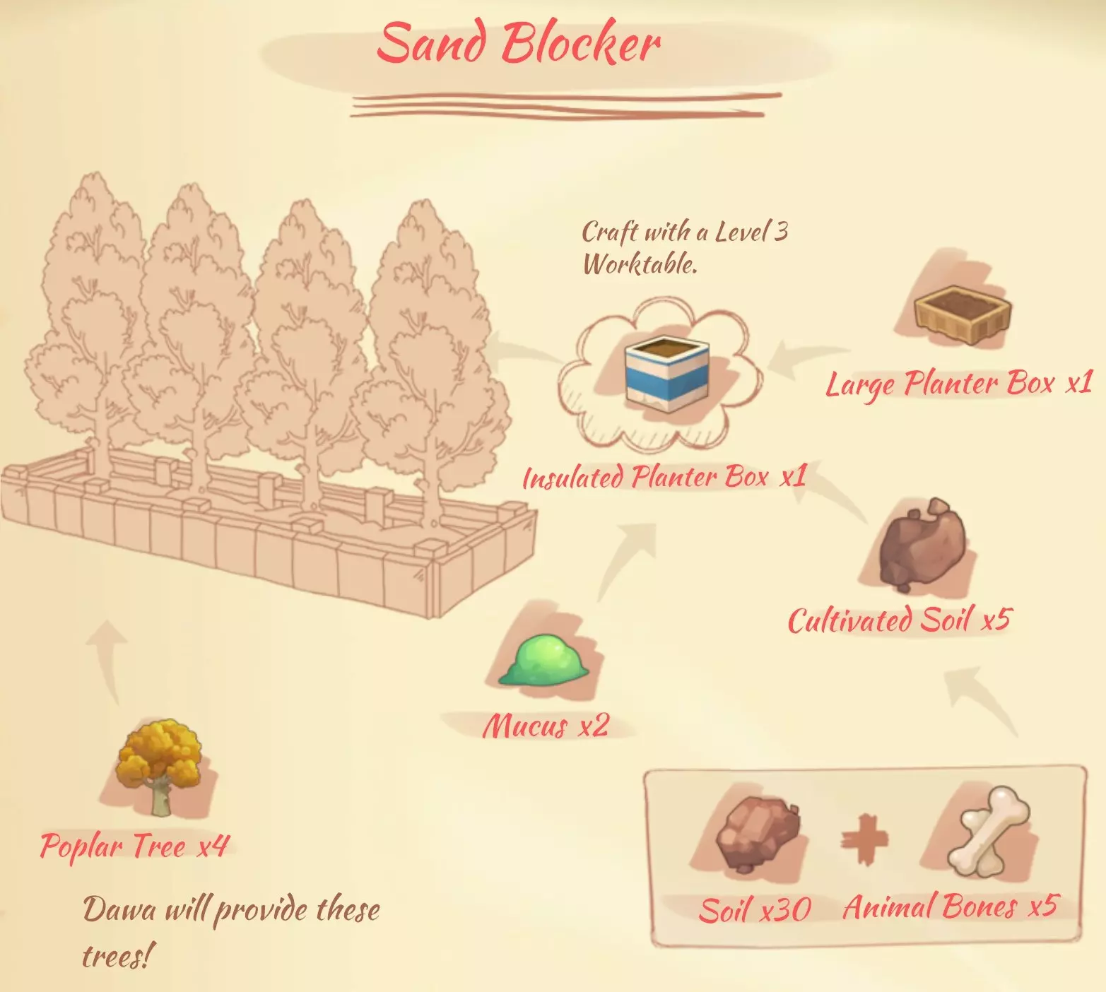 钻井机(The Driller):1个单人座椅,3个钢制外壳,2个橡胶覆盖件,2个控制面板,1个钻头(任务获取时发放),3个工业发动机,2个大型覆盖件。 沙质阻隔器(Sand blocker):1个隔离苗床,4个杨树(由达瓦发放)。