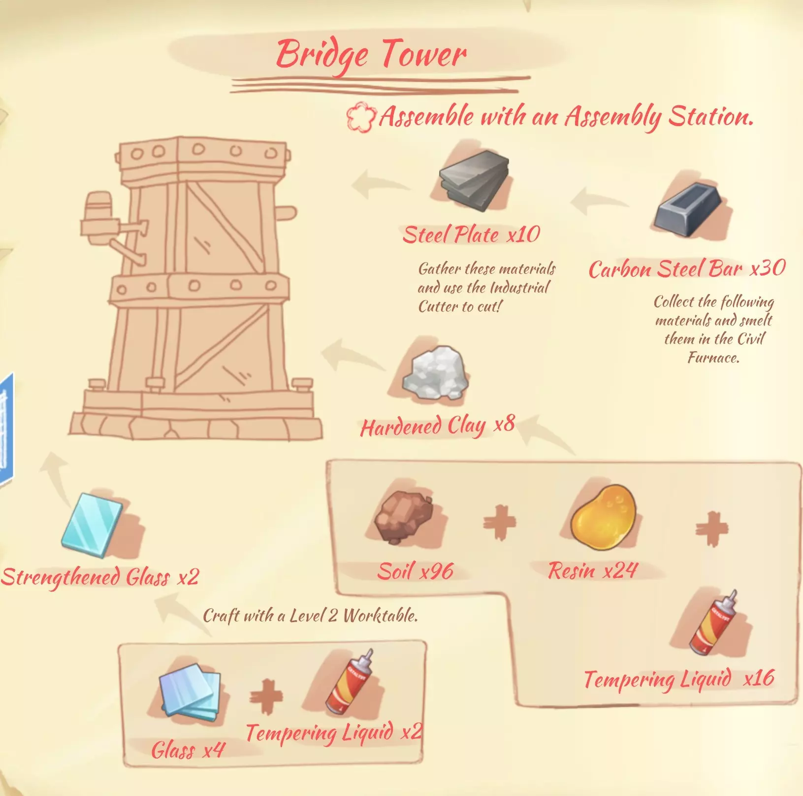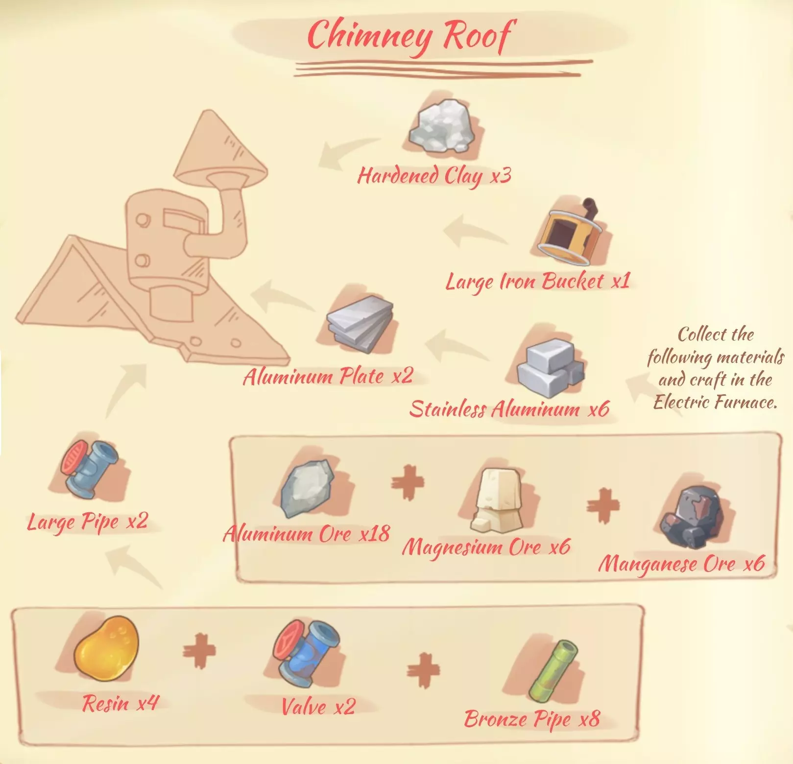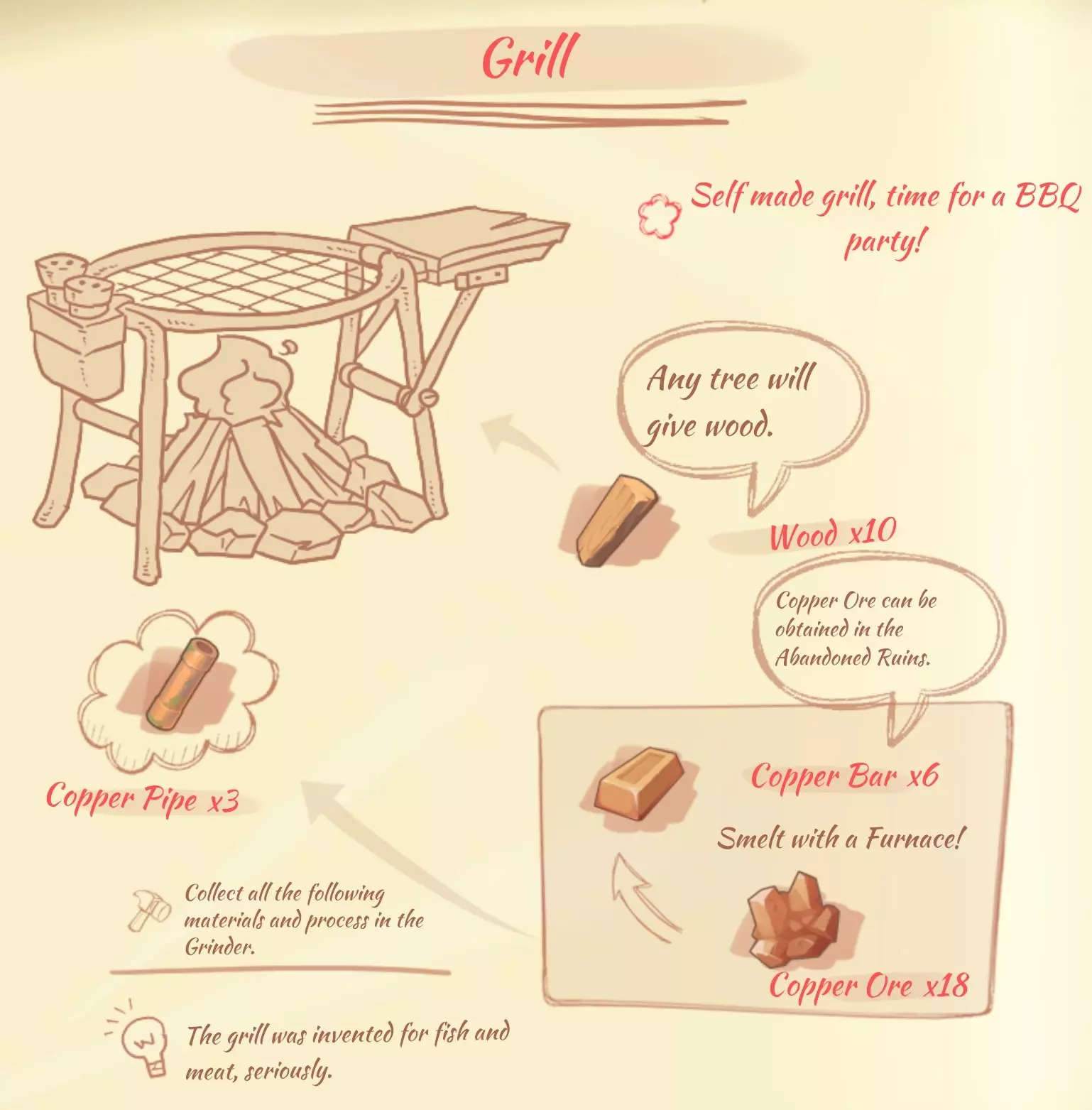 资源: 硬木板(hardwood plank):5块硬木。 铜板(copper plate):3个铜锭。 青铜板(bronze plate):3个青铜锭。 大理石板(marble plank):3块大理石。 木板(wooden board):8块木材。 烤架(Grill)