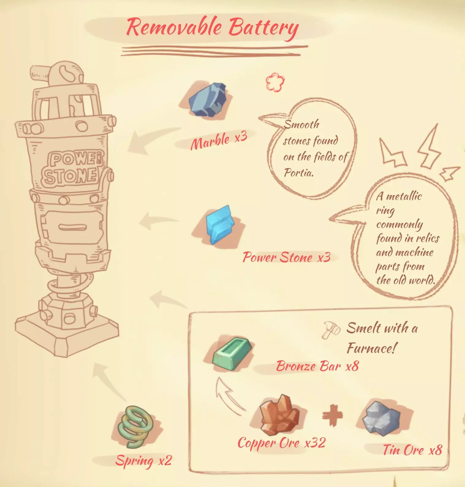 可拆卸电池:3个大理石,3个能量石,8个青铜锭,2个弹簧。