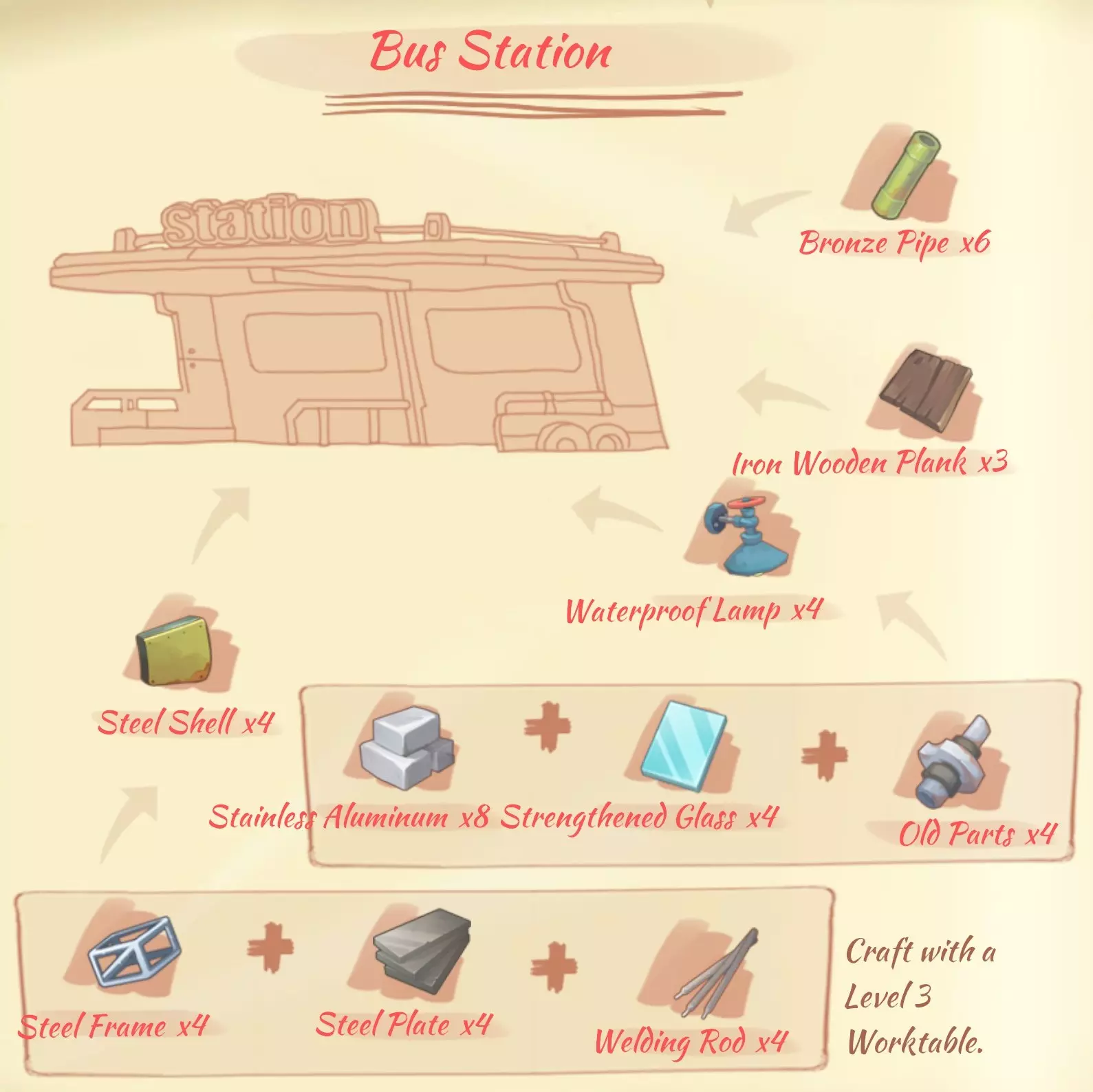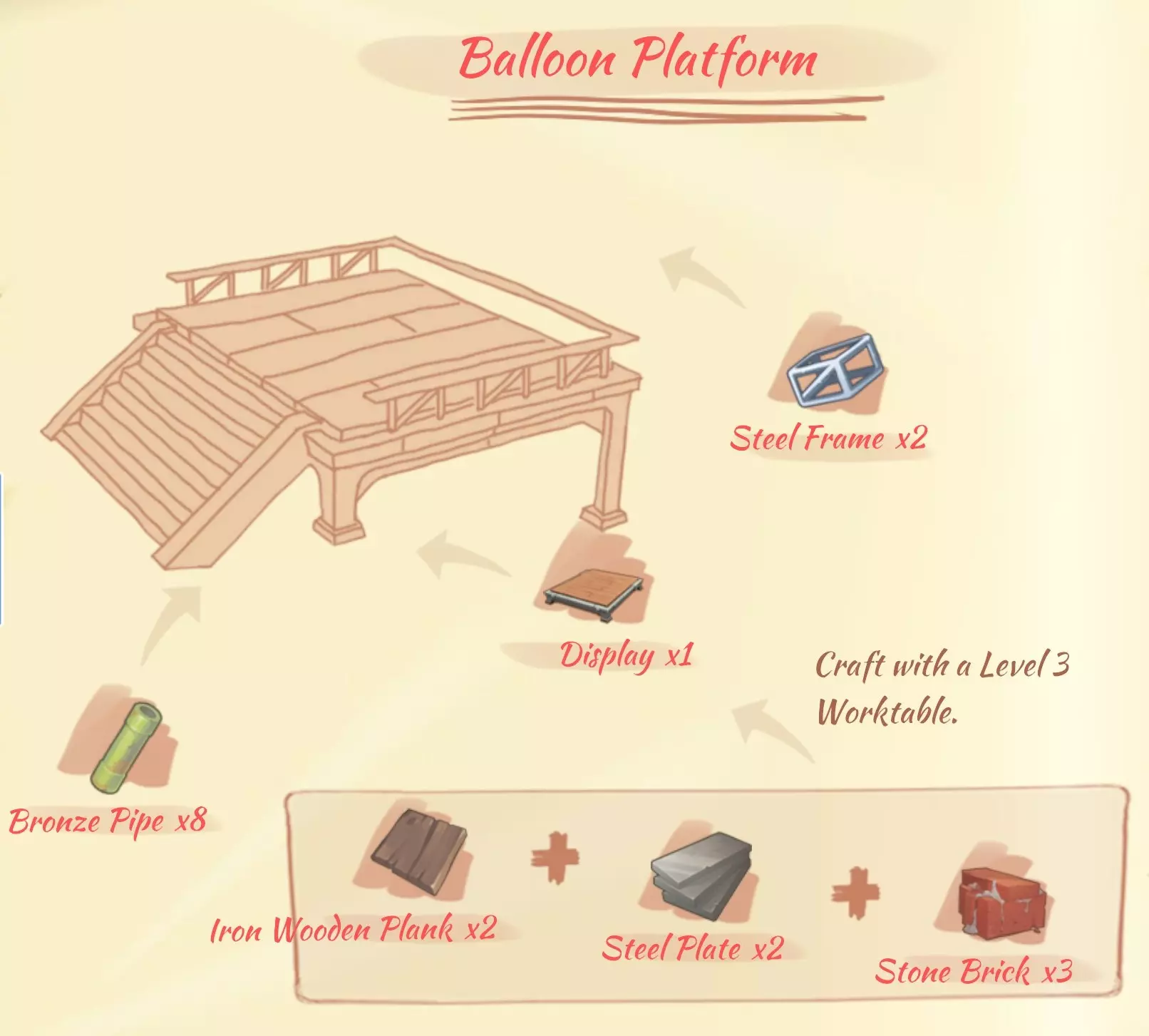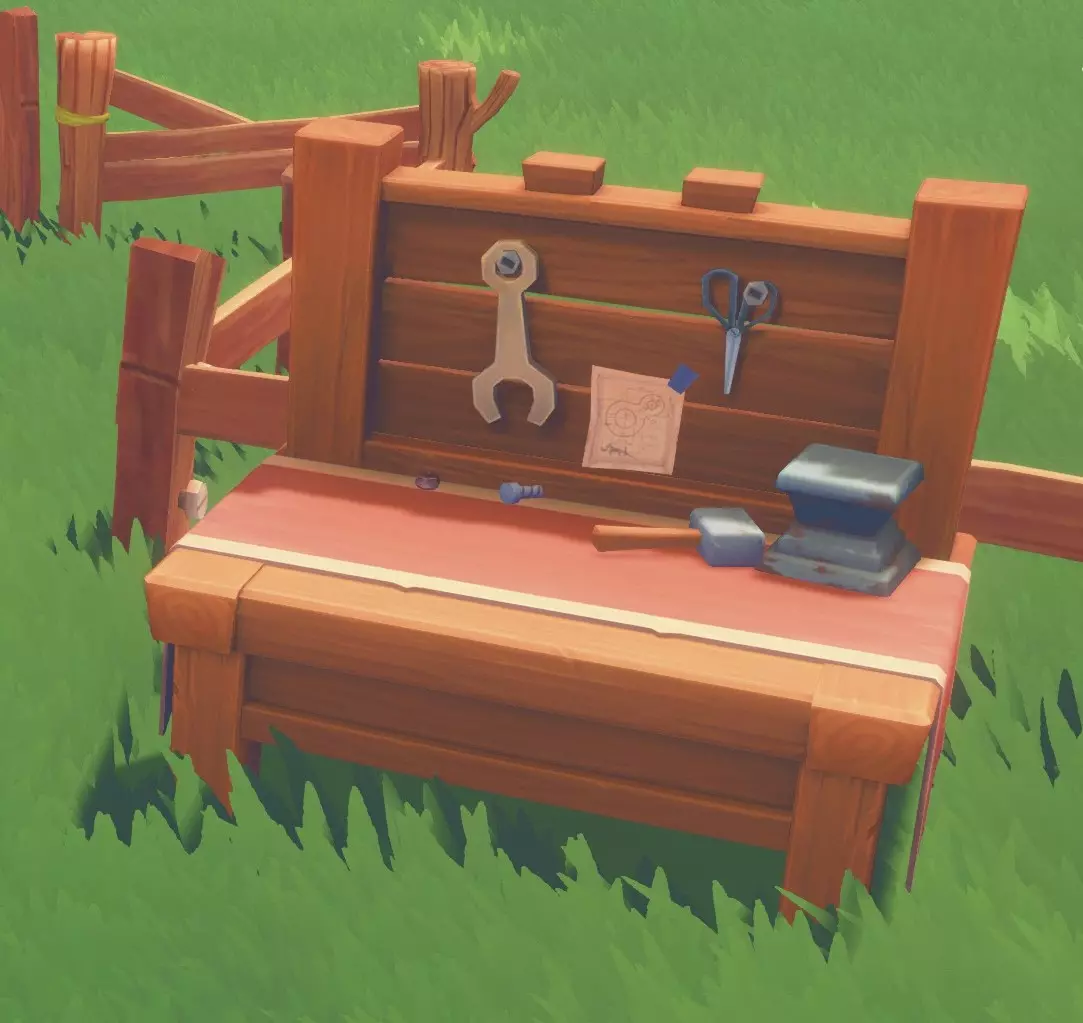 Делает все, что есть у рабочего стола 1 уровня, а так же Оружие: Бронзовый меч (bronze sword): 1 тренировочный меч, 5 бронзовый слиток, 1 набор улучшения. Улучшенный бронзовый меч (enchanced bronze sword): 1 бронзовый меч, 5 бронзовый слиток, 5 зуб. Железный меч (iron sword): 15 железный слиток, 5 кости животных. Инструменты: Железный топор (iron axe): 1 бронзовый топор, 3 железный слиток, 2 набор улучшения. Железная кирка (iron pickaxe): 1 бронзовая кирка, 2 железный слиток, 2 набор улучшения. Классическая удочка (classic fishing rod): 3 бронзовая труба, 2 дикий кокон, 1 марганцовый слиток. Снаряжение: Фотоальбом (photo album): 5 древесина, 6 ткань волокна. Маска пандамыши (panbat mask): 3 крыло летучей мыши, 2 дикий кокон. Мохнатый амулет (fluffy pendant): 5 нить, 1 разноцветный мех. Ювелирная коробочка (jewelry box): 4 кристалл, 1 сульфат. Солнцезащитные очки (sunglasses): 2 медный слиток, 1 линза. Маленькая сумочка (small satchel): 1 топаз, 2 медный слиток, 5 качественная кожа. Кристальное ожерелье (crystal necklace): 2 кристалл, 2 дикий кокон. Толстовка (casual hoodie): 8 разноцветный мех, 3 ткань волокна. Меховой шарф (furry scarf): 4 нить, 2 мягкий мех. Настольная лампа (desk lamp): 4 медный слиток, 2 медная проволока, 3 стекло. Метелка из перьев (feather duster): 3 перо из хвоста, 2 крепкая древесина. Маска для сна (sleep mask): 2 ткань волокна, 2 дикий кокон, 1 краски. Коралловое ожерелье (coral necklace): 2 звездный коралл, 2 веревка. Мебель: Настенная лампа (wall light): 2 медный слиток, 4 стекло, 2 старые запчасти. Темный кофейный стол (dark coffee table): 3 крепкая деревянная доска, 4 медная труба. Обеденный стол (dining table): 2 деревянная доска, 2 медная труба. Горшок с астерией (pot of Asteria): 1 карбоновый слиток, 3 астерия. Металлическое хранилище (metal storage): 1 закаленное стекло, 2 бронзовая пластина. Сушилка (drying rack): 6 бронзовая труба. Деревянный граммофон (wooden music box): 3 крепкая деревянная доска, 2 бронзовый слиток, 1 маленький силиконовый чип. Деревянная фоторамка (wooden photo frame): 5 древесина, 6 ткань волокна. Проводной деревянный настил (conductive wooden flooring): 2 крепкая деревянная доска, 3 медная проволока. Простой письменный стол (simple desk): 2 деревянная доска, 1 смола. Изгородь для растений (herb fence): 2 крепкая деревянная доска, 3 веревка. Производство: Медная катушка (copper coil): 3 медная проволока, 2 железный слиток. Резиновая покрышка (rubber tire): 5 резиновый фрукт, 2 бронзовый слиток. Одиночное сиденье (single seat): 2 деревянная доска, 1 кожа. Шлифовальный круг (grinding saw): 3 кровавый камень, 2 железный слиток, 2 смола. Промышленный сердечник (industrial core): 3 кровавый камень, 10 камень, 5 смола. Точильное лезвие (grinding blade): 2 карбоновый слиток, 4 зуб, 1 смола. Кожаный динамик (leather horn): 5 медный слиток, 9 синяя кожа, 1 медная катушка. Аудио-кассета (cassette box): 3 железный слиток, 4 резиновый фрукт. Большой железный бак (large iron bucket): 2 железный слиток, 1 медная труба. Железная кастрюля (iron pan): 5 железный слиток, 5 резиновый фрукт. Ороситель (sprinkler): 2 медная труба, 1 насос. Лупа (magnifier): 1 линза, 2 резиновый фрукт. Пульверизатор (spray bottle): 5 стекло, 1 медная труба, 2 краски. Подушка (pillow): 8 хлопок, 3 ткань волокна. Разноцветный фейерверк х 5 (firework): 1 порох, 5 почва. Производство (часть 2) Верстак 3 уровня (Worktable) Делает все, что есть у рабочего стола 1 и 2 уровня, а так же Оружие: Трехстволка "укус змеи" (triple barrel snakebite): 2 жиклерная трубка, 3 пружина, 5 старые запчасти. Ядовитый кастет (poisonous knuckles): 1 кастет, 5 яд, 2 ядовитый клык. Клинок злобы (blade of malice): 1 улучшеный бронзовый меч, 10 яд, 5 слизь. Инструменты: Топор рыбака (fisherman's axe): 1 железный топо
