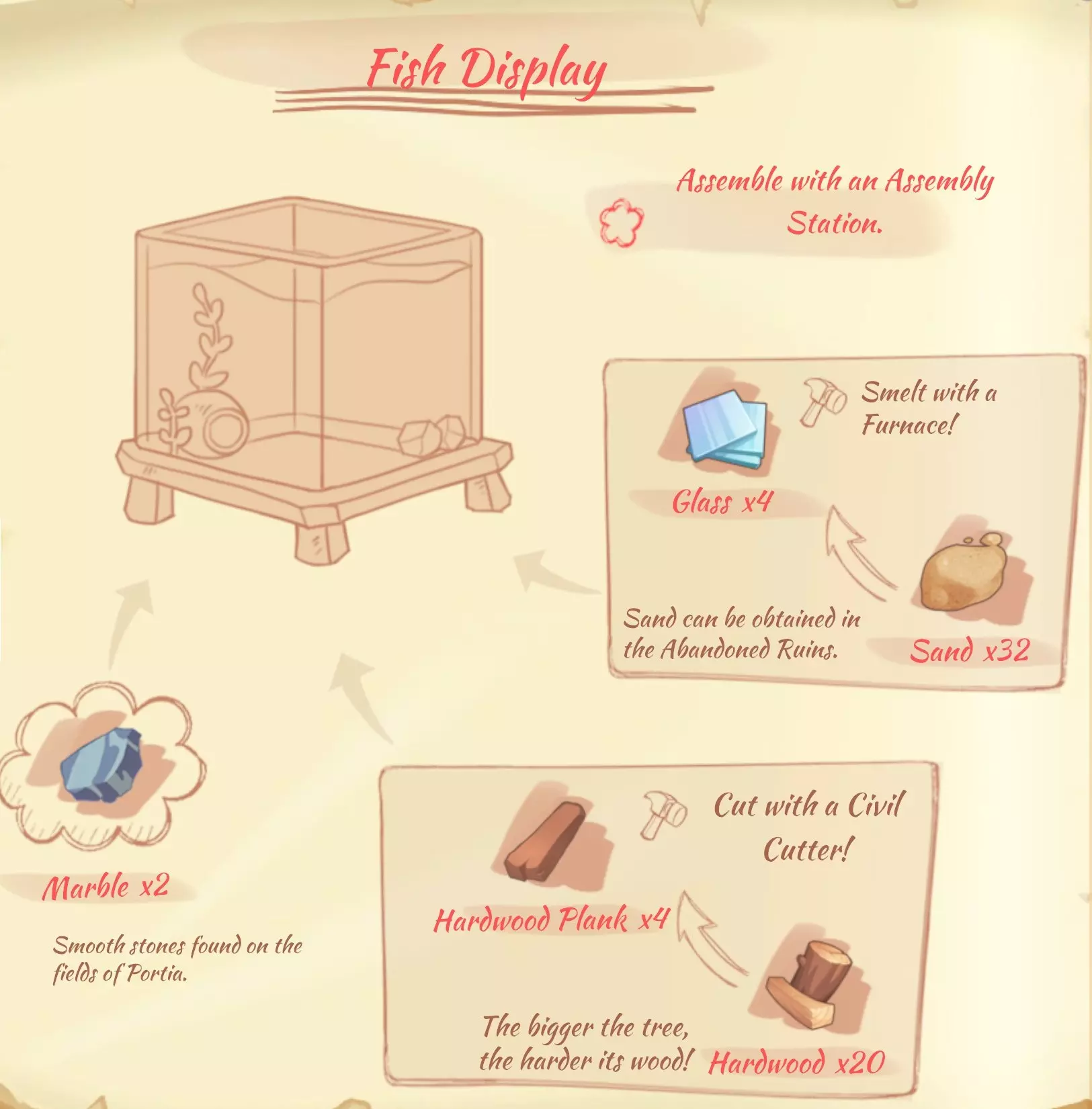 【鱼缸(鱼类展示)】:4块玻璃,2块大理石,4块坚固木板。