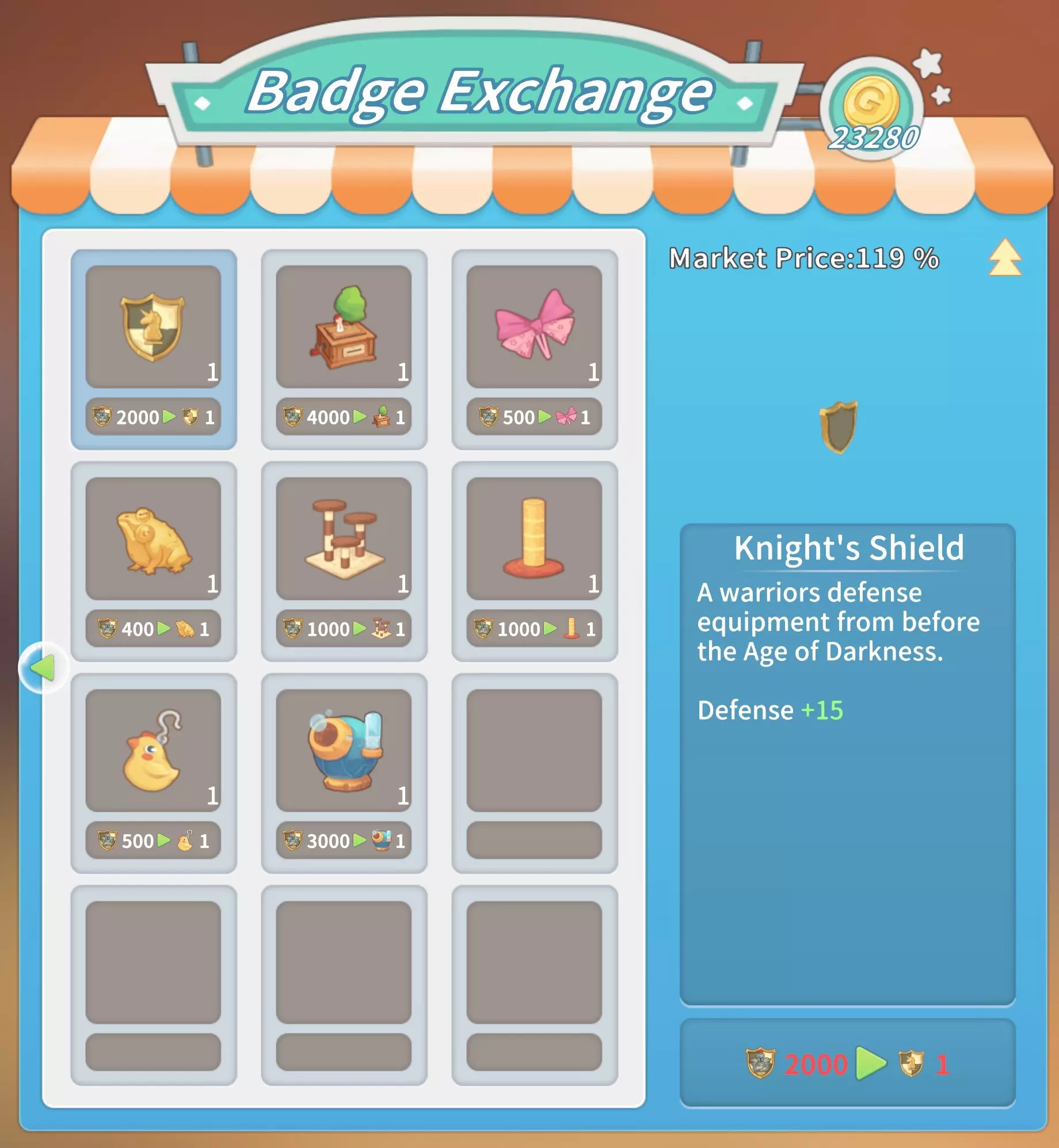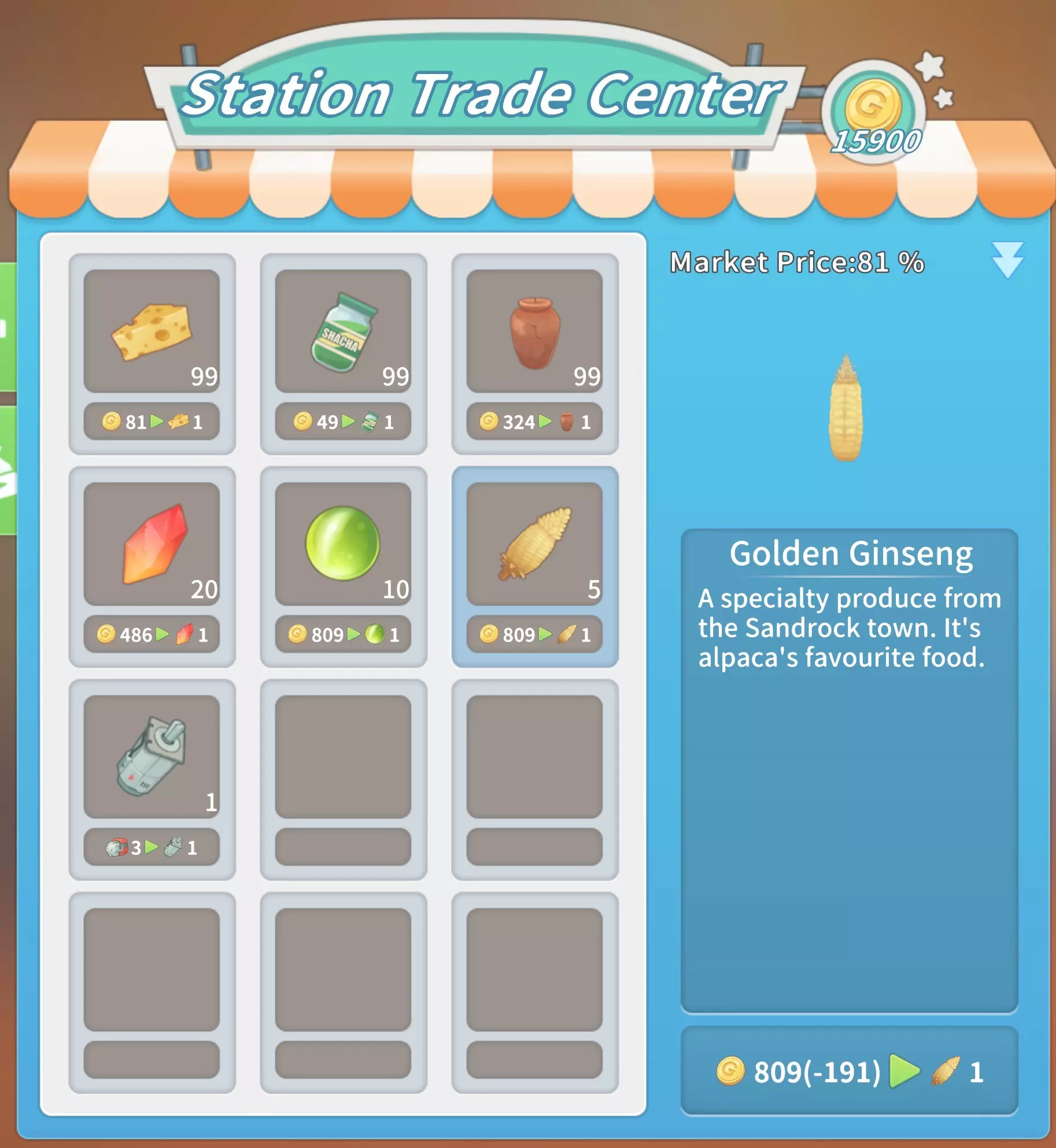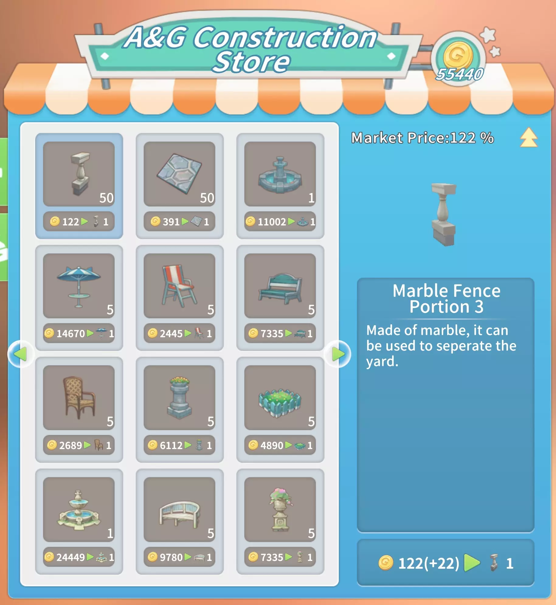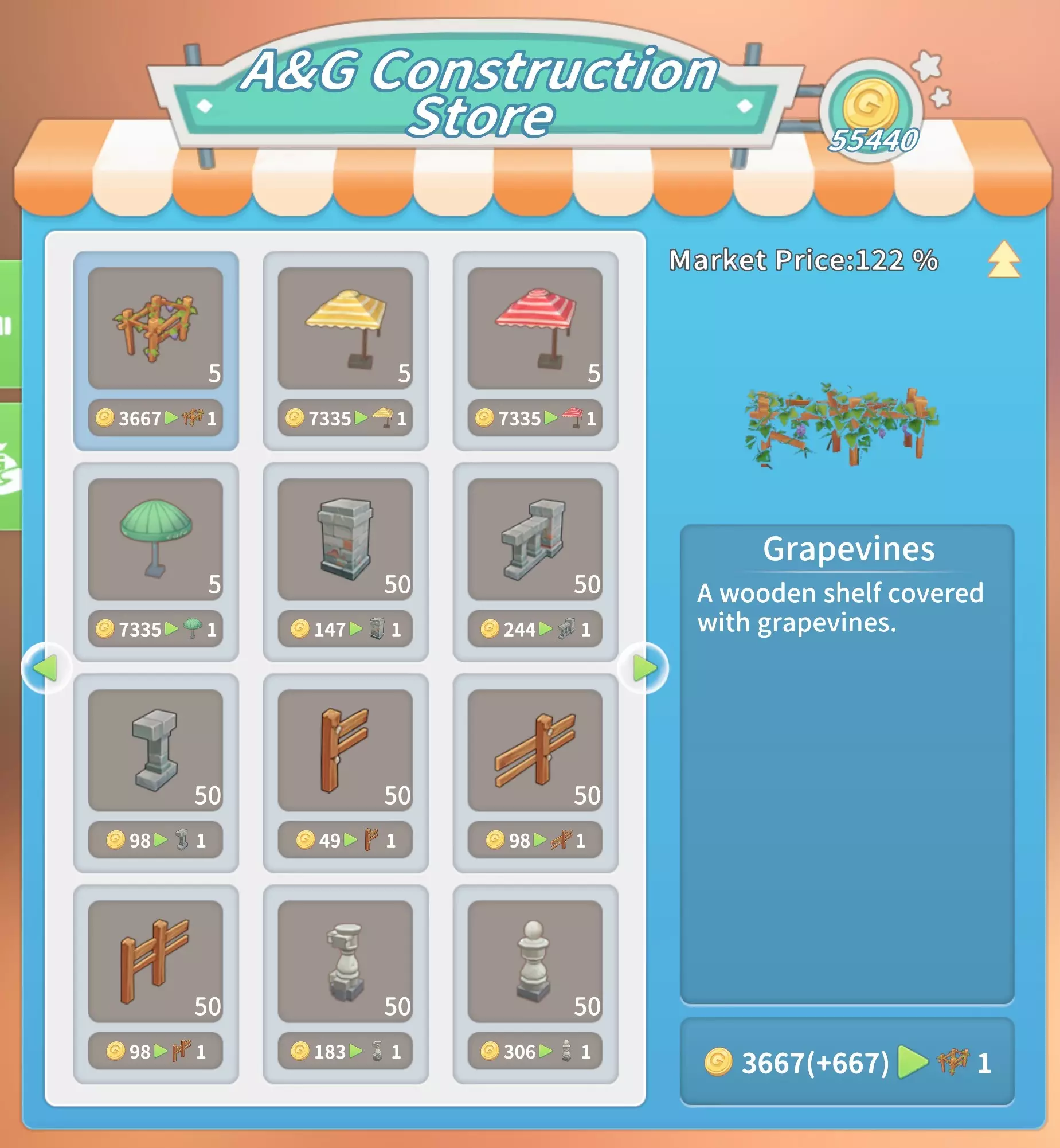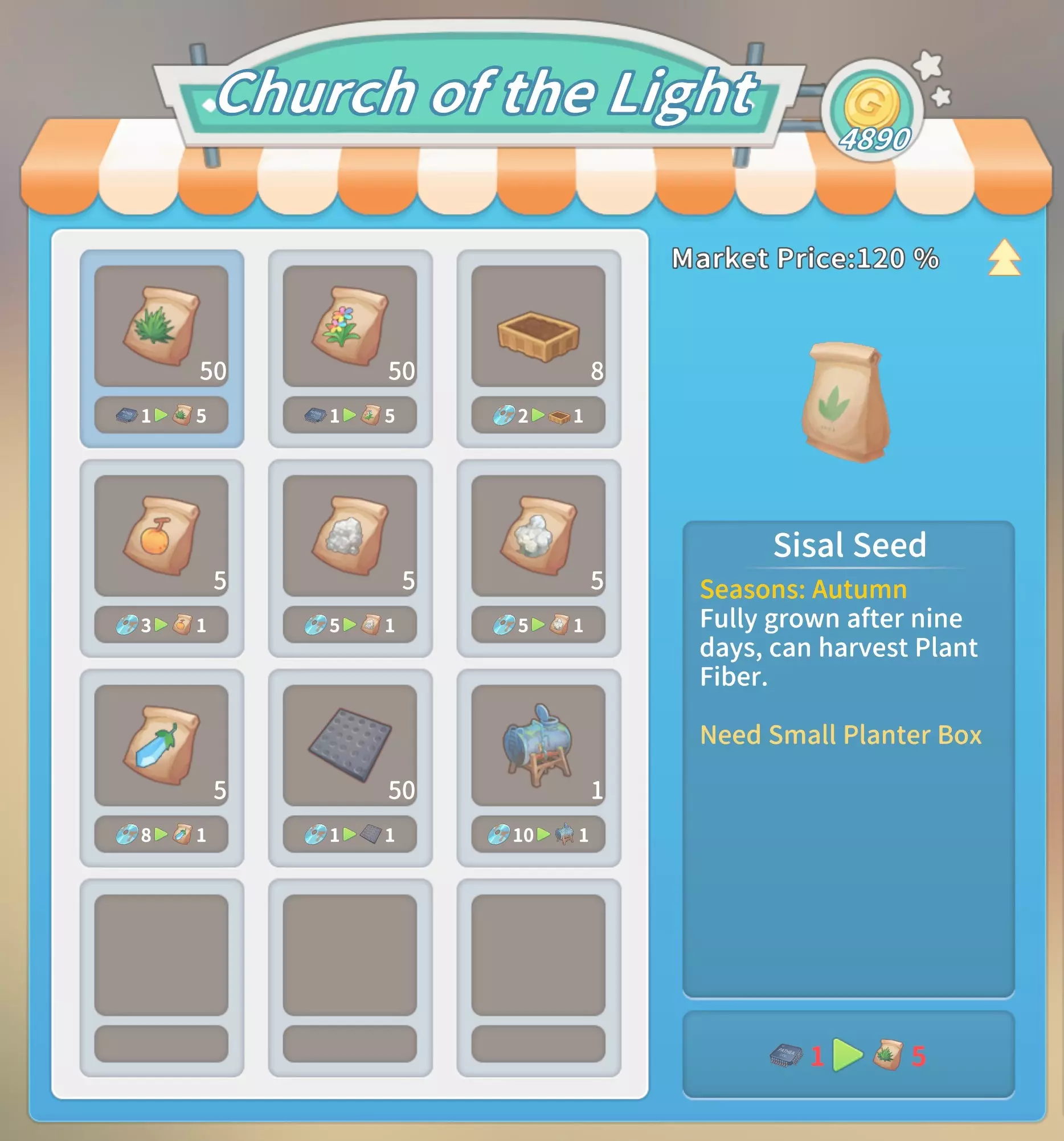 马厩:20块铁锭,20块石砖,5000金币。 石门:10块坚固木板,2根石柱,5份树脂,1000金币。 大理石门:2个大理石栅栏2,10块大理石板,10块硬化黏土,2500金币。 石栅栏:10根石柱,2个石栅栏,25根石栏杆,4000金币。 大理石栅栏:10个大理石栅栏1,2个大理石栅栏2,25个大理石栅栏3,8000金币。工厂(需建造海港后解锁):20个铝塑板,20块复合木板,2台现代发动机,50000金币。 交易 教堂商店(位于山上的教堂内,每周四在中央喷泉处)