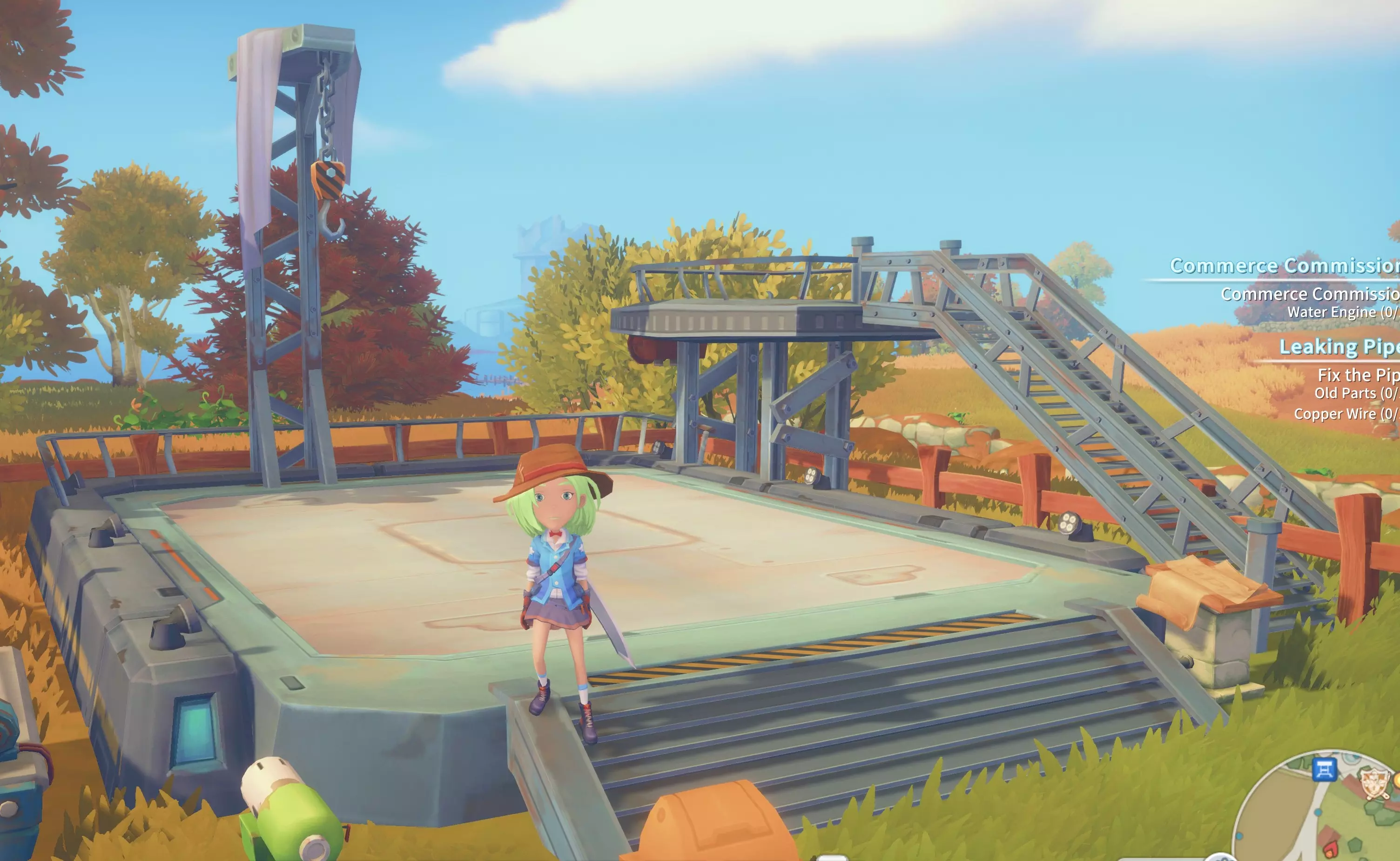 Вскоре мэр проведет совещание, на котором решат создать фальшивый искуственный интеллект чтобы приманить таинственного вора. Чертеж ИИ надо получить у робота Акка. Стройте очередную железную бабу, затем стройте ловушку для вора и устанавливайте все в руинах у горячих источников. Вор попадется в ловушку, но оказывается это не какой-то там хлюплый гопник, а самый настоящий кибер-рыцарь. В общем, он вас знатно раскидает и сбежит. Появление кибер-рыцаря серьезно взбудоражит общественность и в ваше захолустье прибудут ФСБшники из столицы. Новый персонаж Урсула сообщит вам главную цель - найти Искуственный Интеллект раньше кибер-рыцаря. Для этого нужен доступ в новую локацию и вам поручено проложить одну из двух дорог на выбор - восточную или западную. Имейте в виду, западная существенно сложнее в производстве. Вне зависимости от выбранного маршрута, для выполнения задания вам потребуется завод, который становится доступен для строительства только после завершения обустройства морского порта. Когда построите дорогу в мрачные болота, вас отправят в новые руины рядом с лесной фермой. В первую ходку вы найдете сломанный генератор, после чего Петра даст чертеж промышленного генератора. Со второго захода устанавливайте промышленный генератор и оформляйте по репе очередному боссу. Второстепенные квесты Meet and Greet Мэр предагает вам познакомиться с местными торговцами. Все они отмечены на карте, поздоровайтесь и соберите с них подарки. The Farmer Эмили дает вам чертеж грядки и семена. Постройте грядку на рабочем столе, удобрите почву, посадите семена и принесите Эмили урожай. После этого она попросит сделать ей три грядки. Furniture Maker Пол заказал три медных лезвия. Постройте шлифовальный станок и выполните заказ. The Fishing Rod Сделайте удочку новичка на рабочем столе. Strange Lenses В заброшенных руинах вы наткнетесь на странные линзы, отнесите их в исследовательский центр. На следующий день Мерлин отдаст вам очки для дальтоников. Очки надо отдать парикмахеру Санве. Fixing the Fence Запилите на циркулярке 5 деревянных досок и принесите к Лесной Ферме. Umbrellas Are Important Марс попросит принести ему 20 игл. Иглы выпадают из морских ежей у реки недалеко от дома. За выполнение получите рецепт зонта для рабочего стола. A New Friend Полли просит найти собаку. Спросите у Арло, он скажет, что слышал лай в Разрушенных Пустошах. Чешите туда, собака в провале у озера. Поговорите с Полли, она предложить покормить щенка собачьей едой. Еду делаете в блендере. Возвращайтесь в Пустоши, кормите собаку и ведите к Полли. Isaac's Game Исаак просит сделать каменный стол и два каменных стула. Рабочий стол вам в помощь. Chicken Run От Эмили сбежали цыплята, поймайте четырех и поместите в клетку. Panbat Infestation На лесную ферму напали полчища пандамышей. Сходите в исследовательский центр, за 8 дисков они дадут вам чертежи бумбокса и граммафона. Я собрал бумбокс и врубил "Сектор Газа" летающим тварям! Сразу притихли. Saving the Tree Farm Ферме требуется оросительная система. Отдайте 6 дисков Петре в исследовательском центре, чтобы получить чертежи. Постройте водное колесо и водный двигатель, установите их рядом с фермой. После этого надо построить водное хранилище и четыре оросителя и снова установить все на ферме. Очень замороченый квест, но зато вам ежедневно будут прислыать разные виды древесины! The Debt Collectors Какие-то урки решил