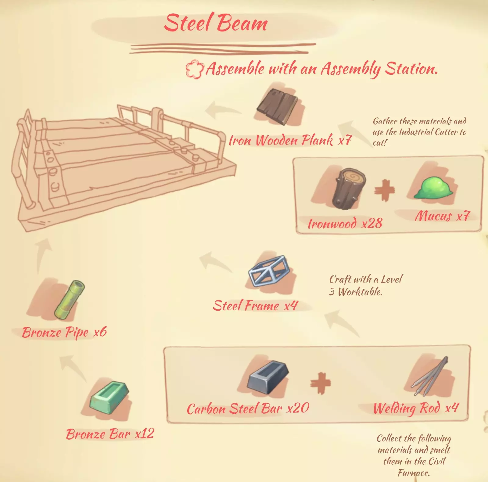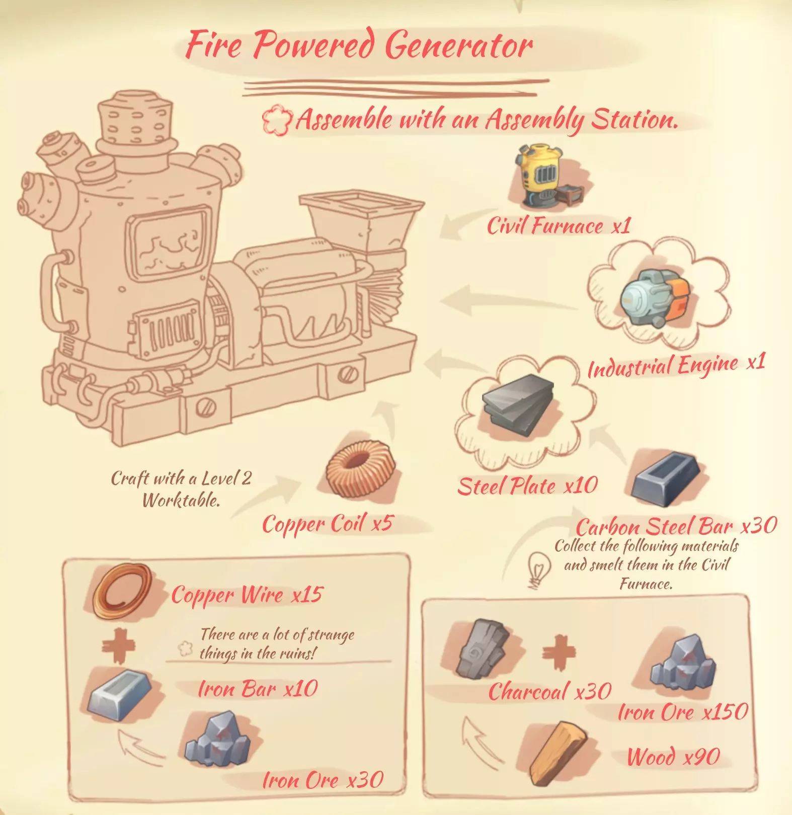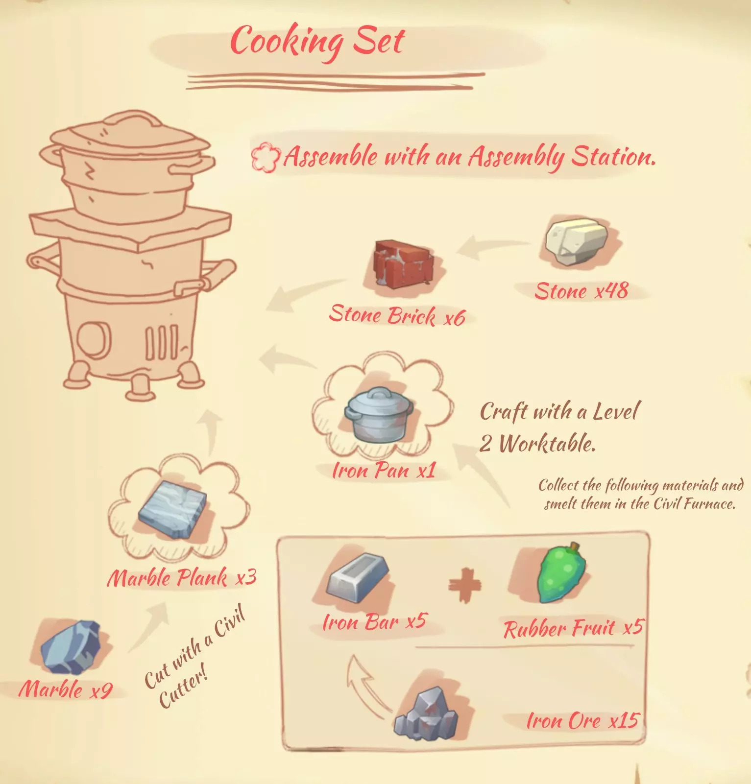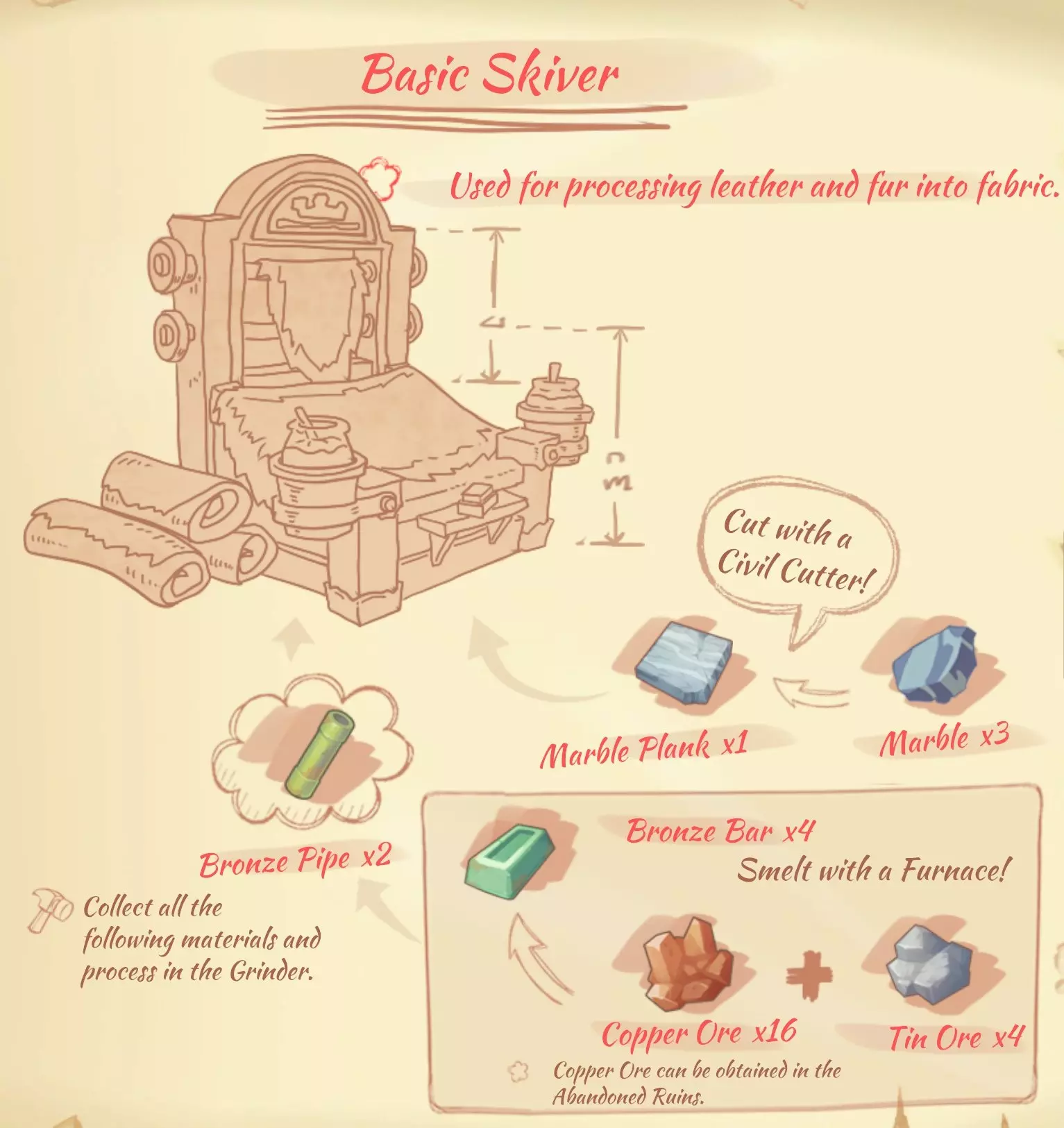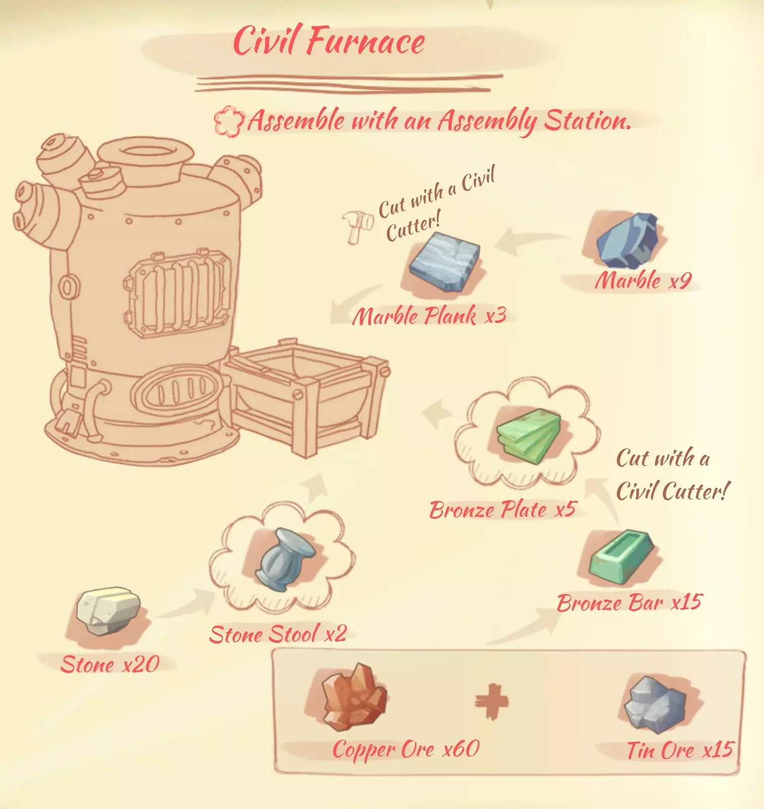 资源: 布料:4个野生茧,1个棉花。 毛皮:5个破旧毛皮。 纤维布:2个破旧毛皮,2个植物纤维。 绳子:1个棉花,1个植物纤维。 优质皮革:4个柔软毛皮,1个树液。 皮革:2个毛皮,2个植物纤维。 线:2个毛皮,2个树液。 防水布:10个纤维布,1个蜂蜡,2个黏液。 柔软毛皮:5个毛皮。 熔炉(Civil Furnace)