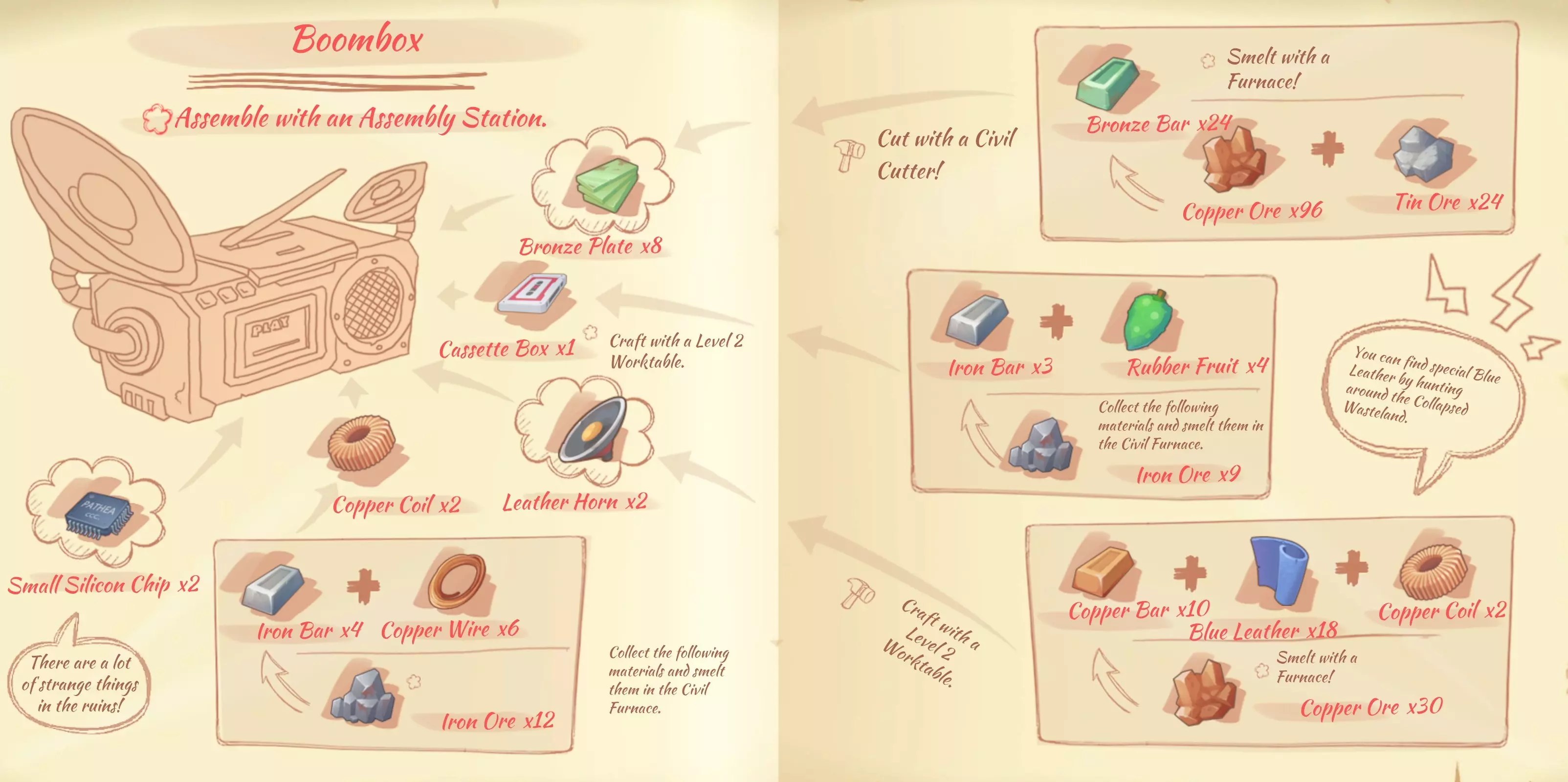 收音机(Boombox):8个青铜板,1个录音磁带,2个皮质扬声器,2个铜线圈,2个小型硅芯片。