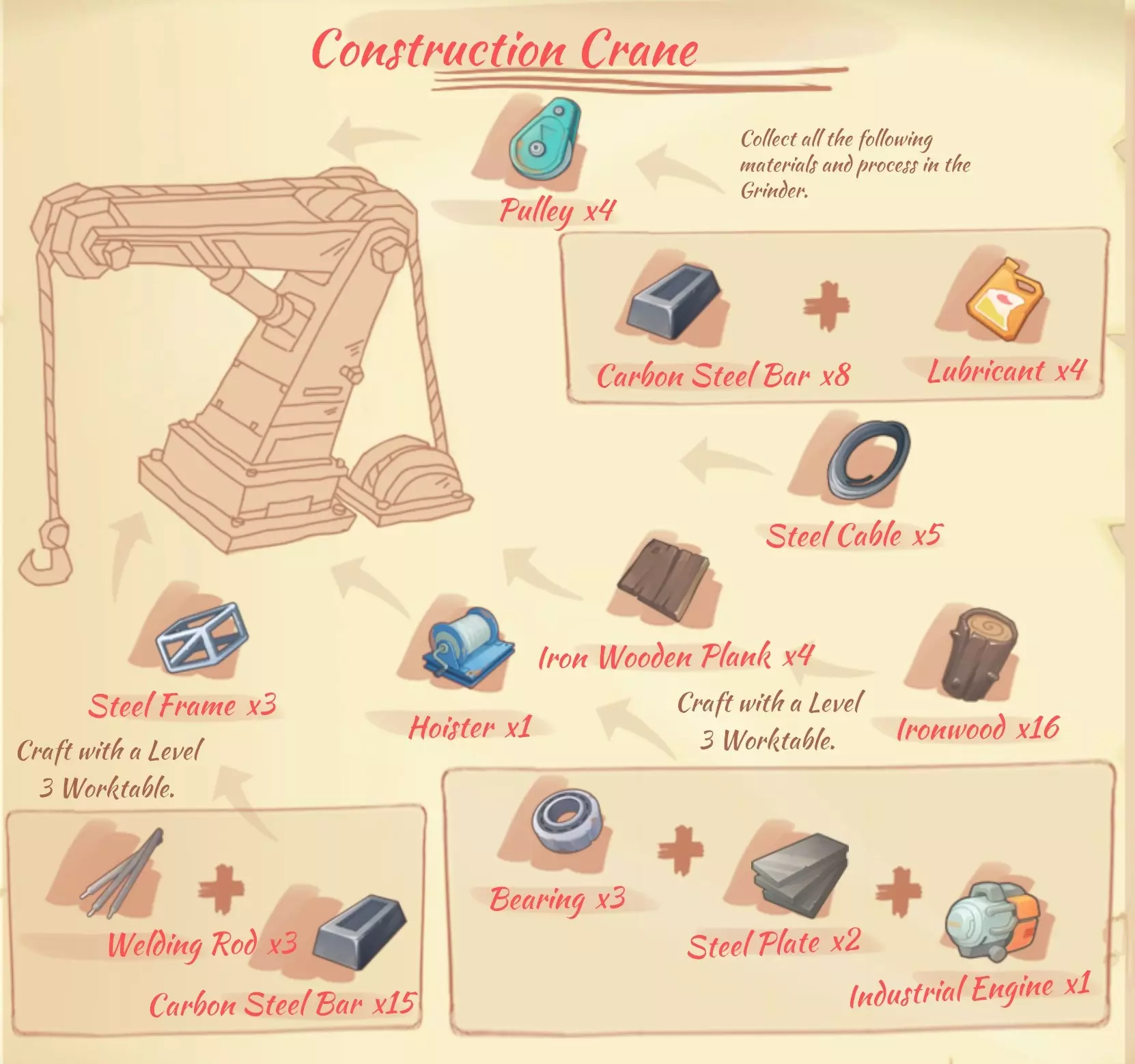 起重机(Construction crane):4个滑轮,5根钢缆,3个钢框架,1个绞车,4块铁木板材。