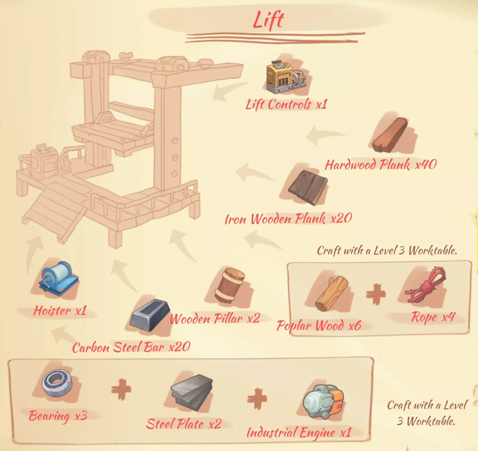 电梯(Lift):1个电梯控制面板,40块坚固木板,20块铁树木板,2根木柱,20个碳锭,1个绞盘。