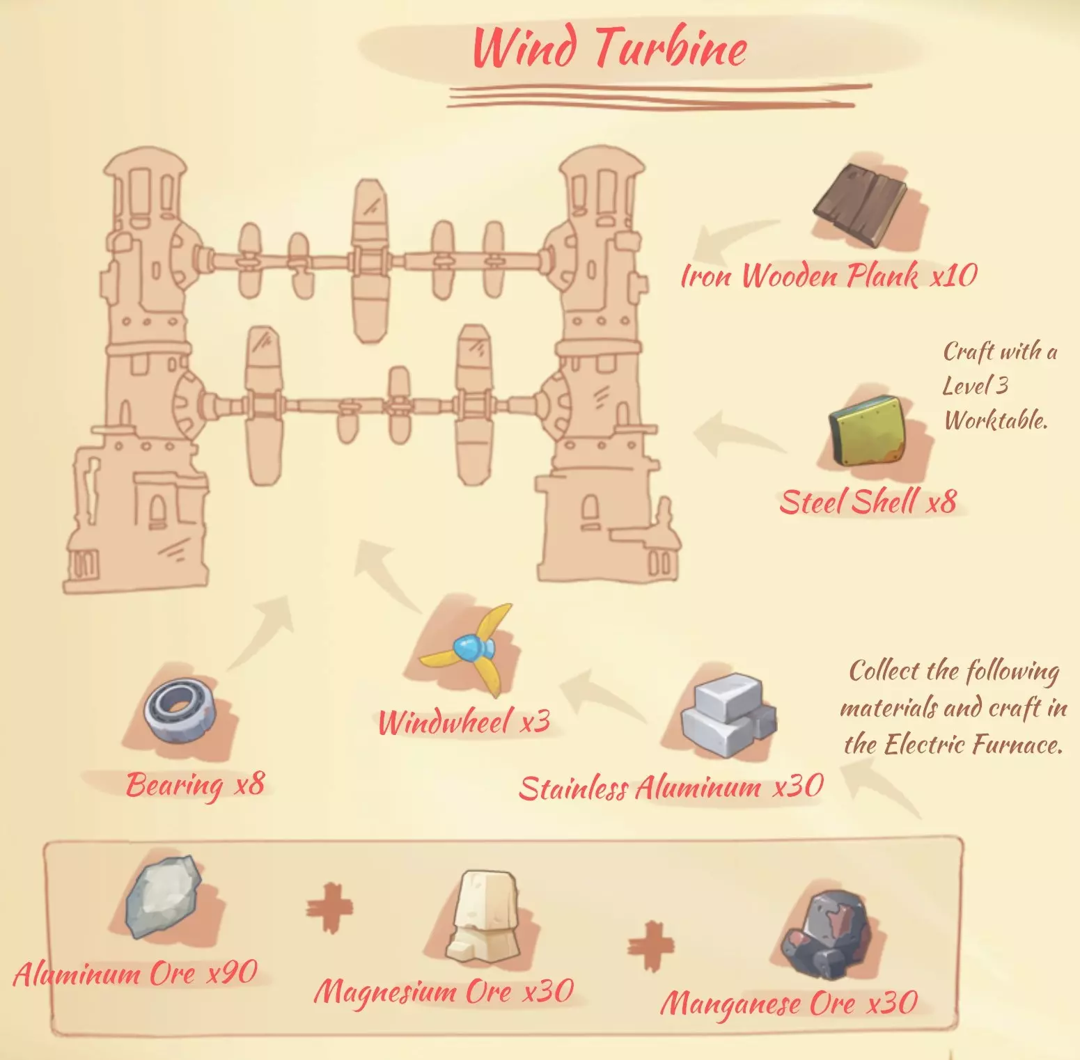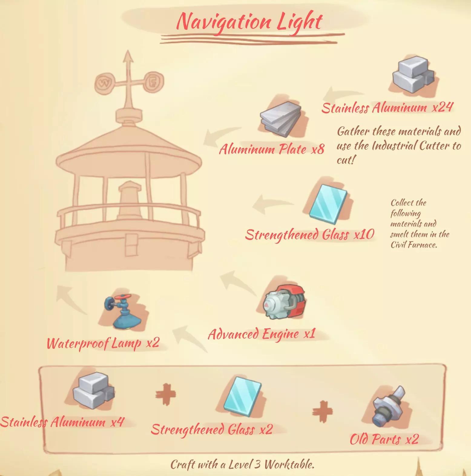资源: 硬铝:3个铝矿石,1个铜矿石,1个锰矿石。 防锈铝:3个铝矿石,1个镁矿石,1个锰矿石。 镁粉:3个镁矿石。 仅可在工厂生产: 高级复合板:5个硬木,1个铁木,1个紫色树脂。建造工坊 建造工坊位于贸易行会左侧。在这里可以升级基础建筑以及建造新建筑。 以下为基础造价,未计入与阿尔伯特的关系加成。 2级房屋:20块坚固木板、20块青铜锭、10000金币。 3级房屋:20块铁树木板、20块铝板、10块钢化玻璃、50000金币。2级工作台:20个木板,5个旧零件,2000金币。 3级工作台:30个坚固木板,30个旧零件,10000金币。 2级装配平台:20个铁锭,20个石砖,5000金币。