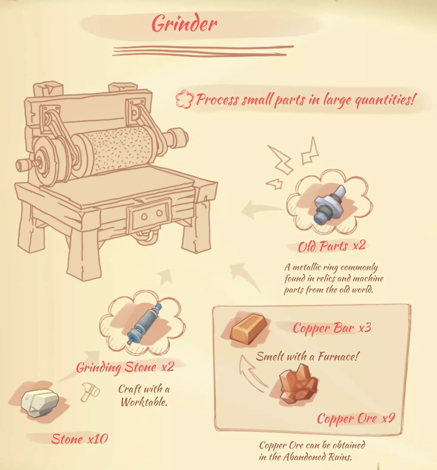 研磨机(Grinder):2个旧零件,2个磨石,3个铜锭。