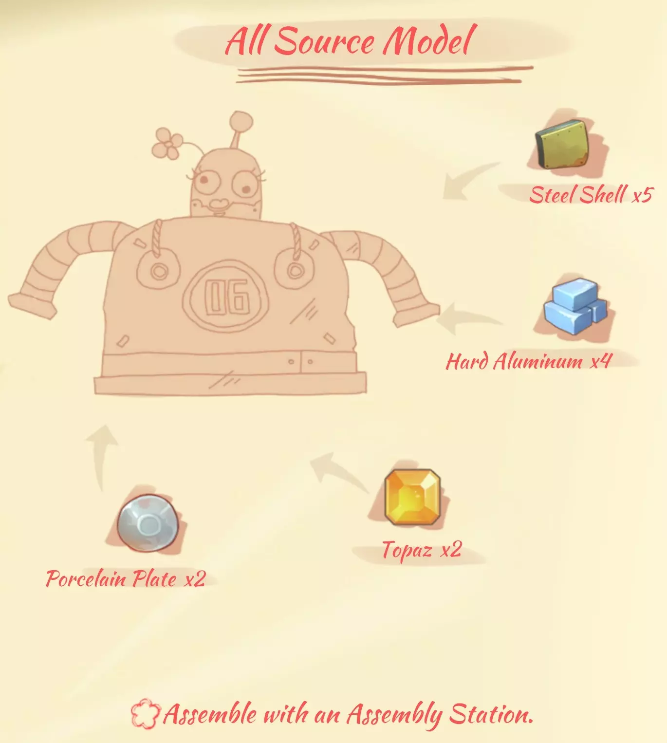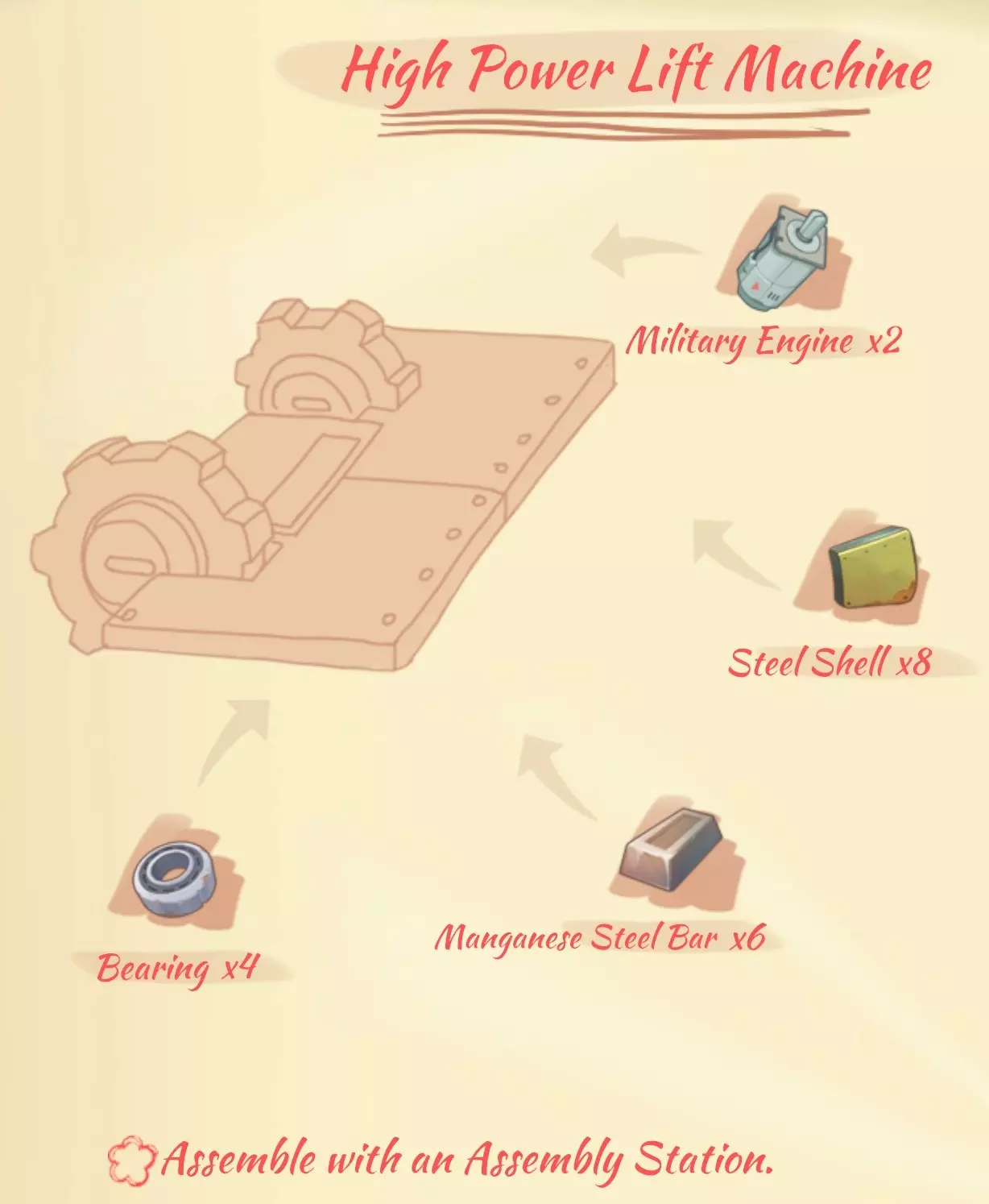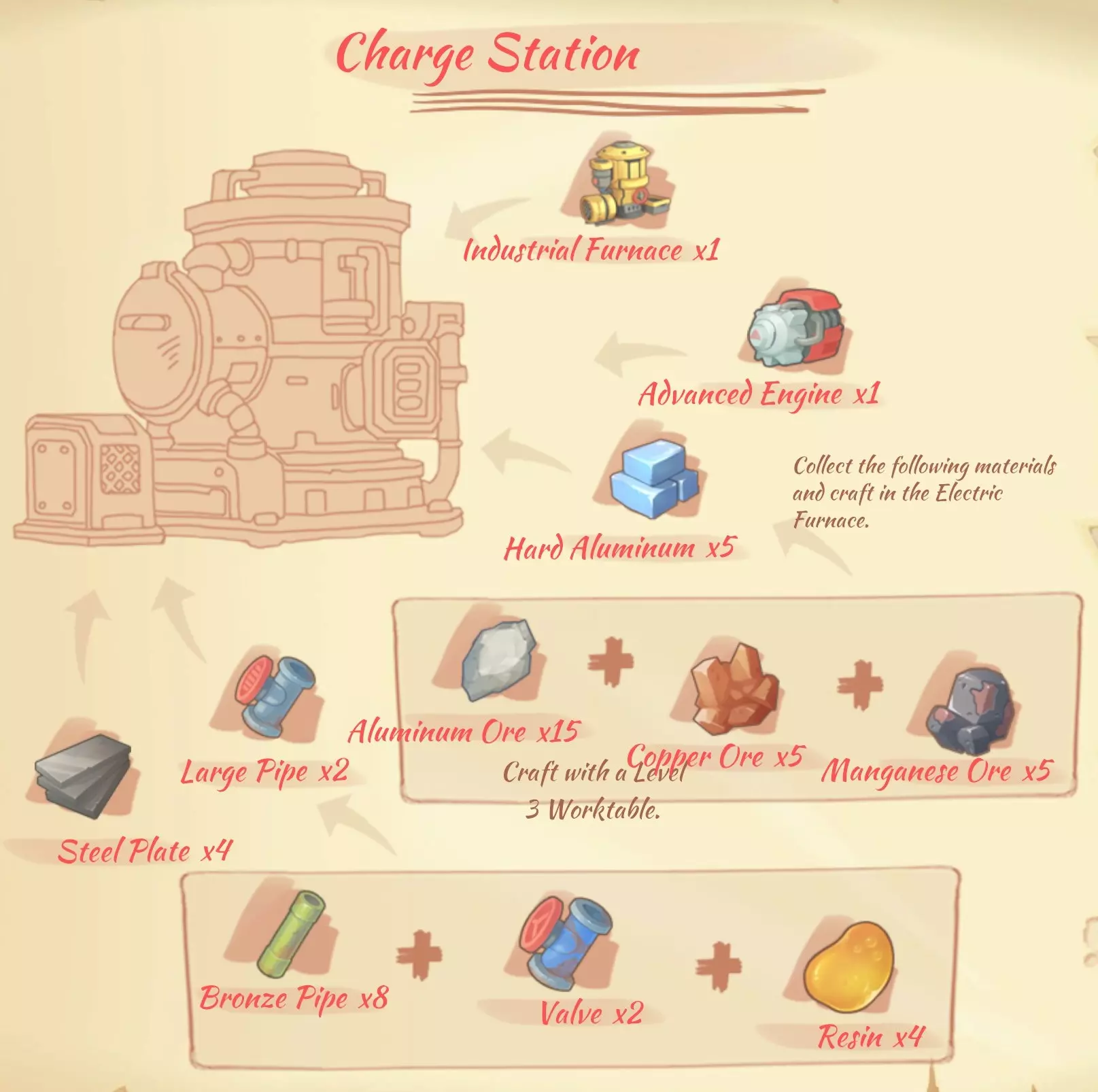 充电站(Charge station):1个工业熔炉,1个现代发动机,5个硬铝,2个大管道,4个钢板。