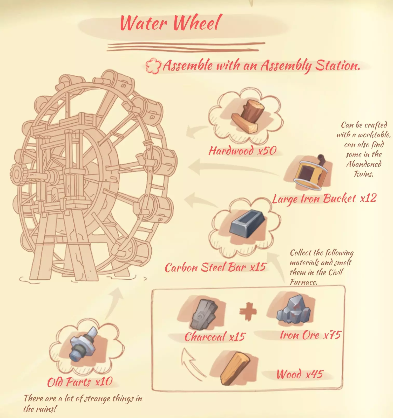 水轮(Water Wheel):50个硬木,12个大铁桶,15个碳锭,10个旧零件。