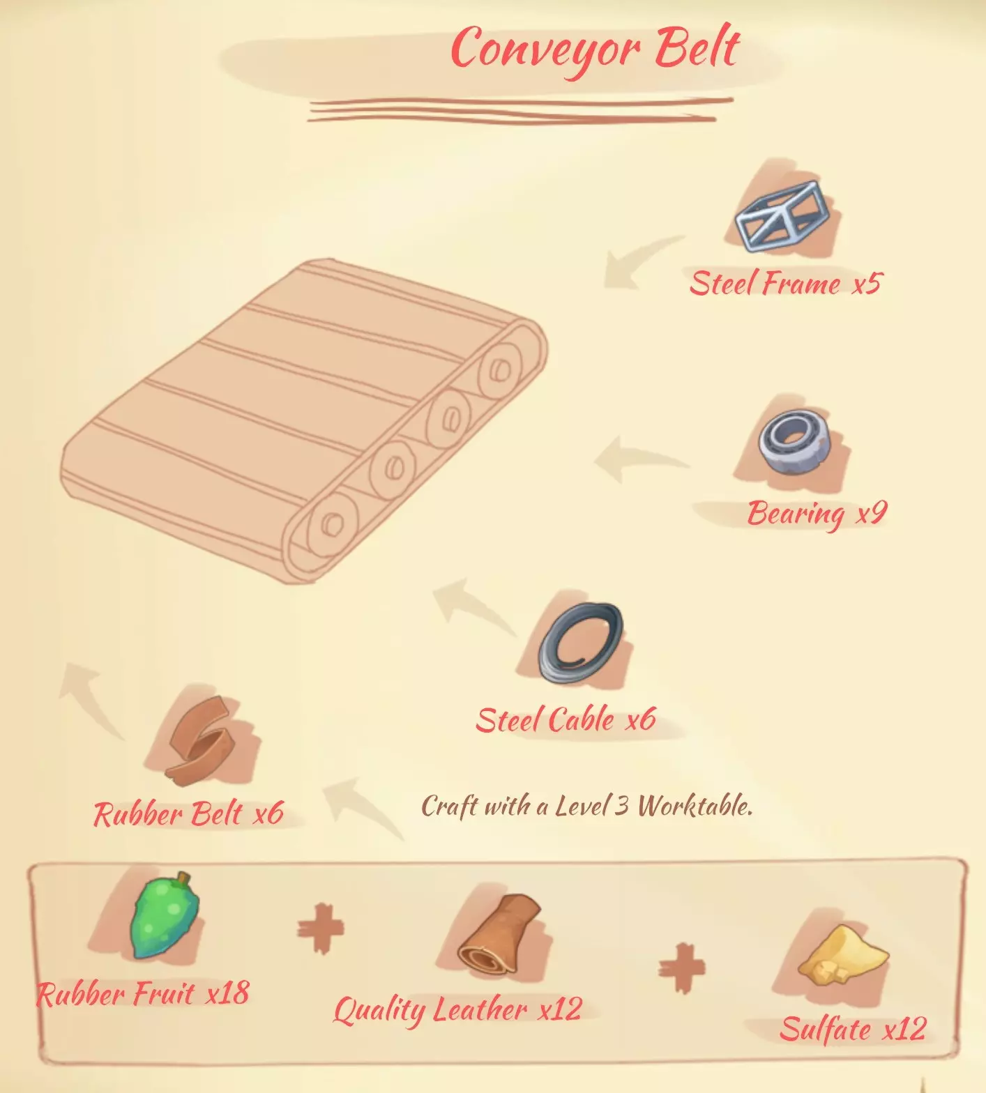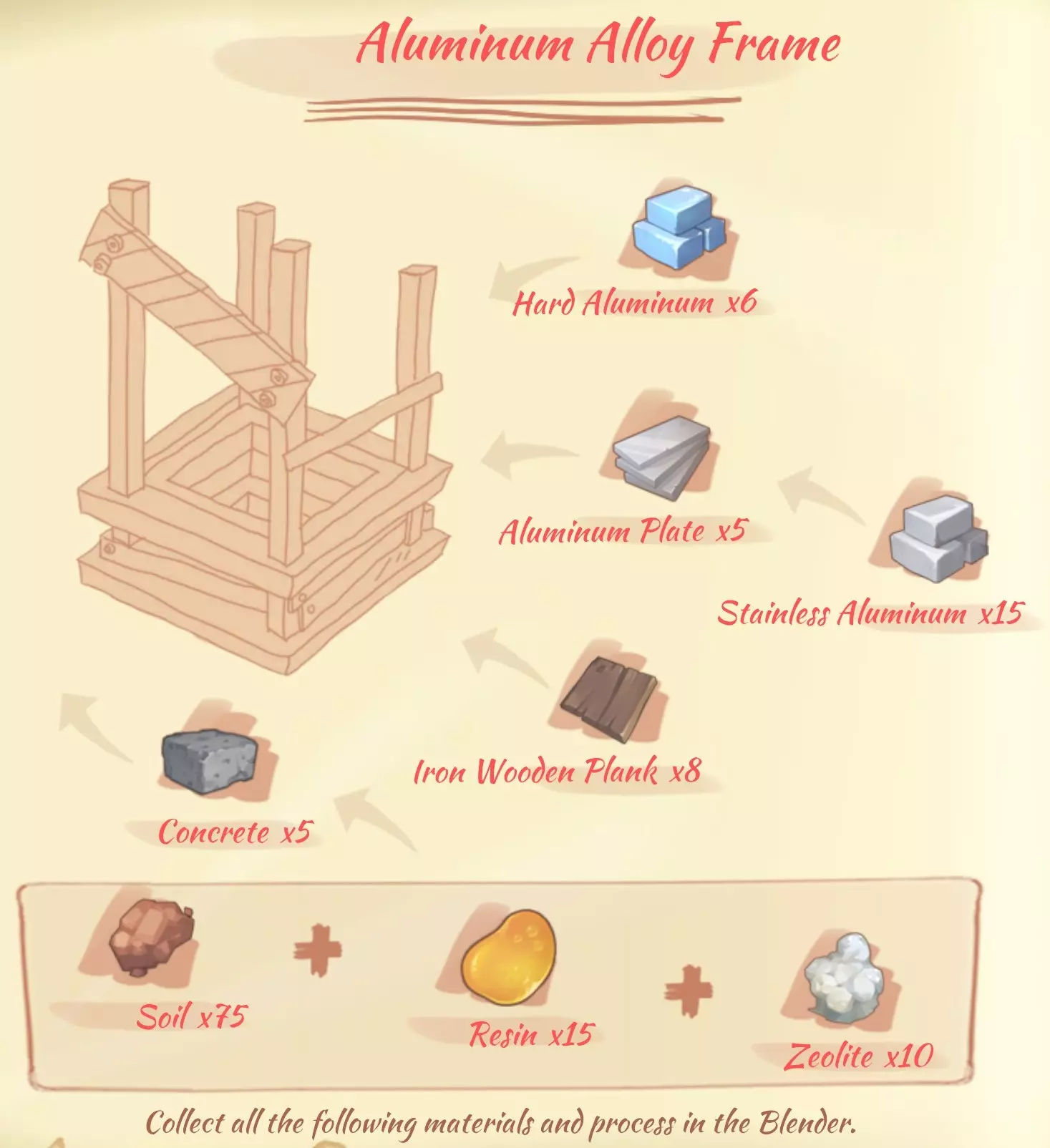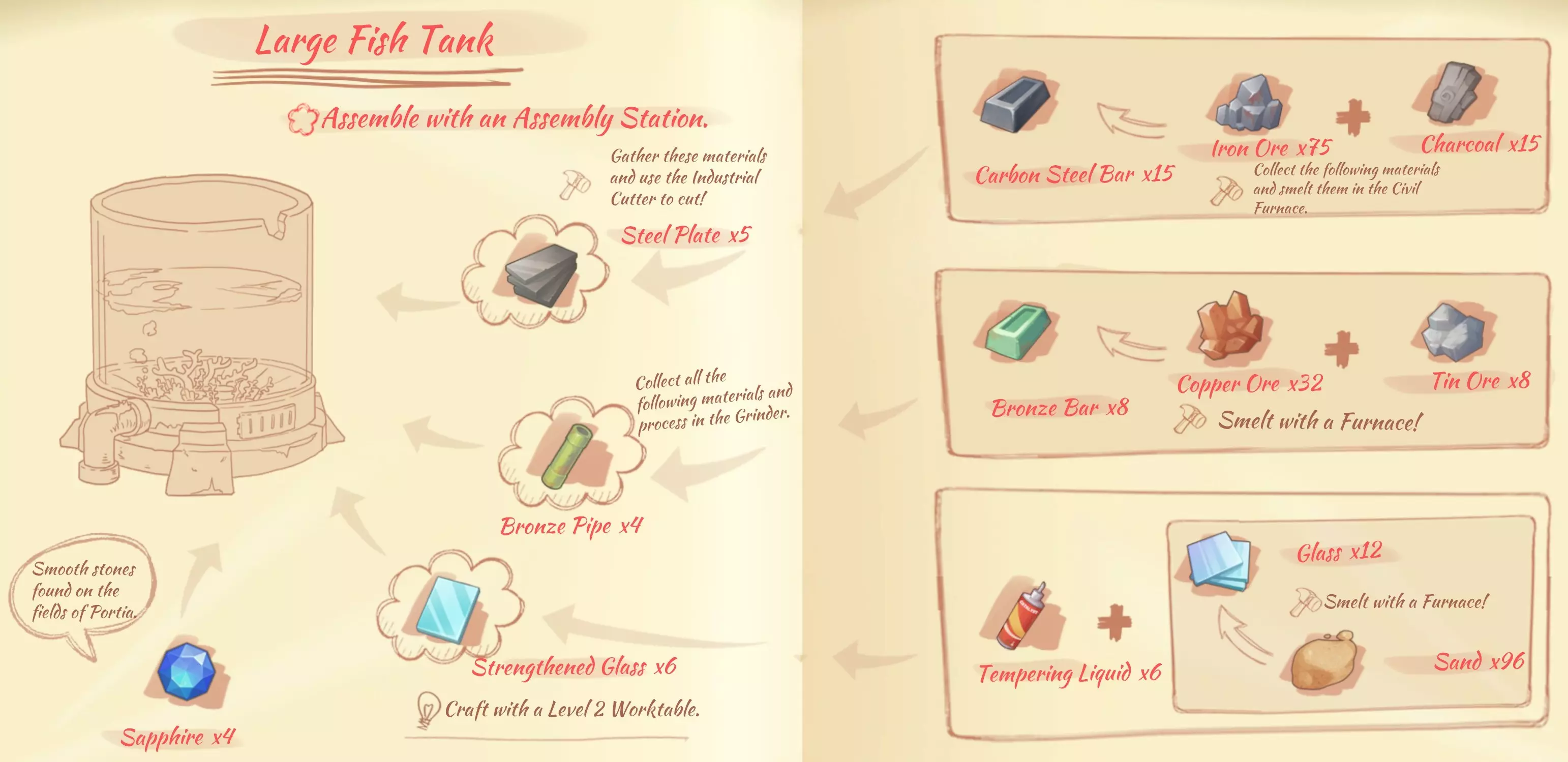 资源: 沙拉酱:5个鸡蛋,2份糖。 苹果汁:1个苹果。 柠檬汁:1个柠檬。 红茶:1份茶叶,1份树汁。 草药汁:2份草药。 奶茶:1份茶叶,1份牛奶。 10份面团:2份面粉,1份黏液。 肥料:2份动物骨头,1份黏液,2份粪便。 面粉:1份小麦。 树脂:5份树汁。 颜料:2朵彩虹花,1份硝石。 改良土壤:6份土壤,1份动物骨头。硬化黏土:12泥土,3树脂,2耐火液体。 混凝土:15泥土,3树脂,2沸石。 狗粮:4肉,3小麦,1盐。 工业熔炉
