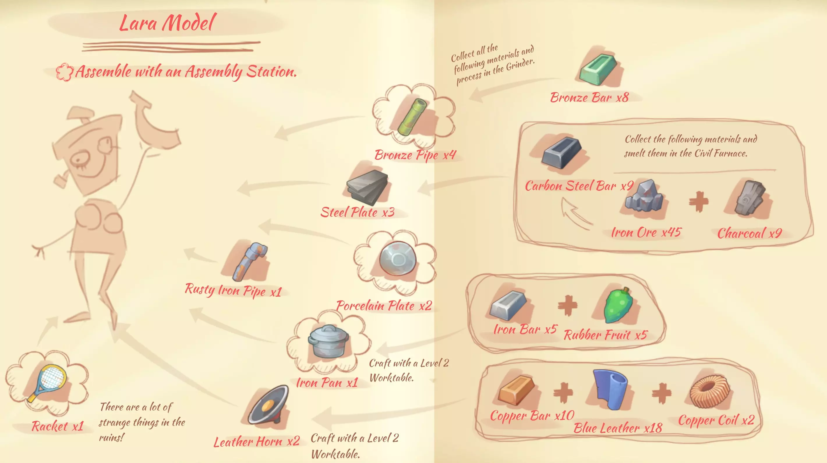 劳拉(模型劳拉):4个青铜管,3块钢板,2个瓷盘,1个铁锅,1个生锈的铁管(通过钓鱼获得),2个皮质扬声器,1个网球拍。