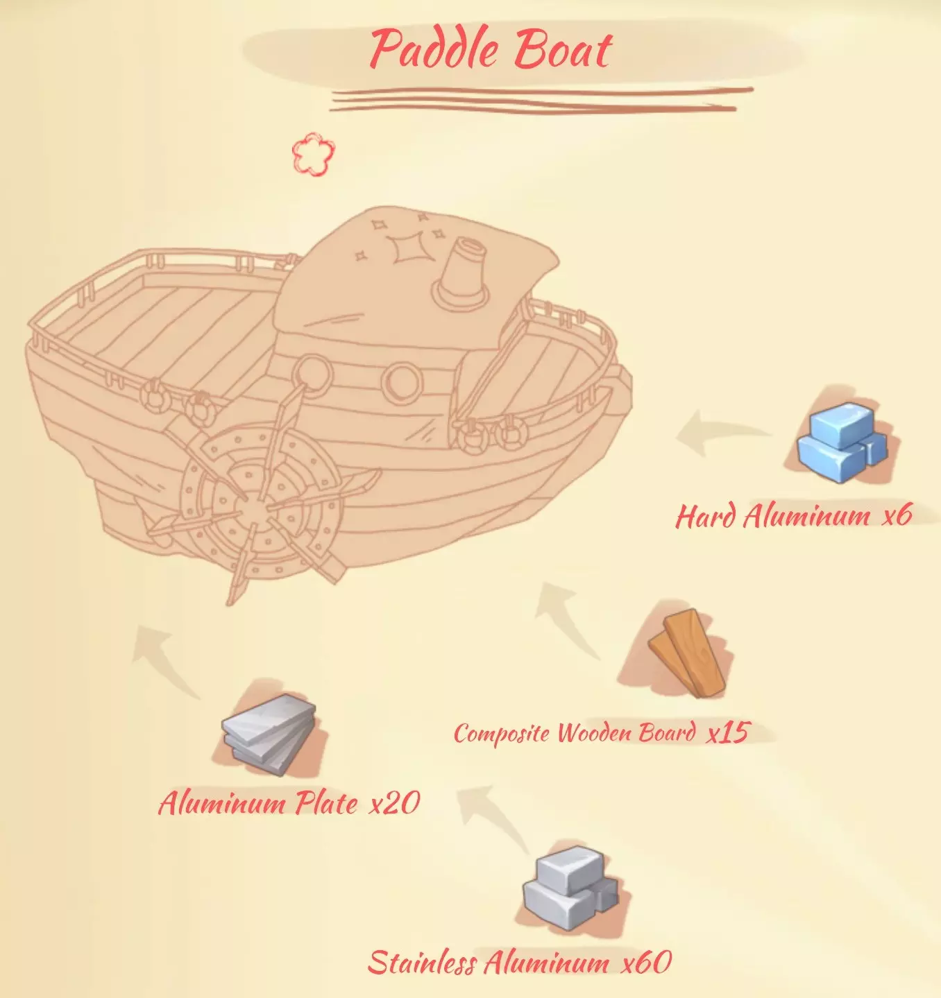 桨轮船:15个复合木板,6个硬铝,20个铝板。