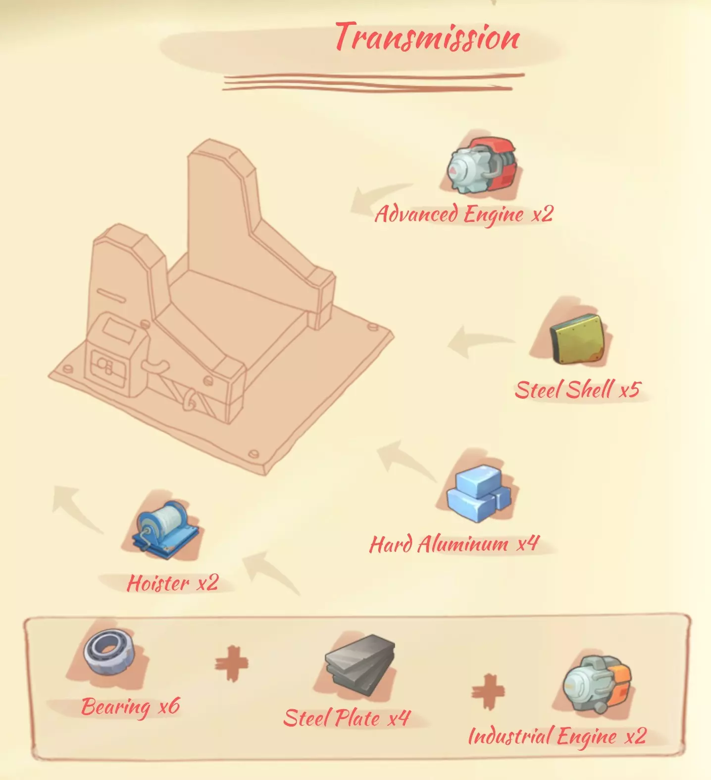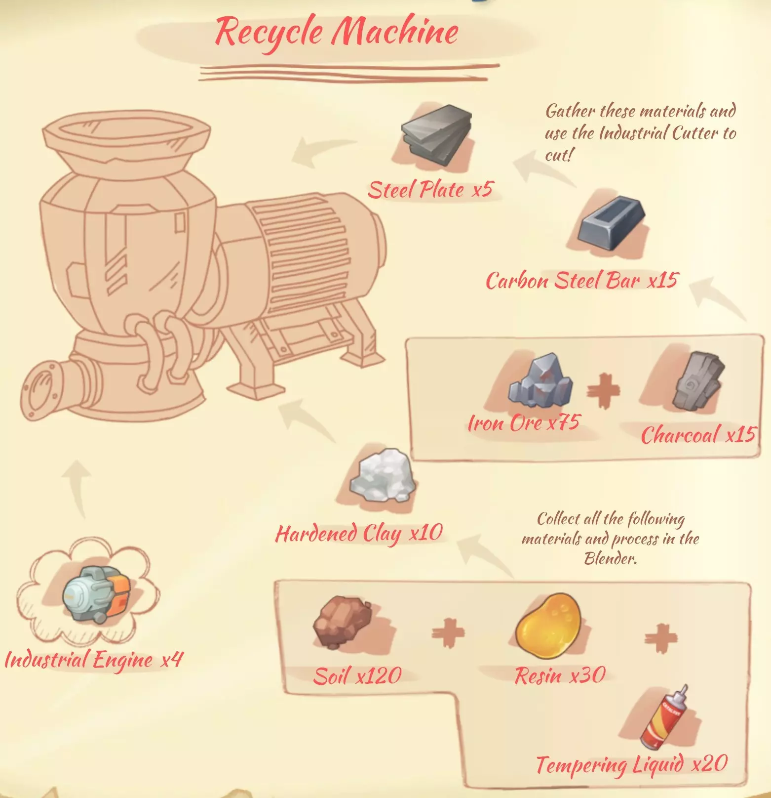 回收机(Recycle machine):5个钢板,10个硬化粘土,4个工业发动机。