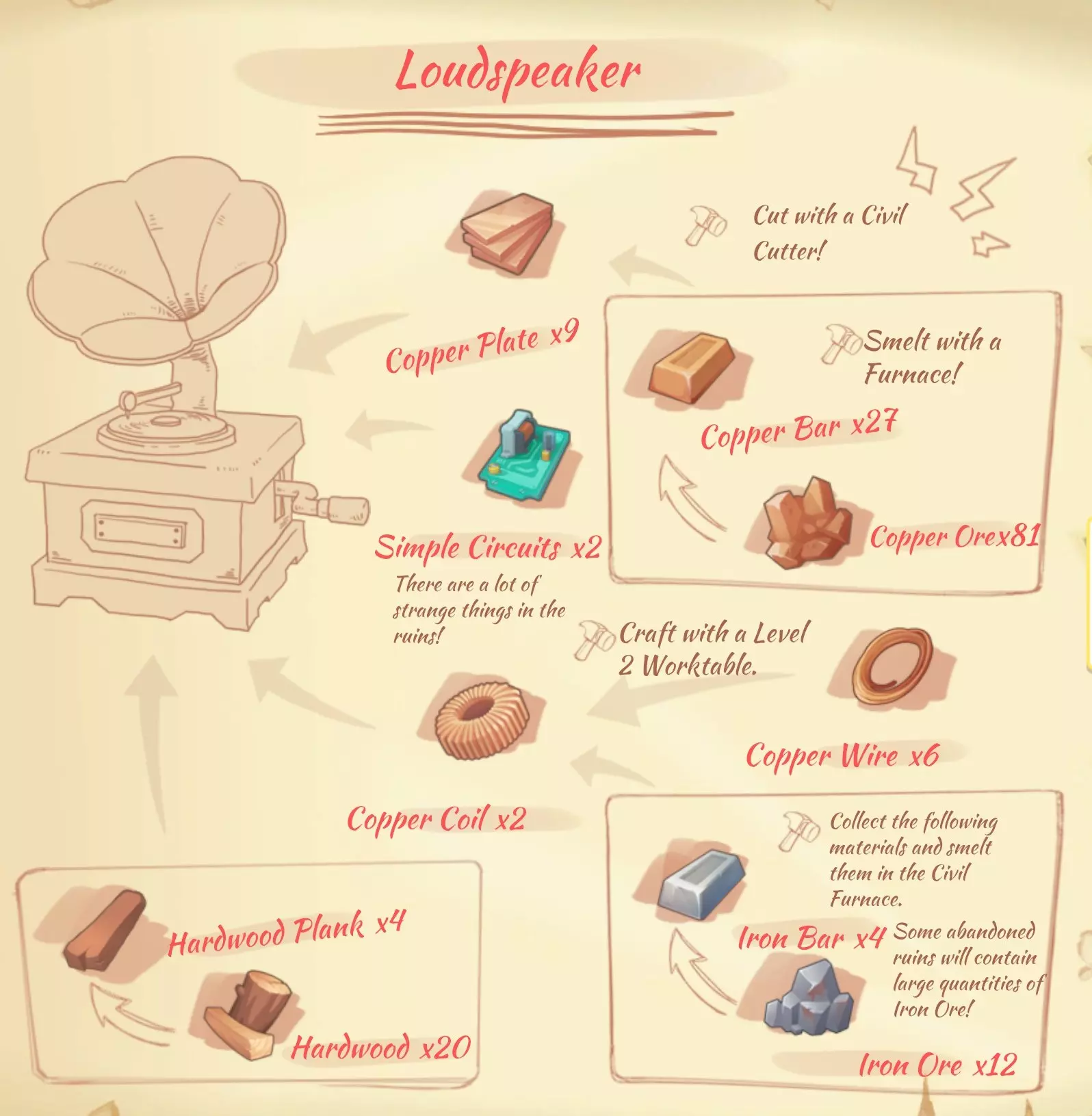 留声机(Loudspeaker):9个铜锭,2个普通电路板,2个铜线圈,4块坚固木板。
