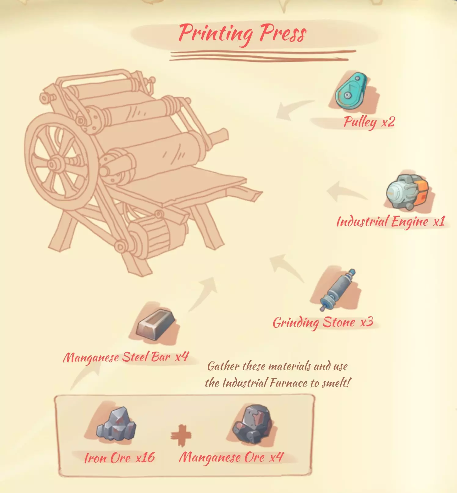 印刷机:2个滑轮,1个工业发动机,3个磨石,4个锰锭